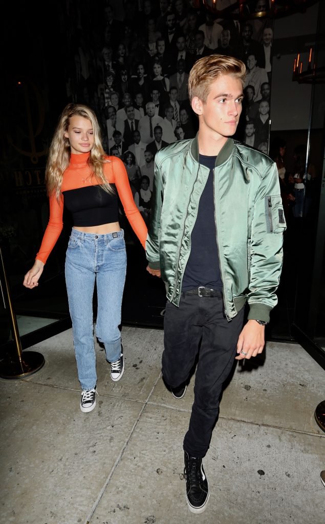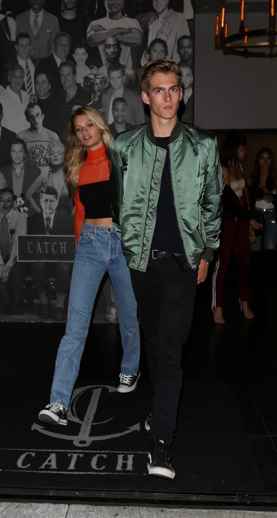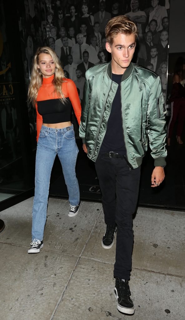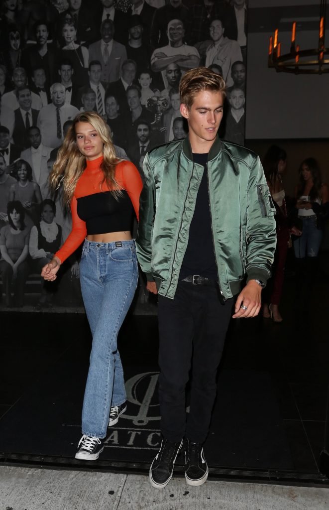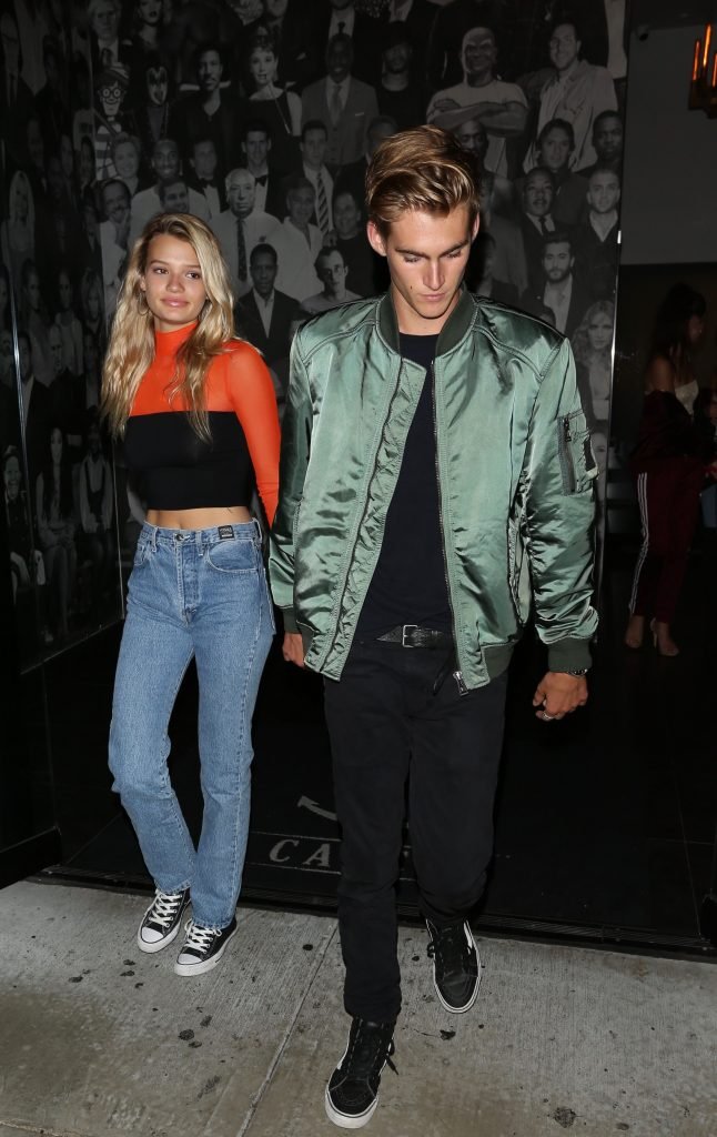 Кейли Кинг и Пресли Гербер держатся за руки, покидая ресторан Catch в Лос-Анджелесе, 25.08.2017. Кейли Кинг — американская модель. Возраст: 19.
