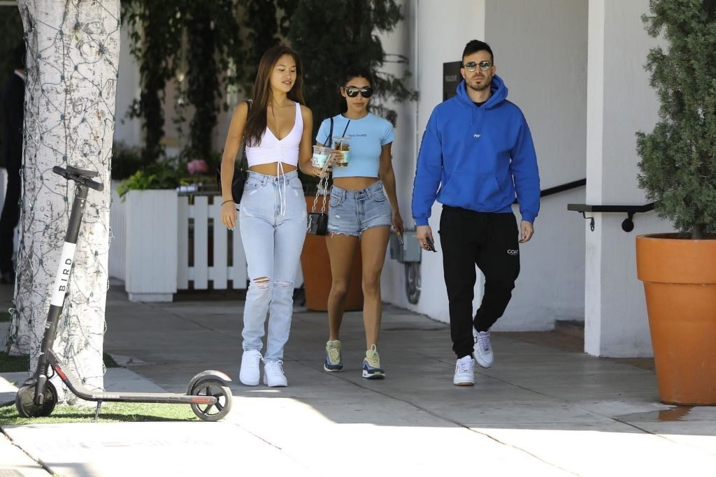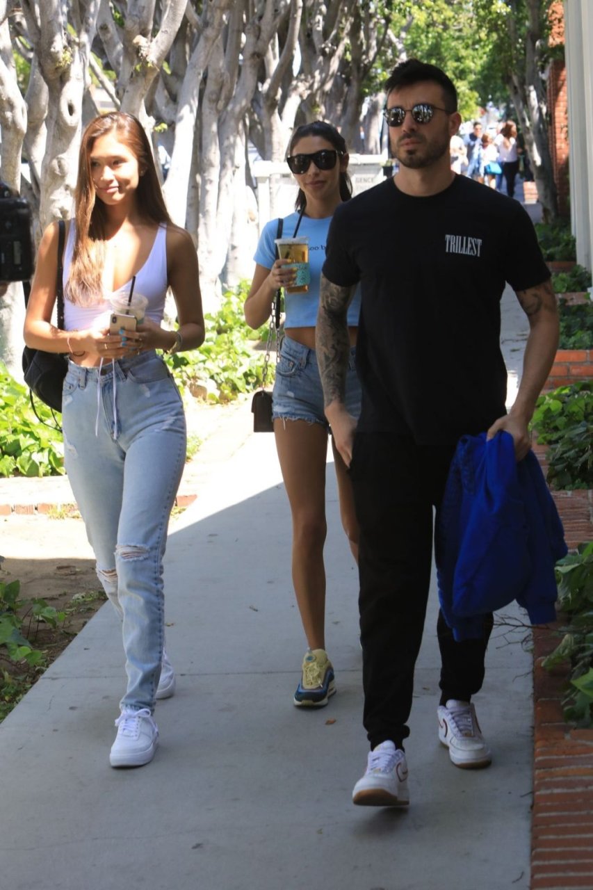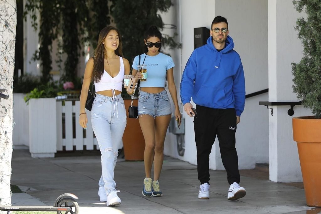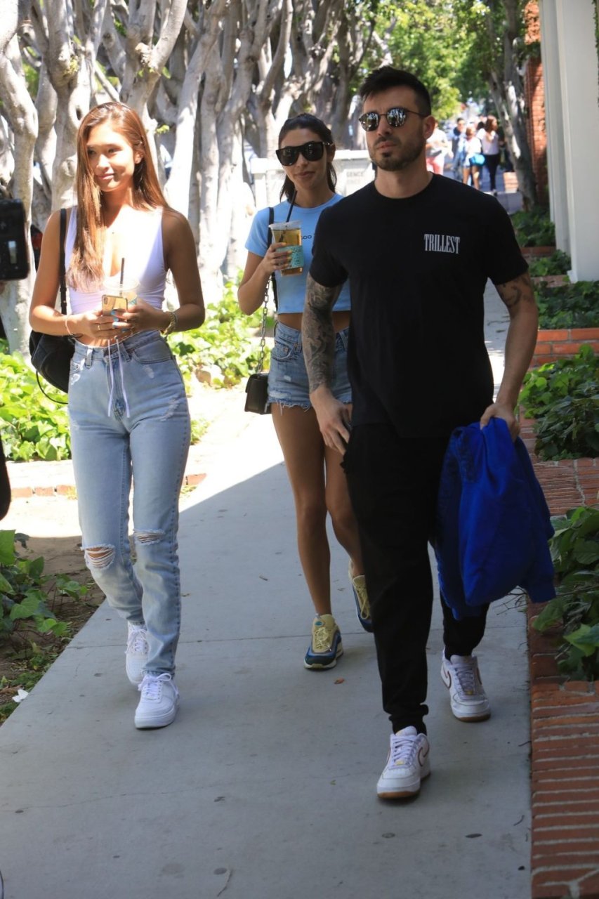 Модель и диджей Chantel Jeffries выглядит готовой к лету, выходя с друзьями в Лос-Анджелесе, 10.04.2019. Модель одета в голубой укороченный топ с надписью “Too Busy” и джинсовые шорты с высокой талией. Chantel дополняет образ очень желанными кроссовками Sean Wotherspoon Air Max 97/1 — идеальной летней обувью.