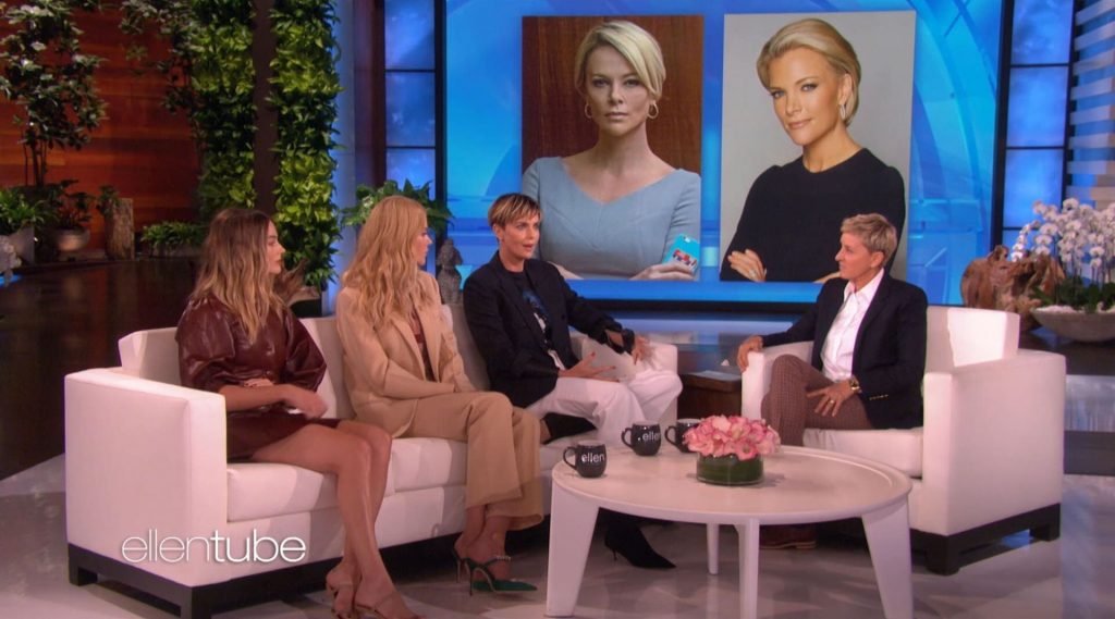 Весь актерский состав — это просто удивительная группа людей, но сегодня мы много говорили и обсуждали, как редко бывает, когда можно работать с таким количеством женщин, с которыми ты так восхищаешься, и не просто видеть их на красной дорожке, а иметь возможность работать вместе». Терон исполняет роль Мегин Келли в фильме, который рассказывает о предполагаемом сексуальном домогательстве бывшего председателя Fox News Роджера Эйлса. Эйлс умер в 2017 году в возрасте 77 лет.