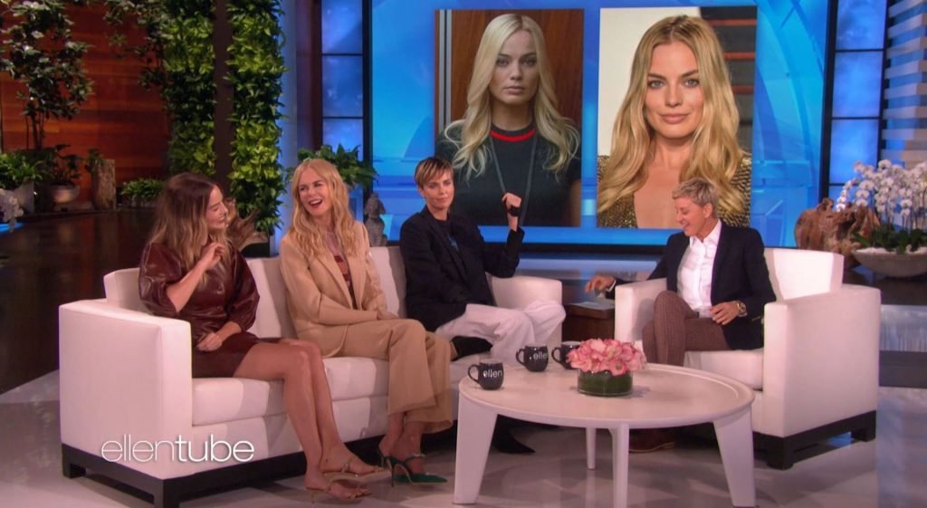 Трио появилось вместе в шоу Эллен, и Терон рассказала, как поняла, что проект «очень особенный». «Это был сценарий, который прислали в мою компанию с возможностью продюсирования и, возможно, моего участия в качестве актрисы», — сказала она Эллен. «Все в моей компании знали, что это невероятный подарок, потому что Чарльз Рэндалф написал невероятно мощный сценарий». О своих коллегах по съемочной группе Робби и Кидман Терон сказала с восторгом: «Этот опыт буквально стал для меня осуществлением мечты.