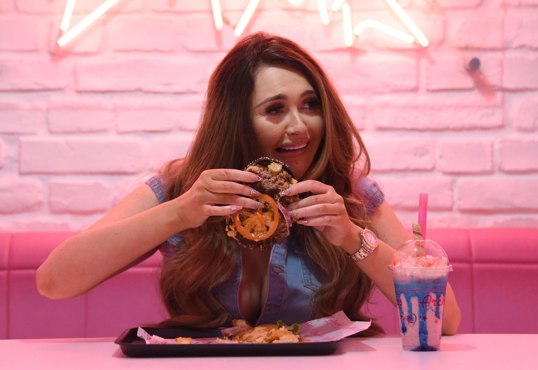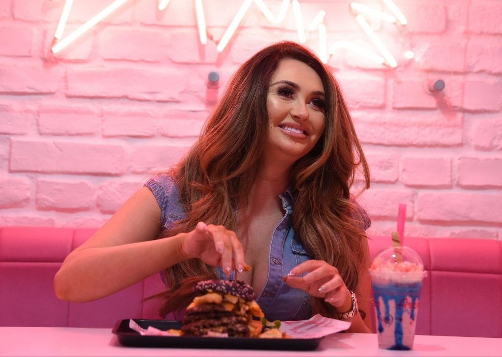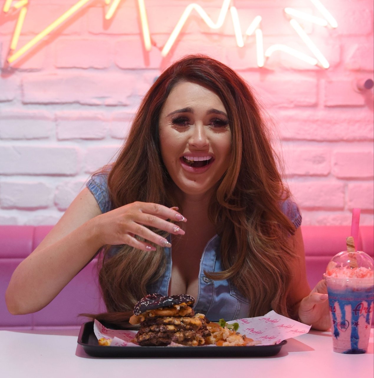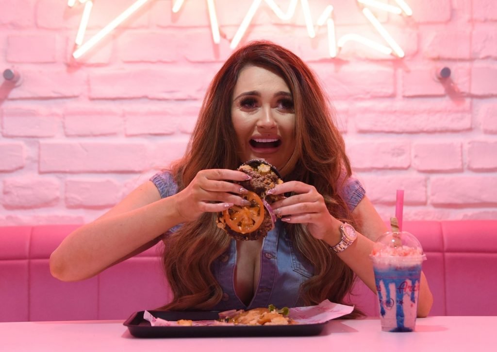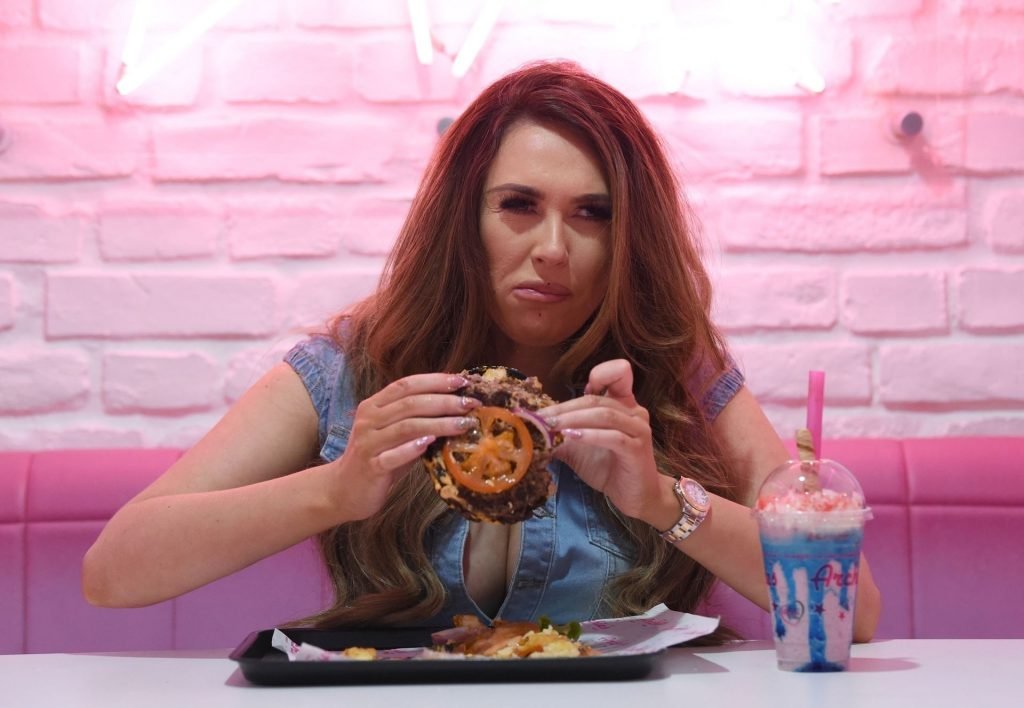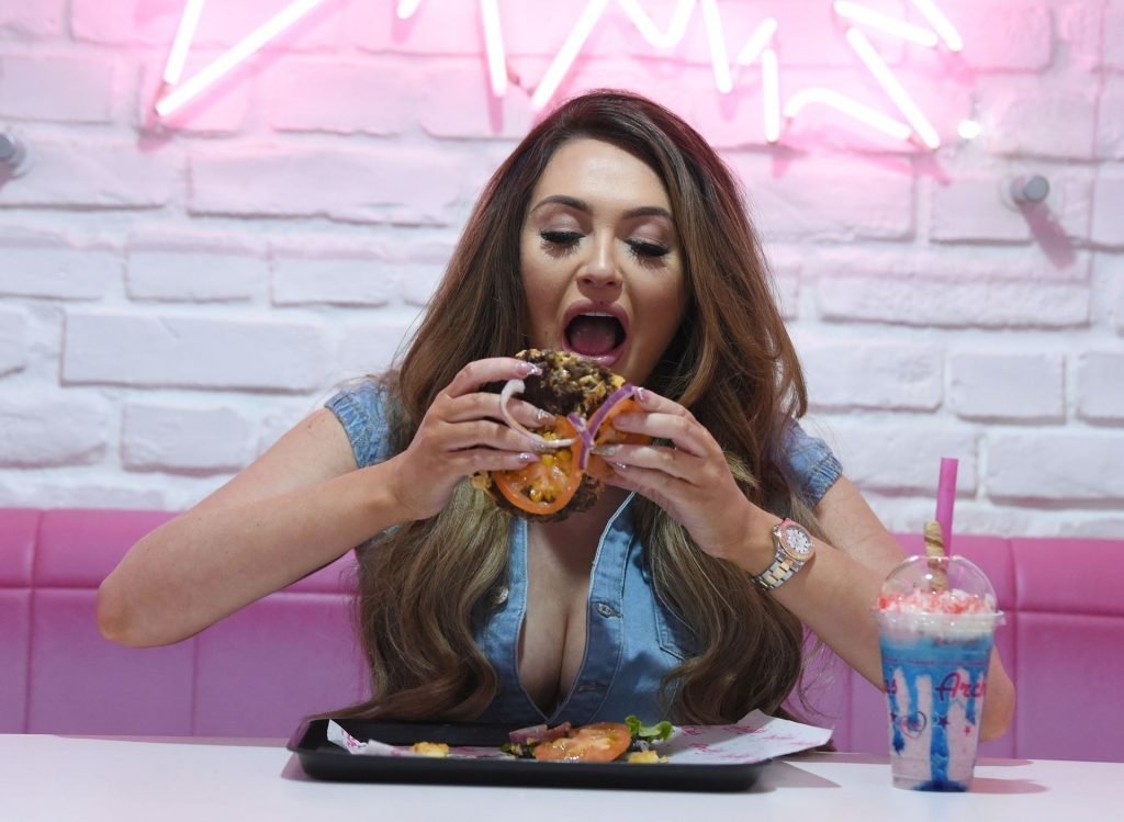 Звезда реалити Шарлотта Доусон наслаждается огромным бургером в баре Archie’s Burger and Milkshake после долгого дня на фотосессии fredafunk в Манчестере, 21.03.2019. Приятного аппетита!