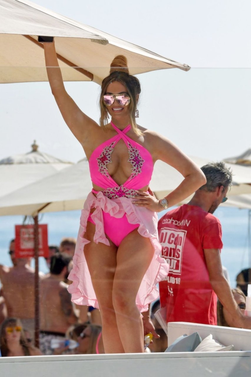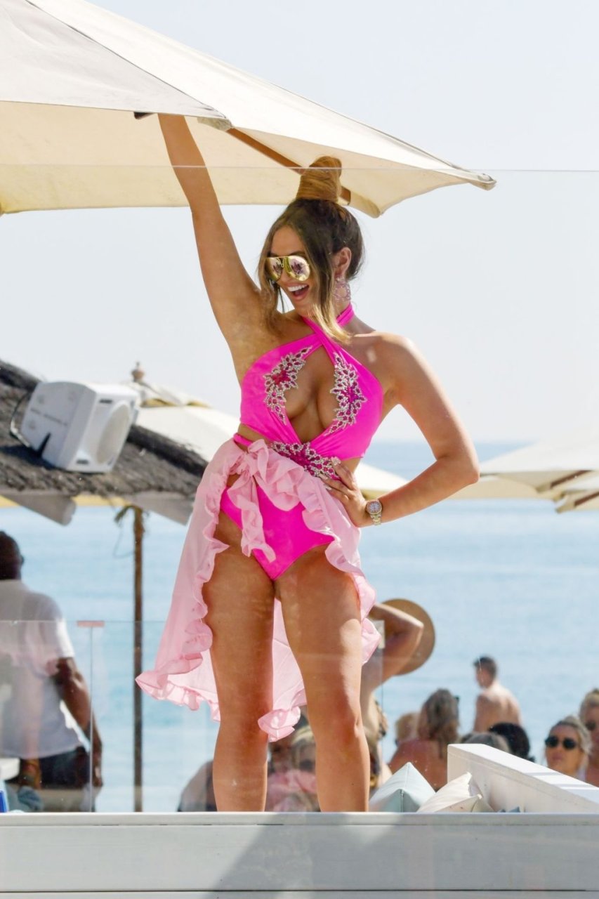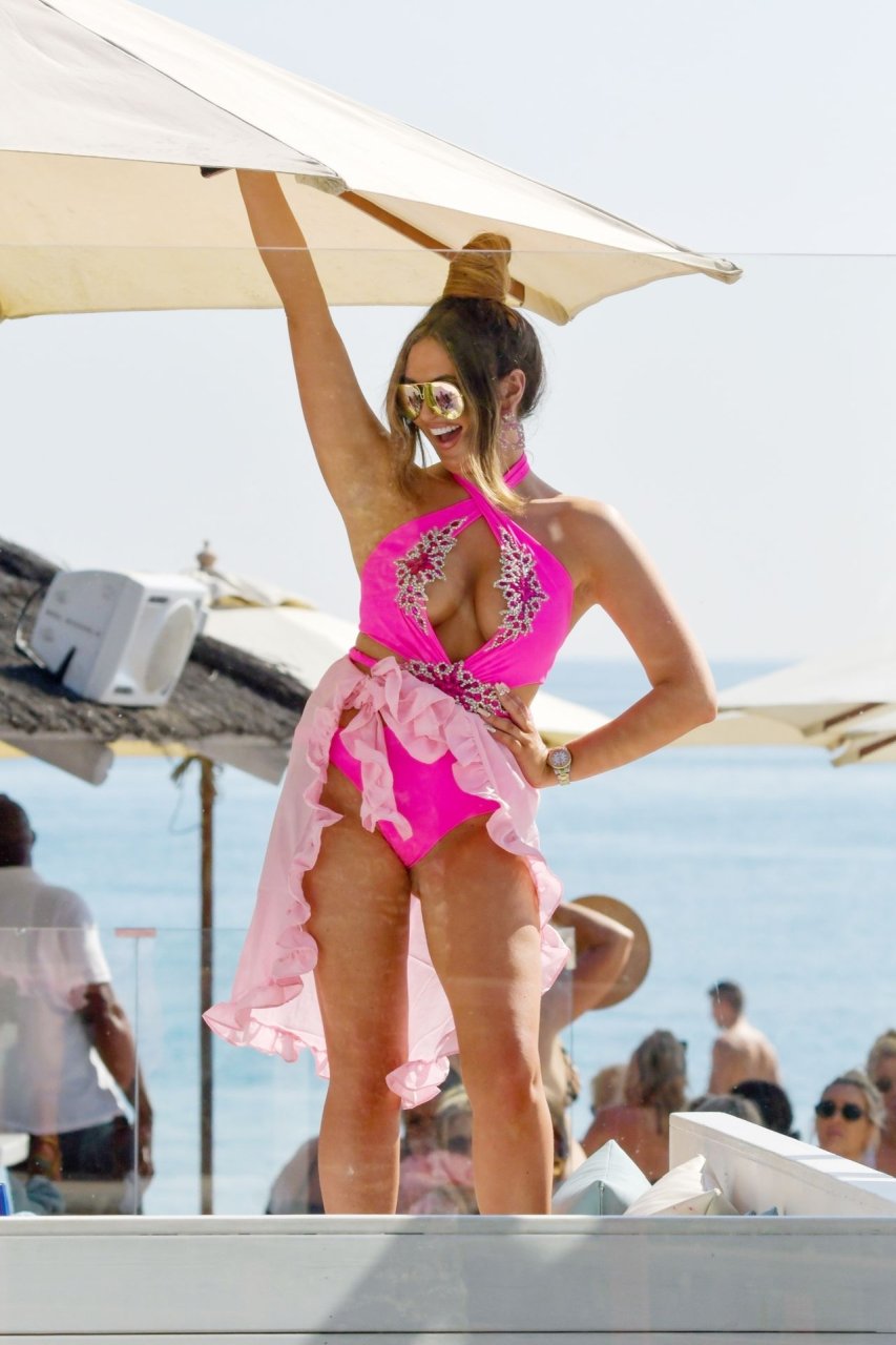 Английская телевизионная звезда Шарлотта Доусон веселится в розовом купальнике на девичнике у подруги на пляже Плаза в Марбелье, 29.09.2019.