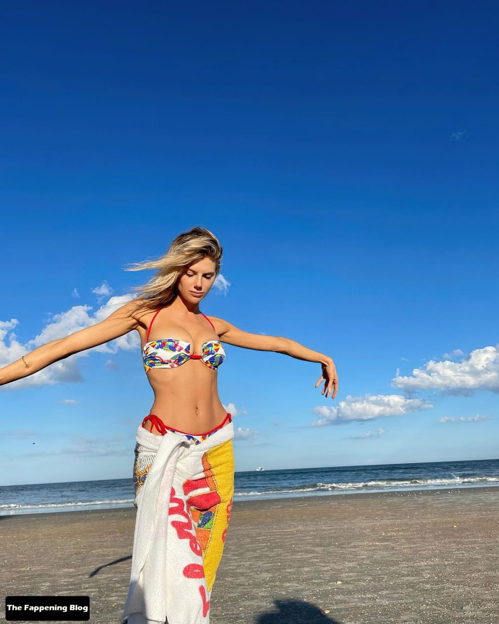 Модель и актриса Шарлотта МакКинни демонстрирует свои сексуальные груди и стройную фигуру, позируя в крошечном бикини на пляже.