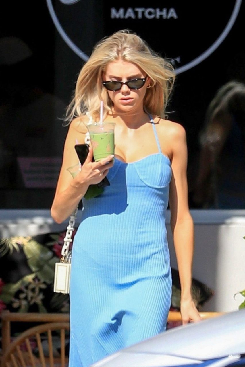Шарлотта МакКинни останавливает движение, выходя из Cha Cha Matcha в Вест-Голливуде с двумя здоровыми зелеными напитками, 26.07.2019.