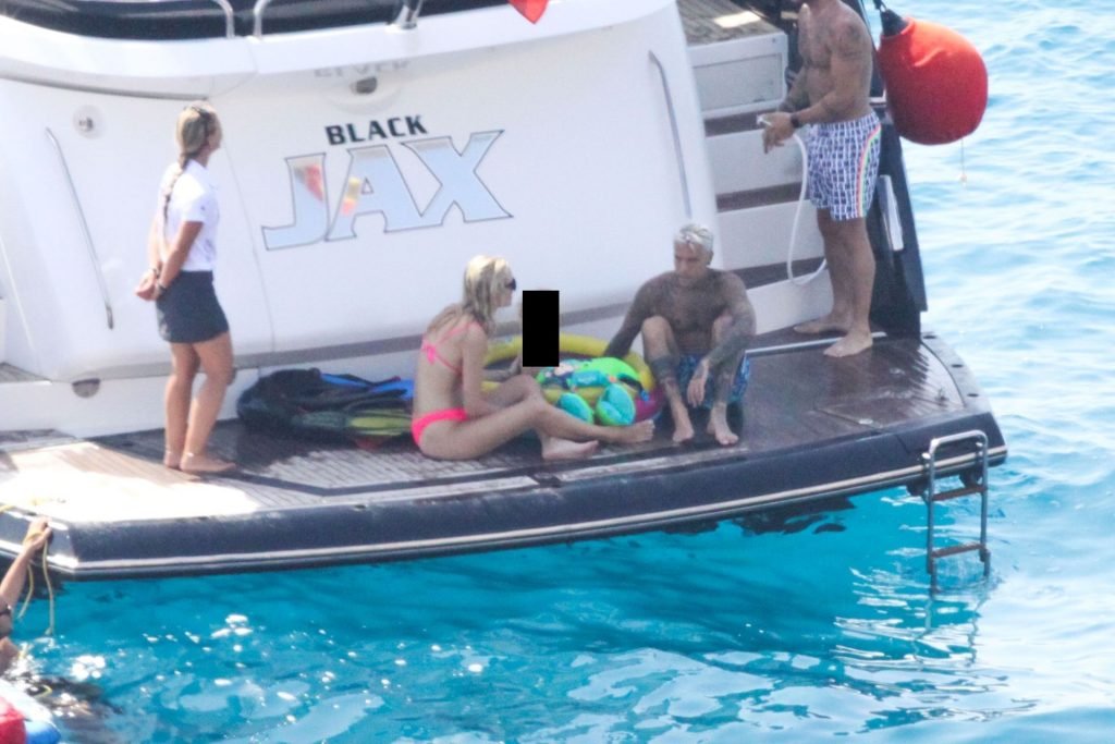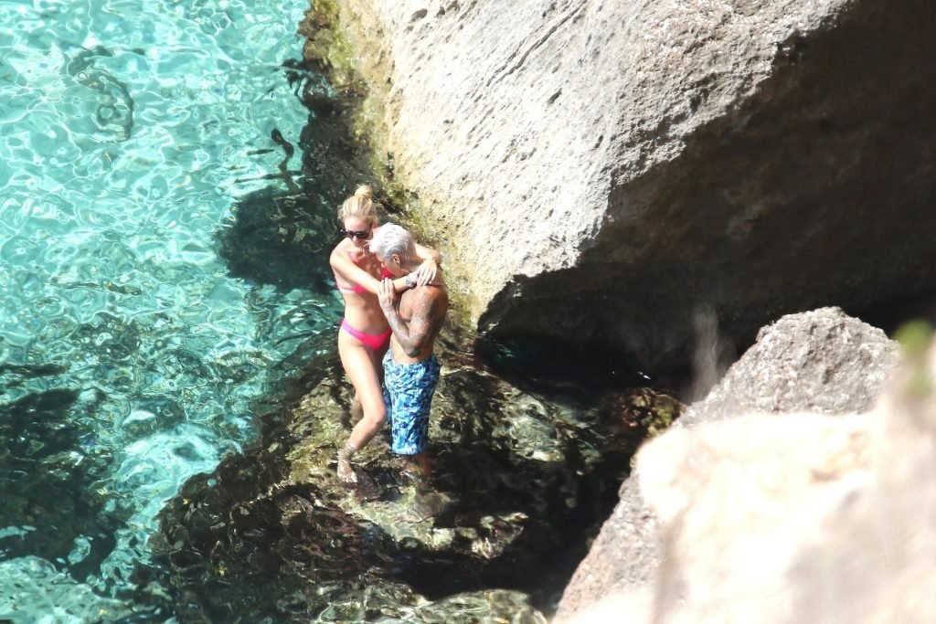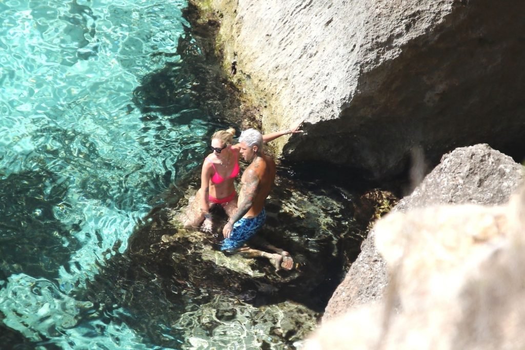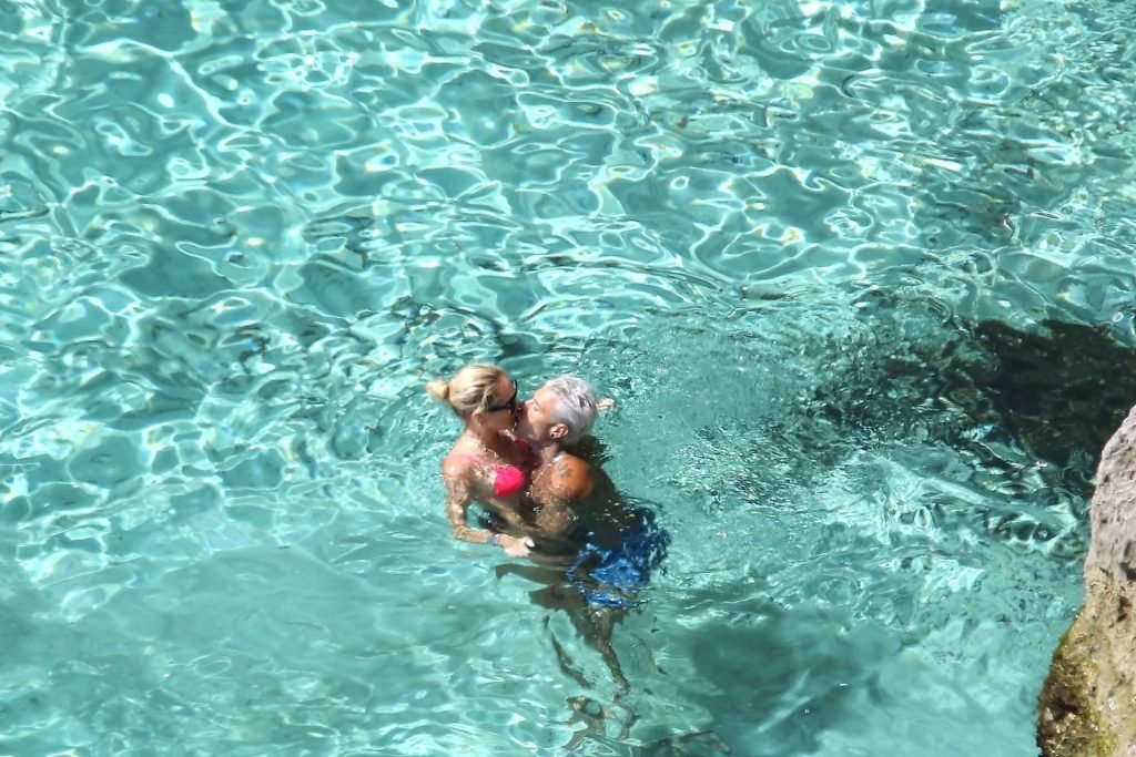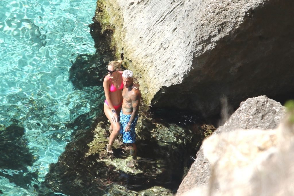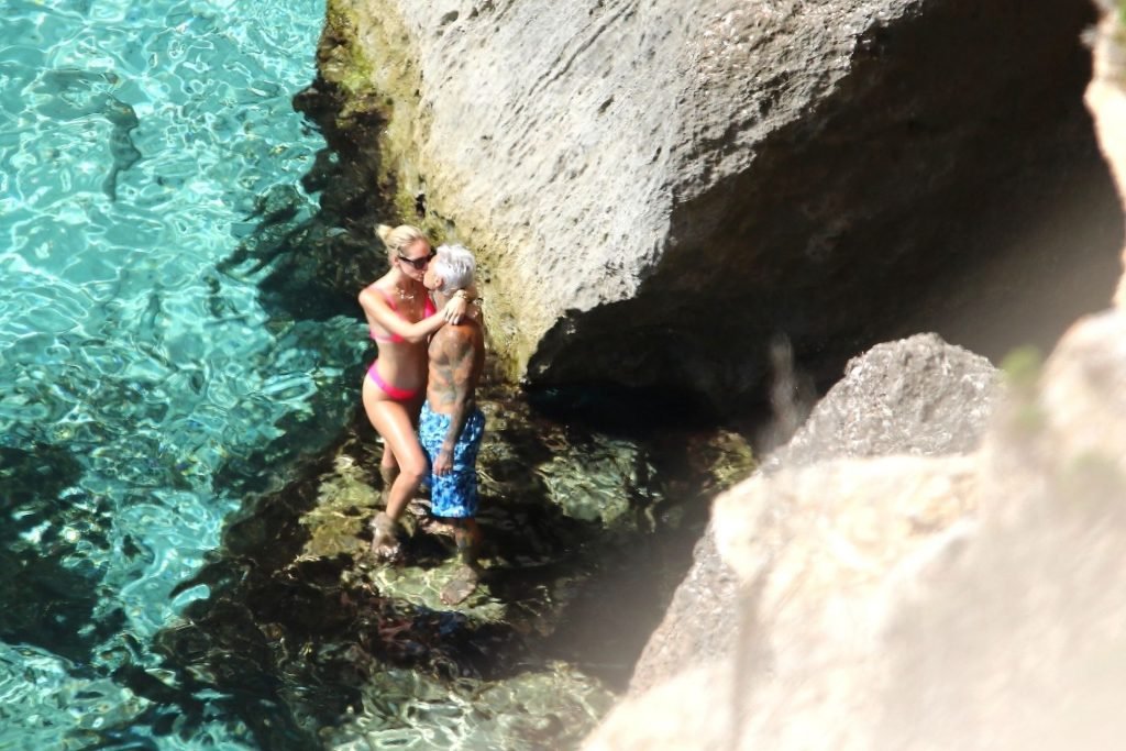 Чиара Ферраньи была в розовом двухсекционном бикини, а Федез — в синих шортах с принтом. Пара выглядела в приподнятом настроении, они обменялись страстным поцелуем.