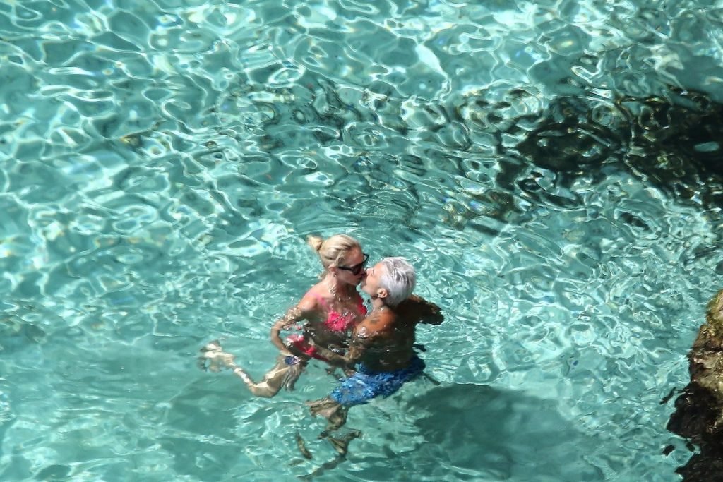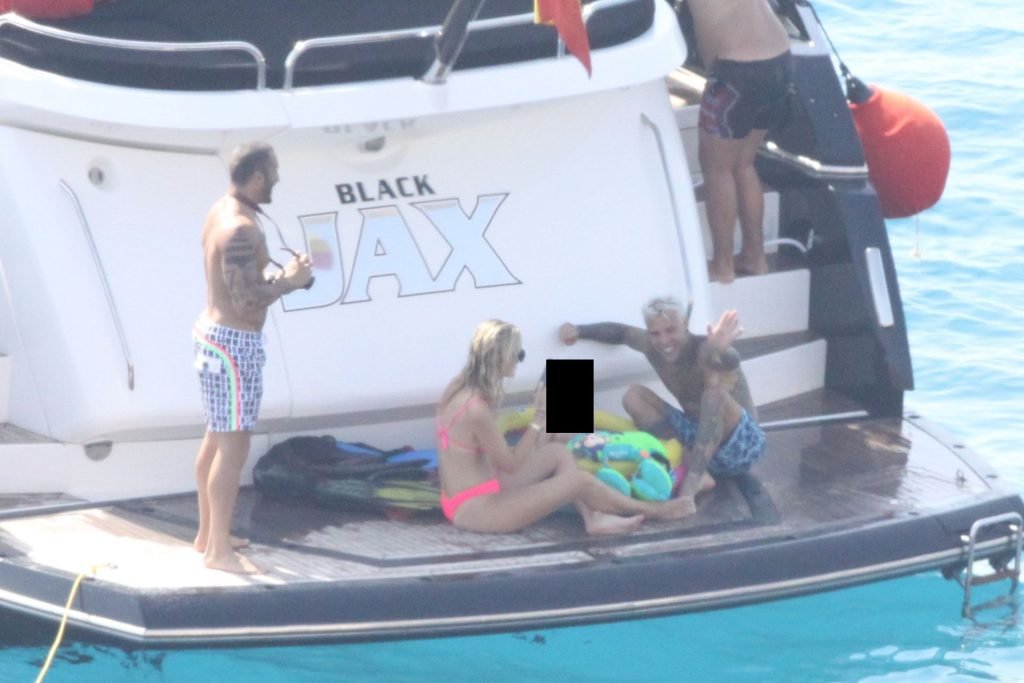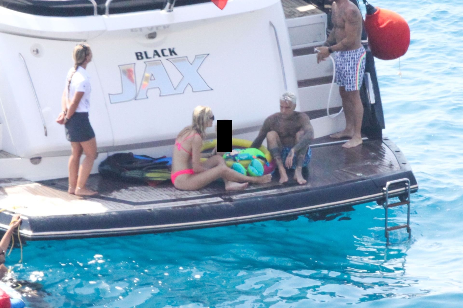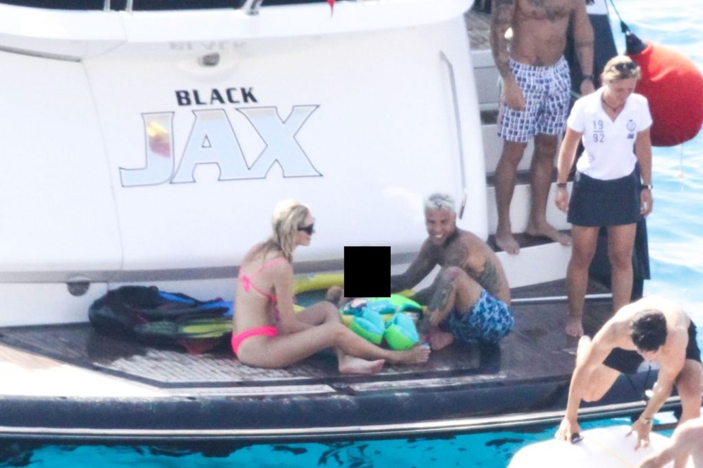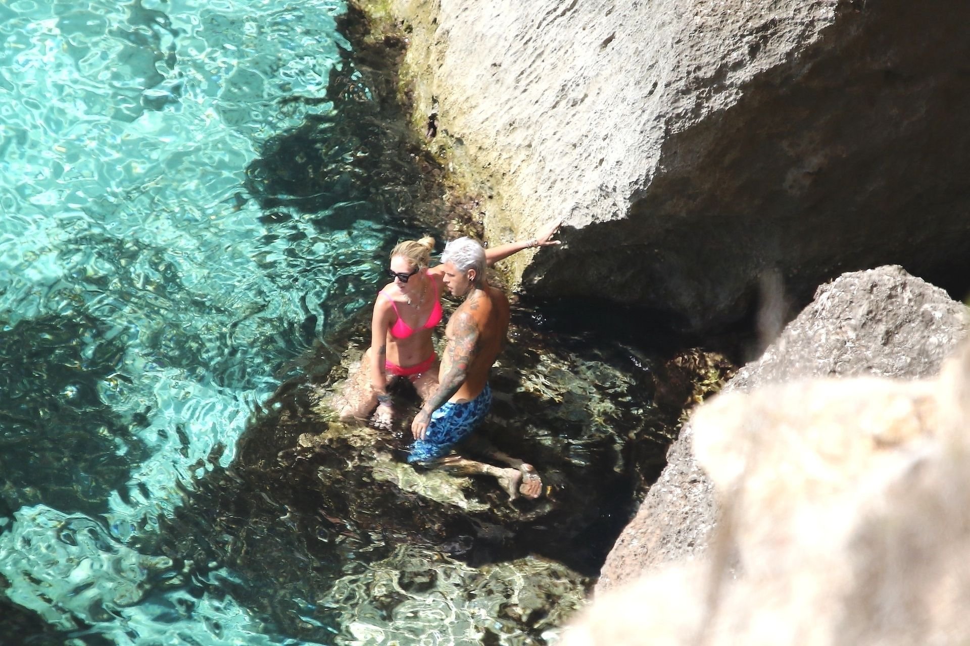 Чиара Ферраньи была в розовом двухсекционном бикини, а Федез — в синих шортах с принтом. Пара выглядела в приподнятом настроении, они обменялись страстным поцелуем.