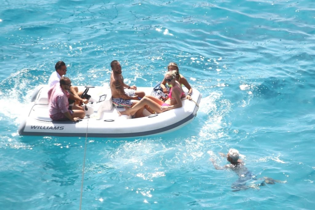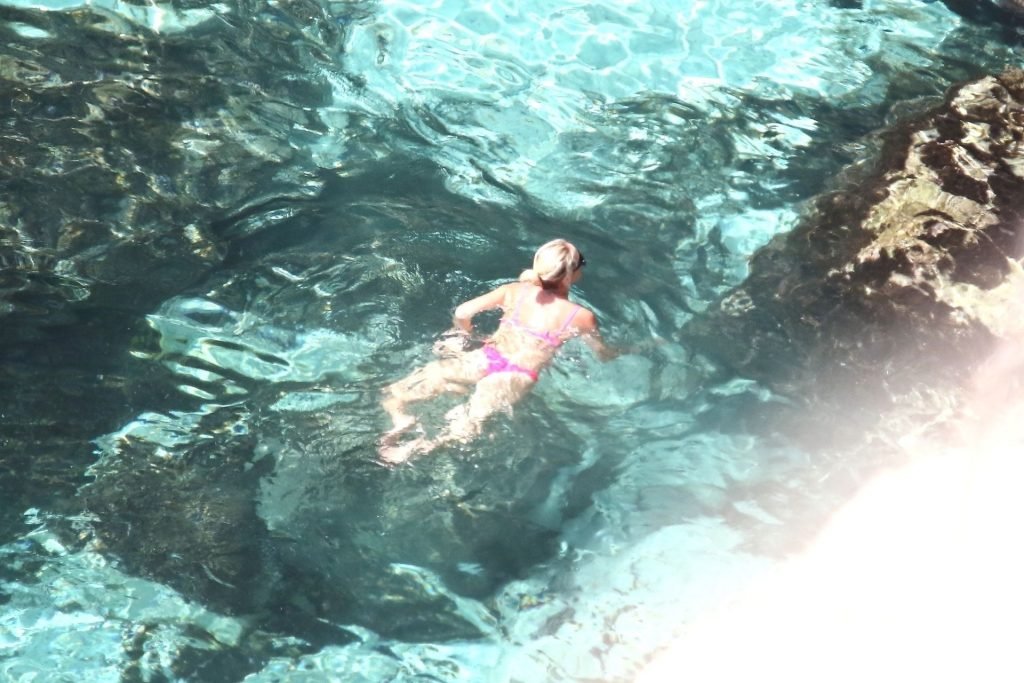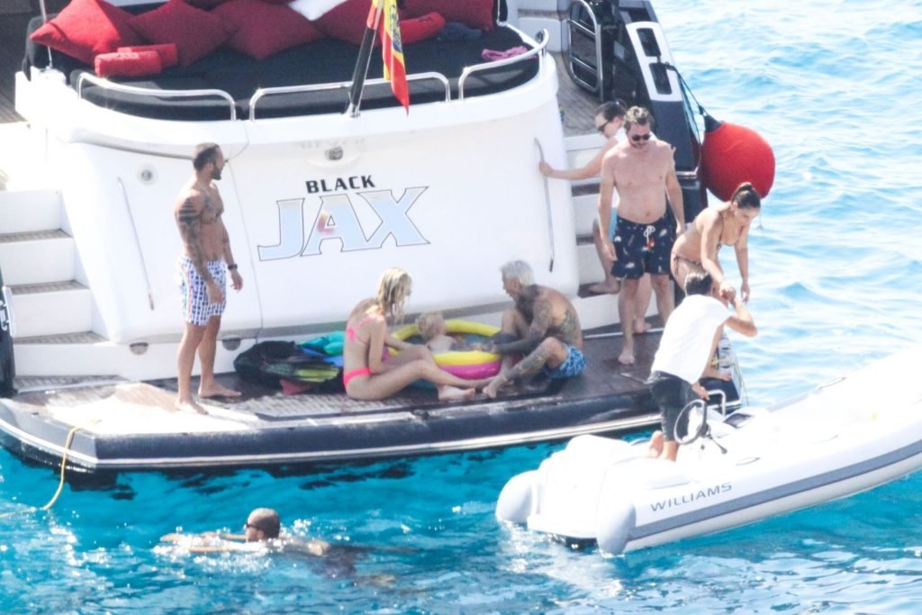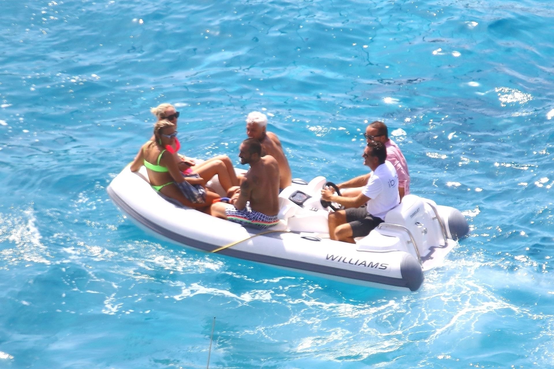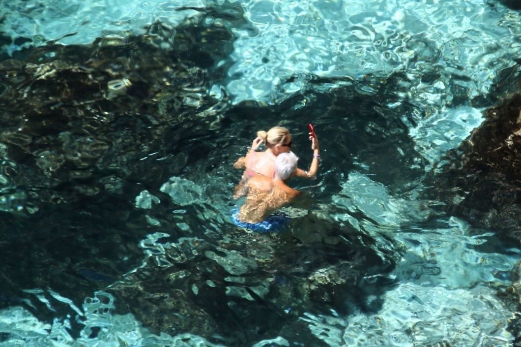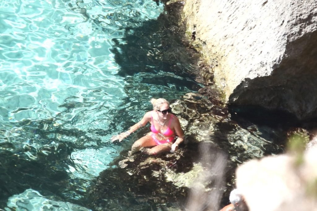 Чиара Ферраньи была в розовом двухсекционном бикини, а Федез — в синих шортах с принтом. Пара выглядела в приподнятом настроении, они обменялись страстным поцелуем.