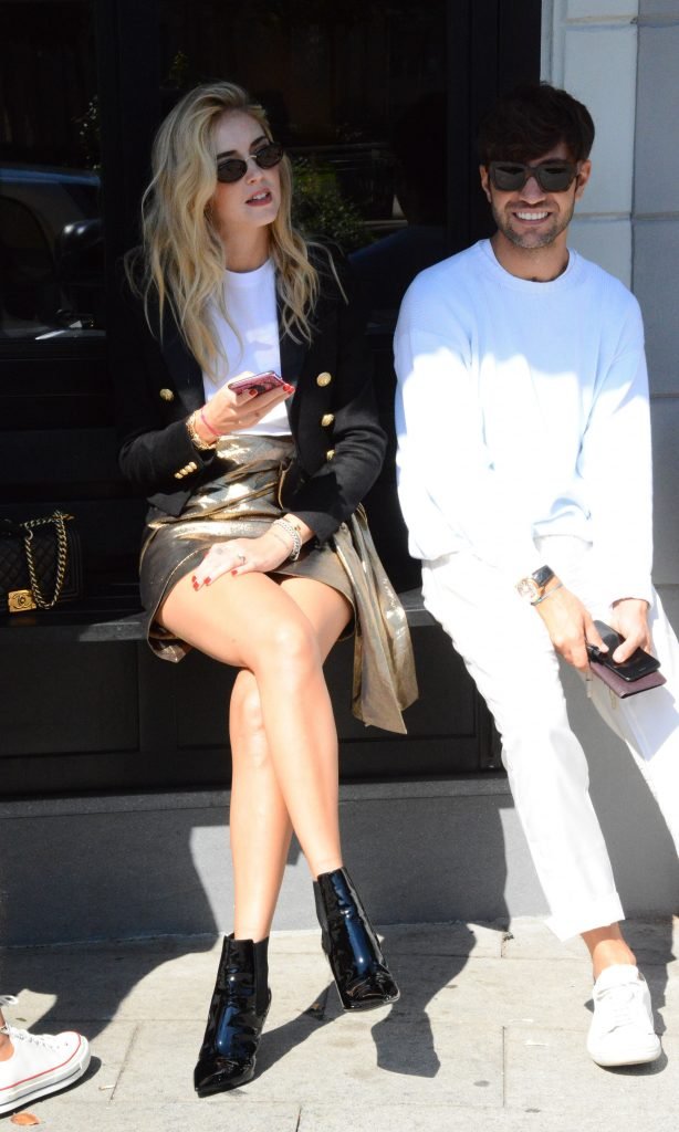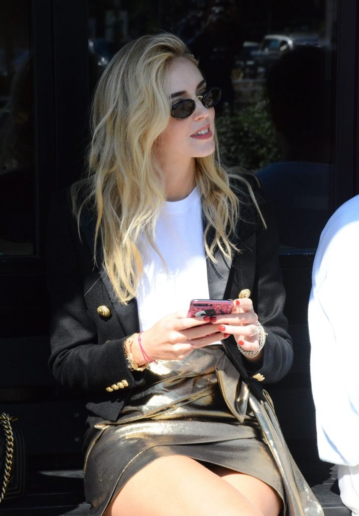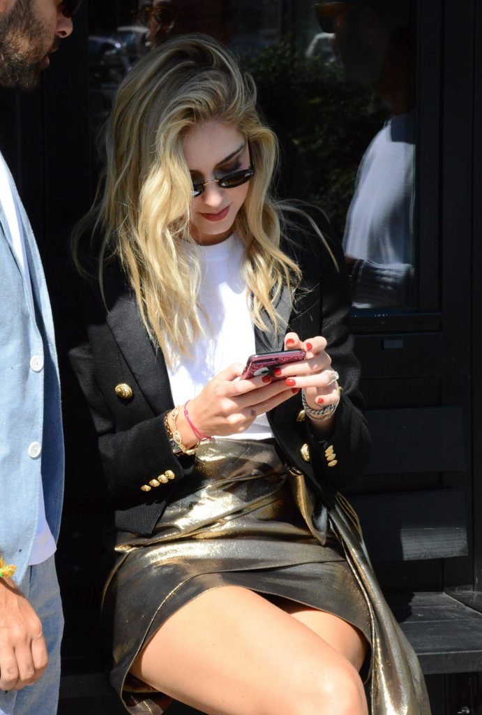 Чиара Ферраньи столкнулась с проблемой в гардеробе, покидая салон красоты Romans Club в Милане, Италия, 17.09.2017. Чиара Ферраньи — итальянский блогер, писатель, дизайнер, бизнесвумен. Возраст – 30.