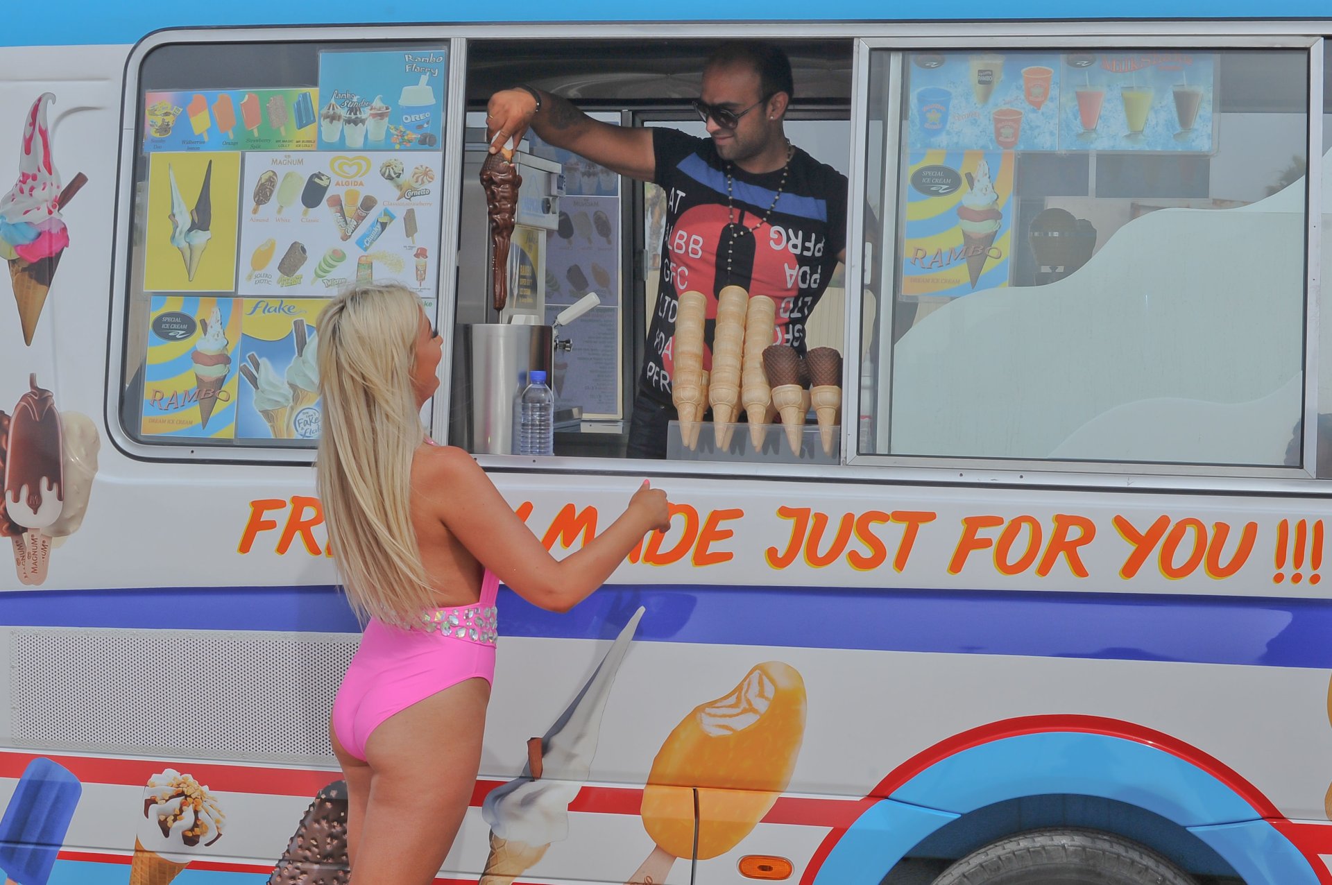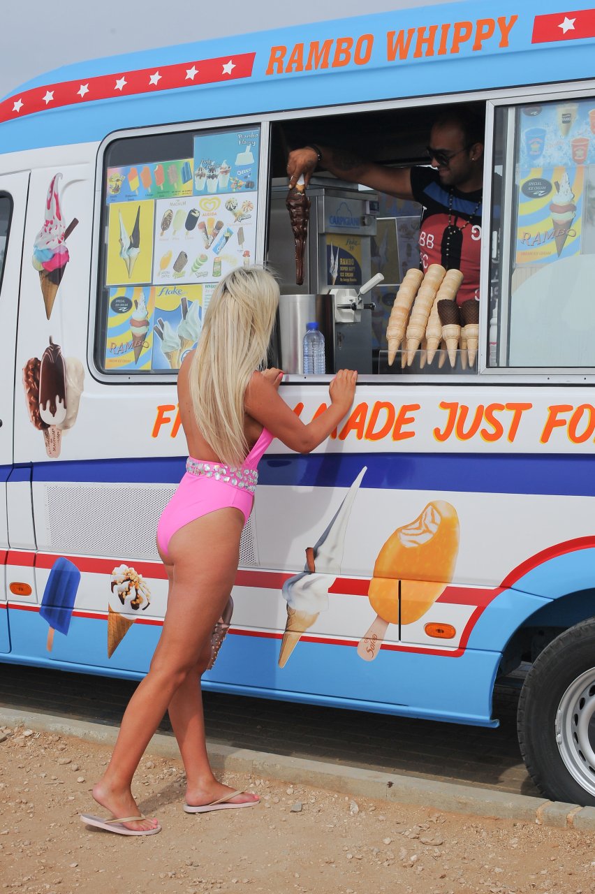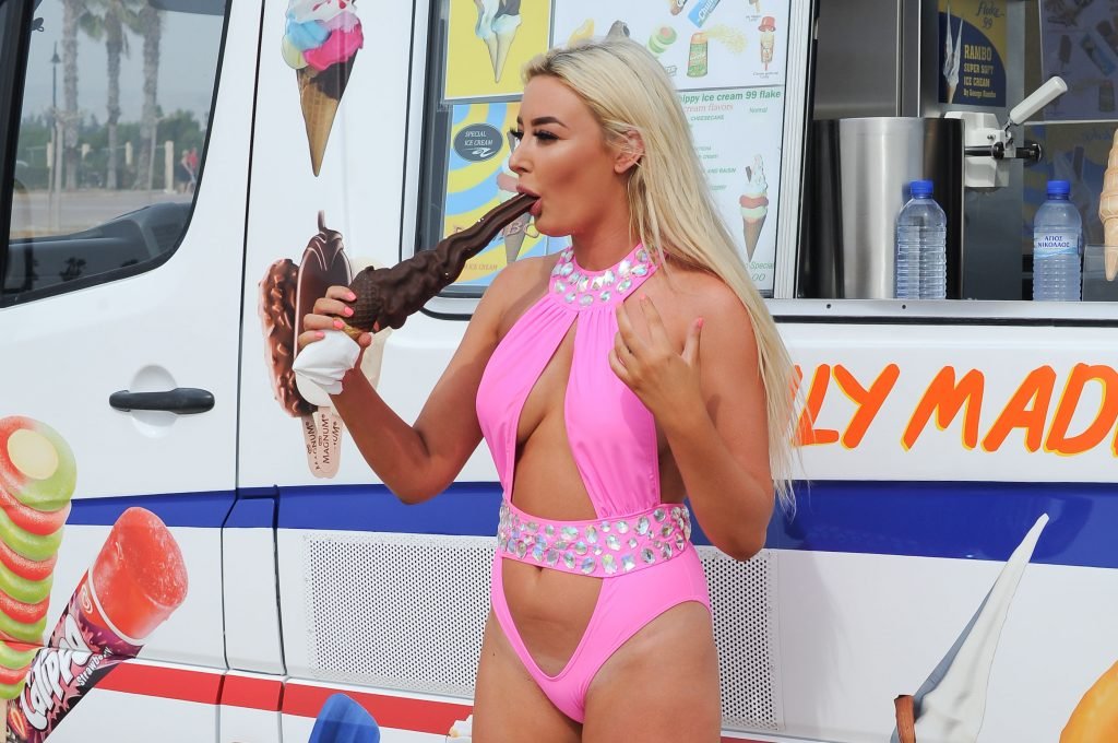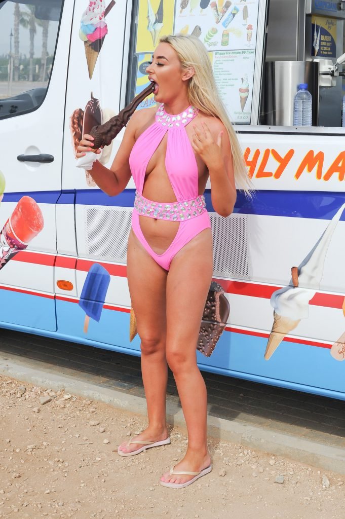 Звезда Love Island Хлоя Кроухерст (21) наслаждается длинным мороженым в шоколадной глазури во время отпуска на Кипре, 19.04.2018. Вместо мороженого все хотят увидеть что-то другое у нее во рту.