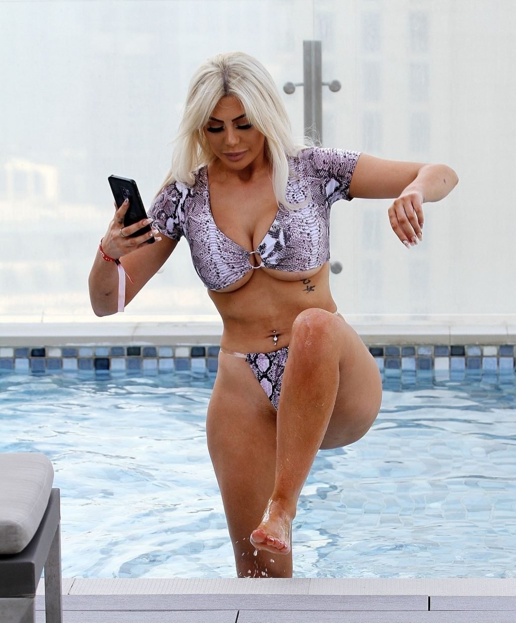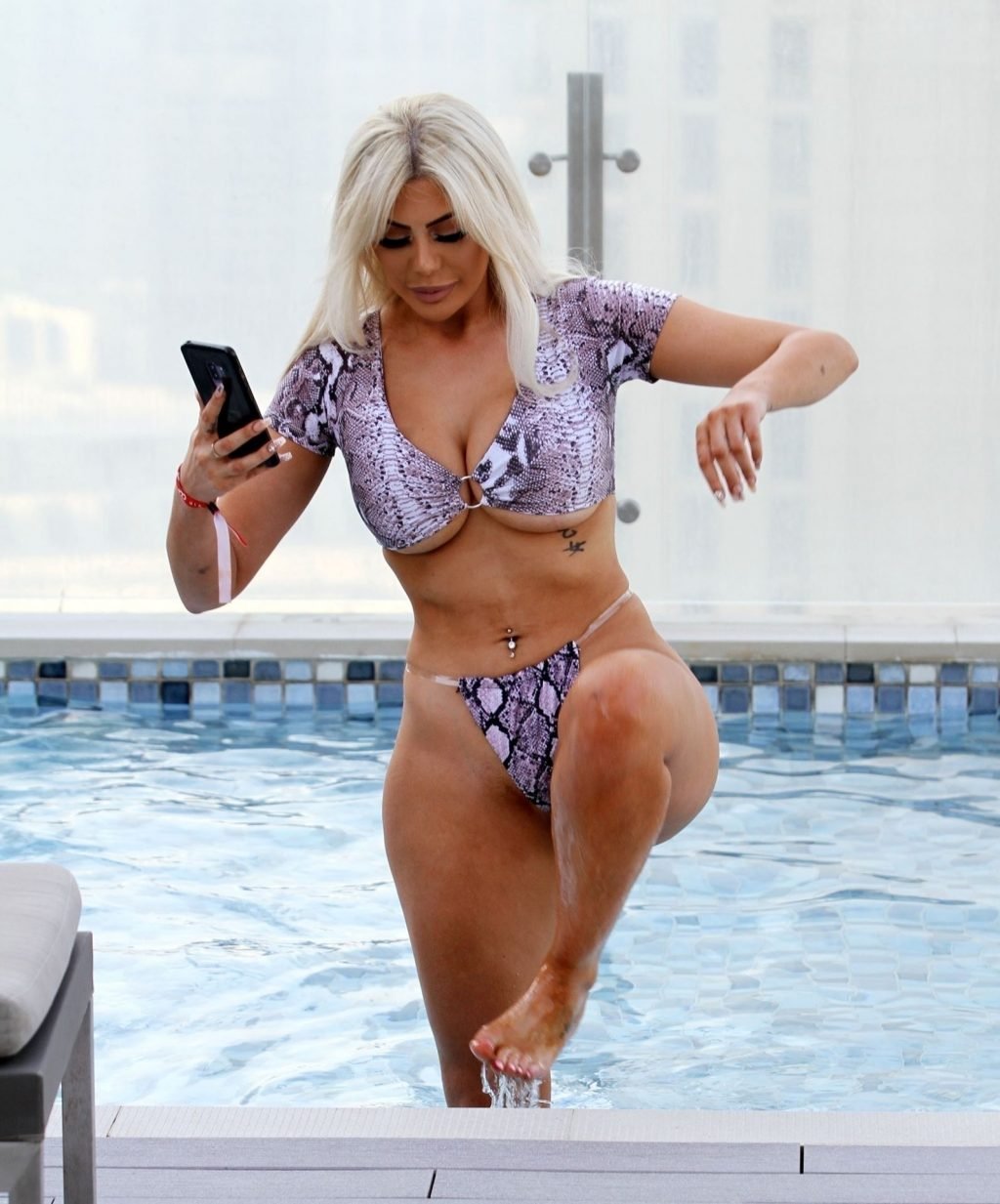 “Звезда “Geordie Shore” Хлоя Ферри демонстрирует свои изгибы в фиолетовом бикини с узором под змеиную кожу, наслаждаясь отдыхом у бассейна во время отпуска в Дубае, 16.10.2019. Ее попа поджарена на солнце!