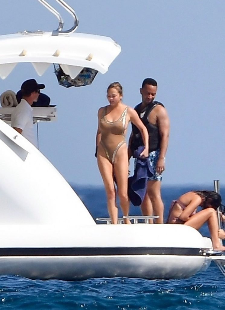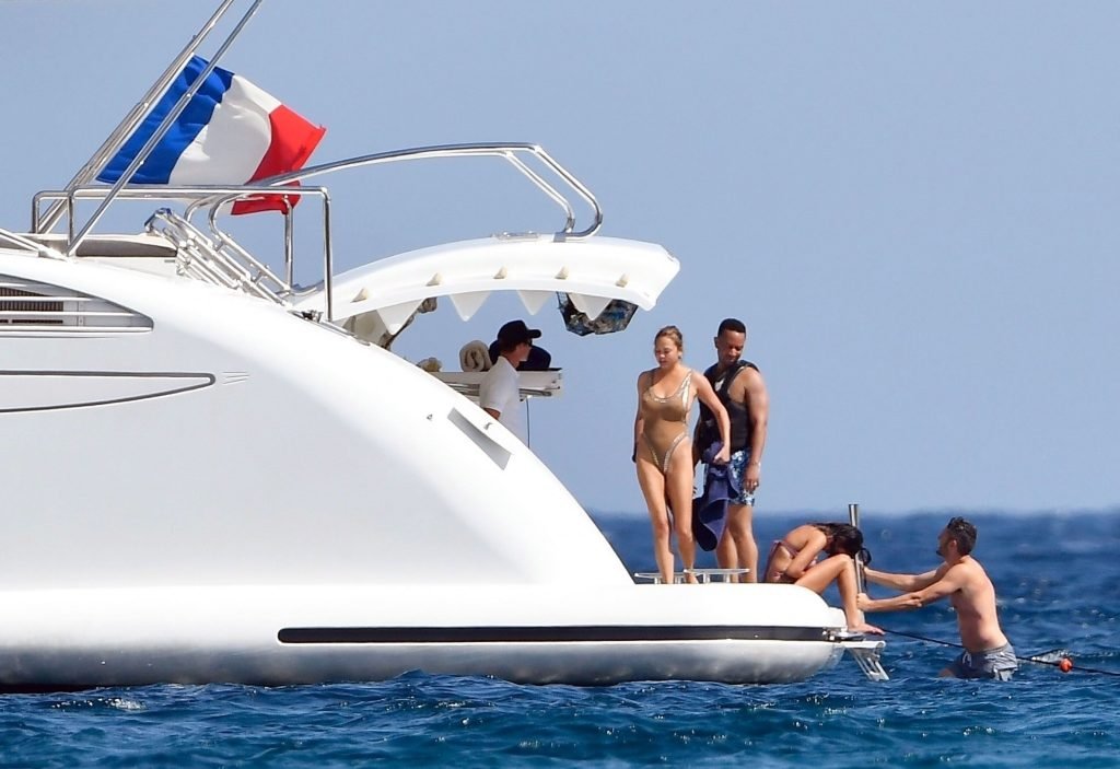 Модель Victoria’s Secret Крисси Тейген (31) запечатлена в великолепном виде, демонстрируя своё горячее пляжное тело во время отдыха на суперяхте в Корсике, 28.08.2017.