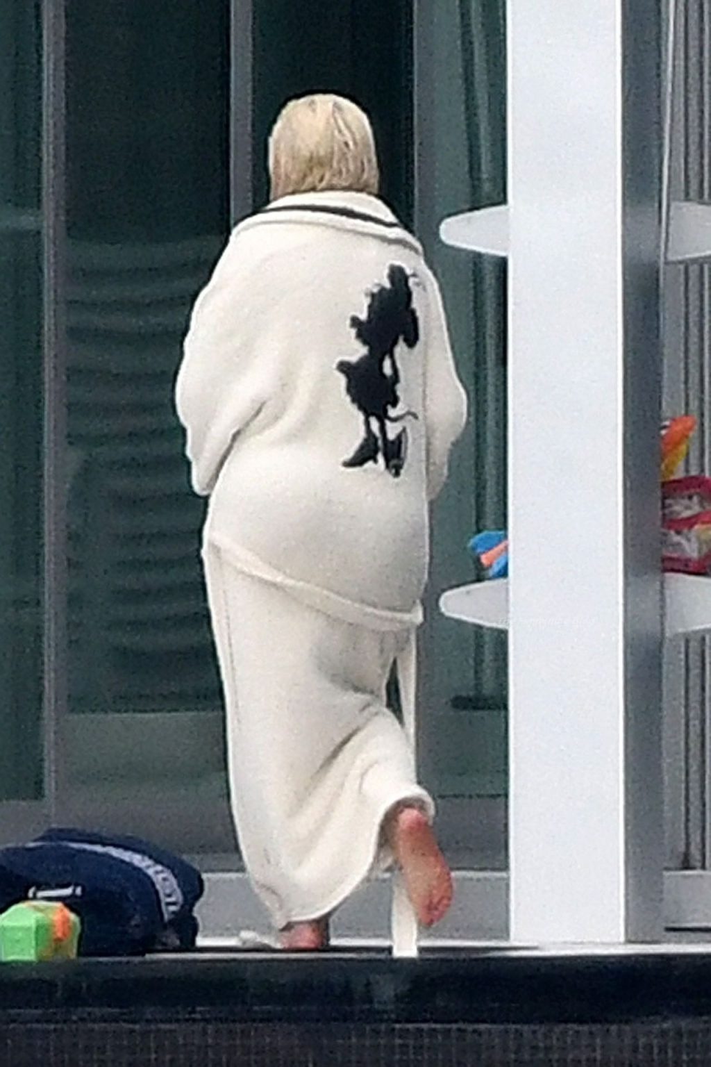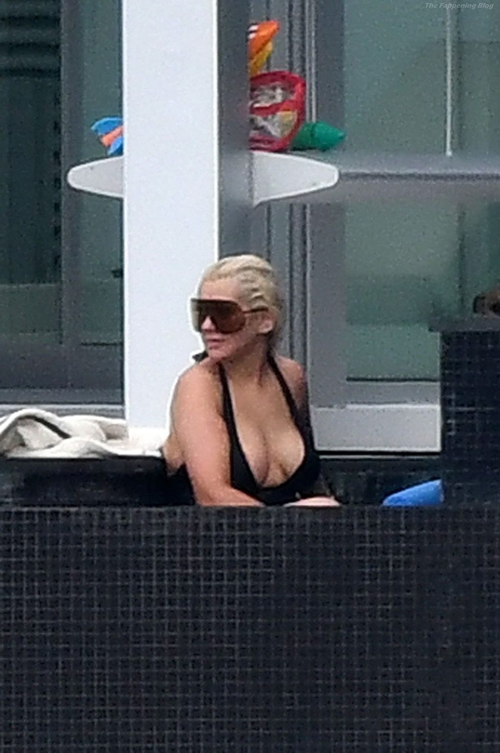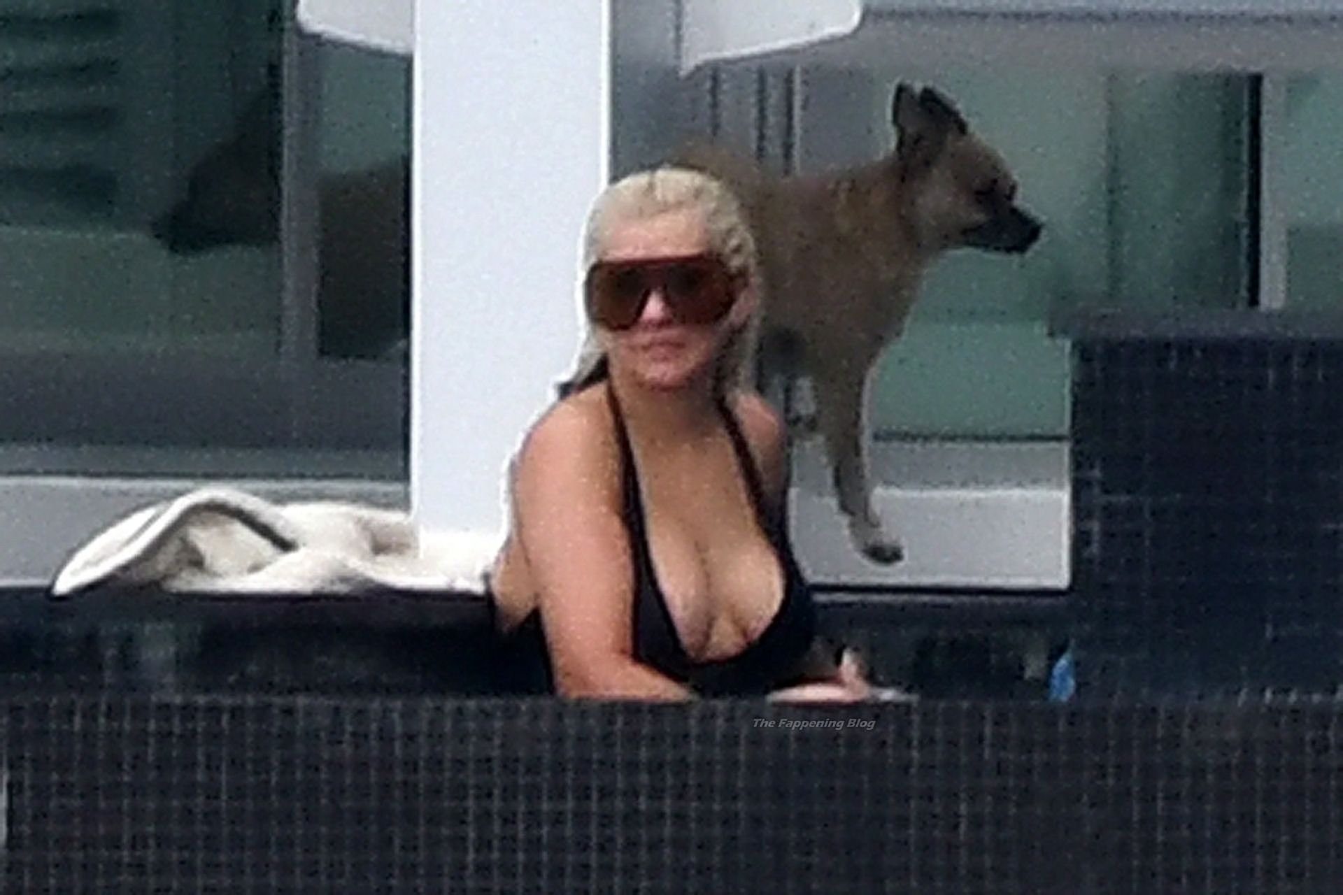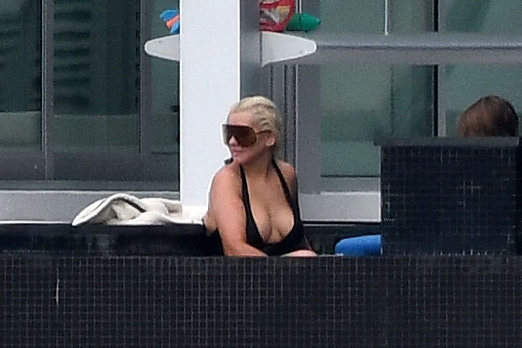 Christina Aguilera wears a black swimsuit and oversized sunglasses as she takes a dip in the pool between recording sessions in Miami. The pop star was also seen playing with her dog and her children and covering up with a white Minnie Mouse robe.