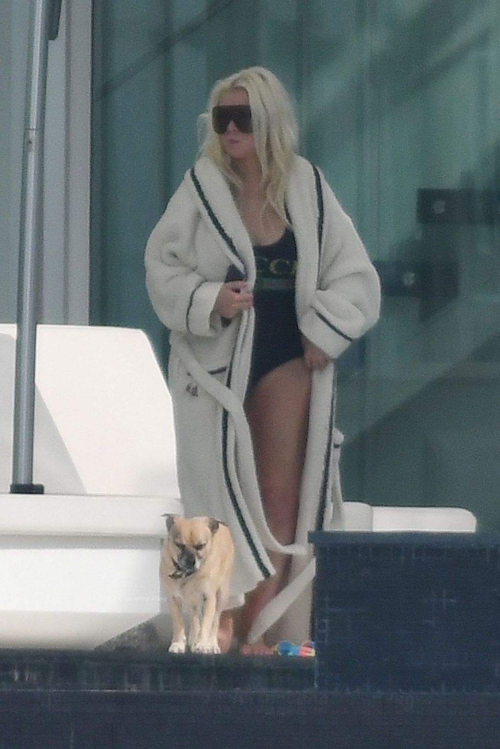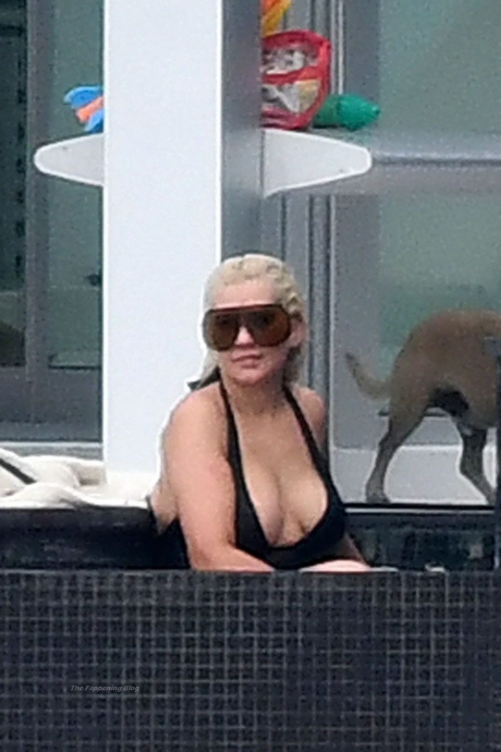 She gets balloons and flowers as she spends Valentine’s Day by the pool with her family. The popstar was first seen in a bright pink sports bra and white pants before changing into her black one-piece swimsuit for a dip in the pool. Aguilera was accompanied by her fiancé Matthew Rutler.