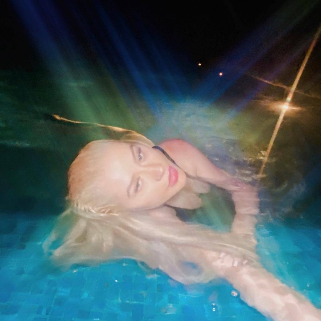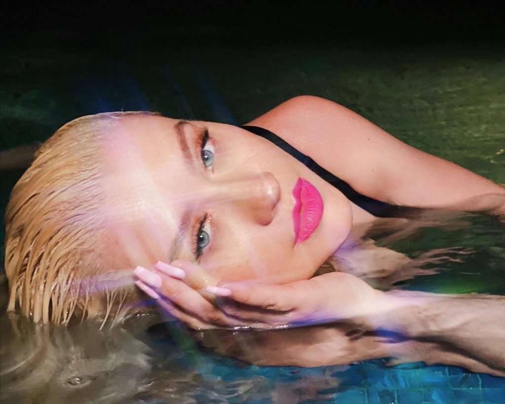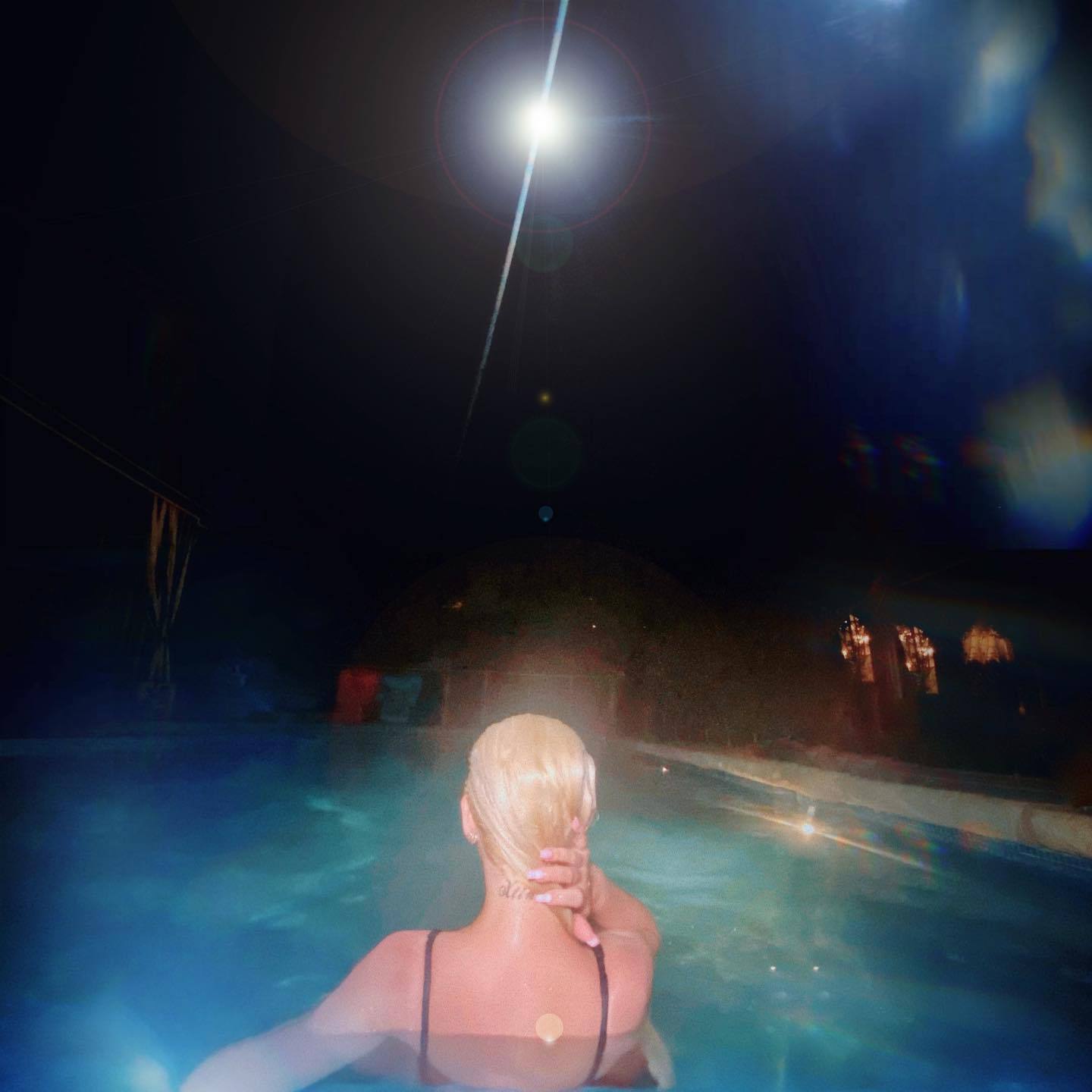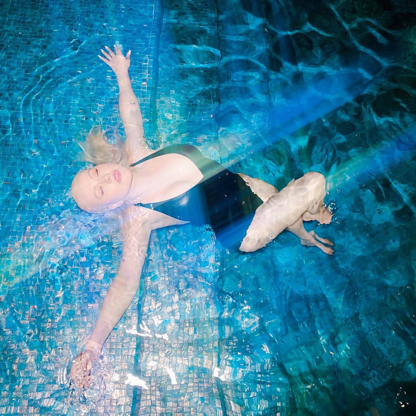 Сексуальная певица Кристина Агилера демонстрирует свои груди, плавая в цельном купальнике в бассейне для фотосессии в социальных сетях, 16.05.2020.