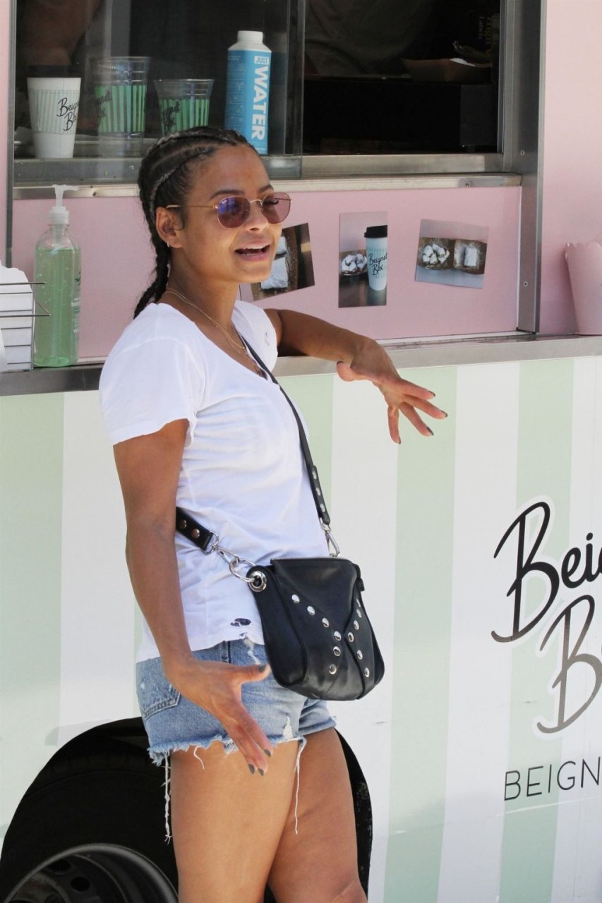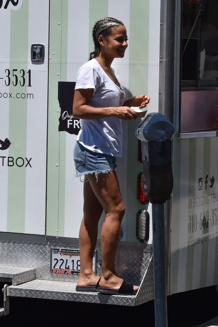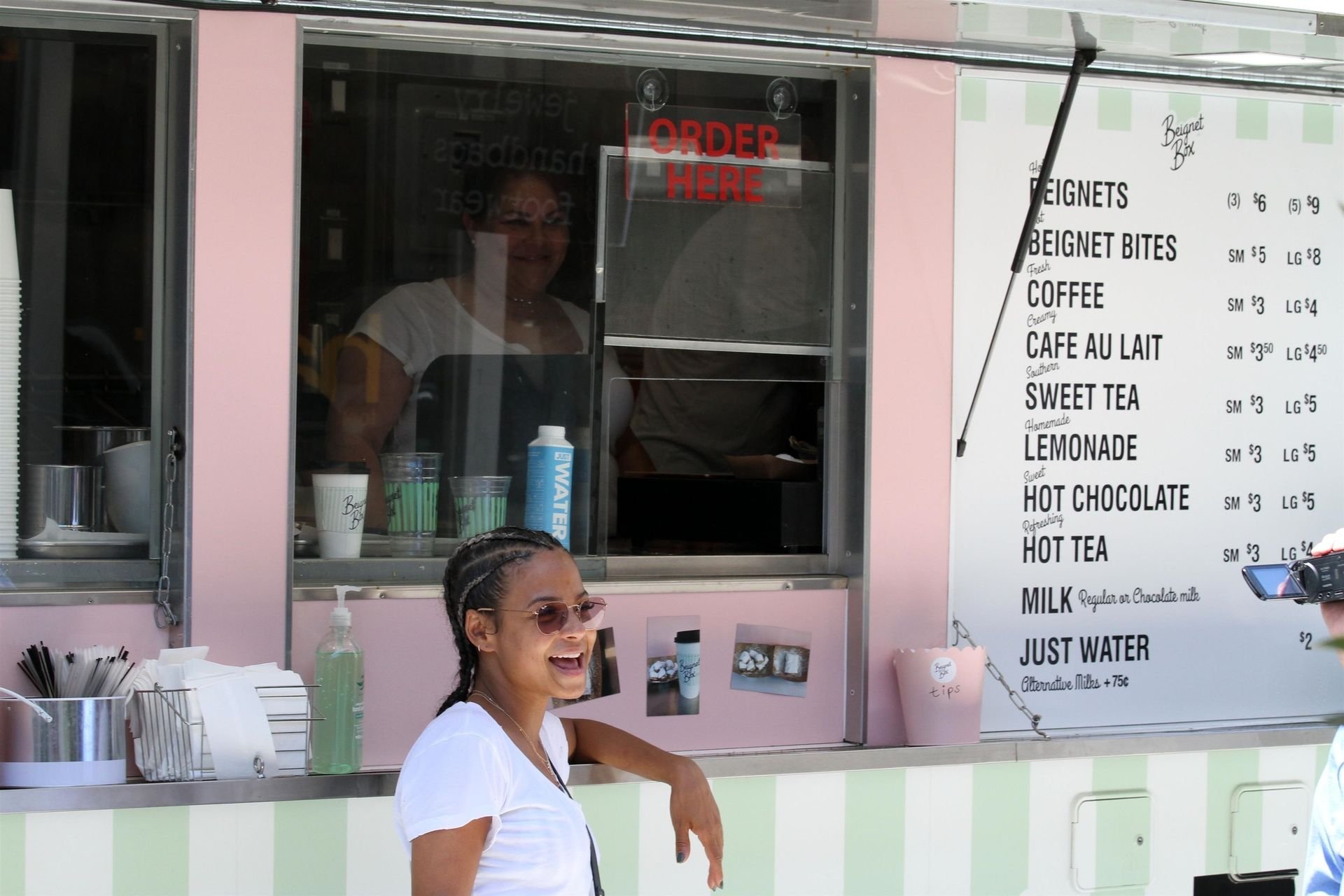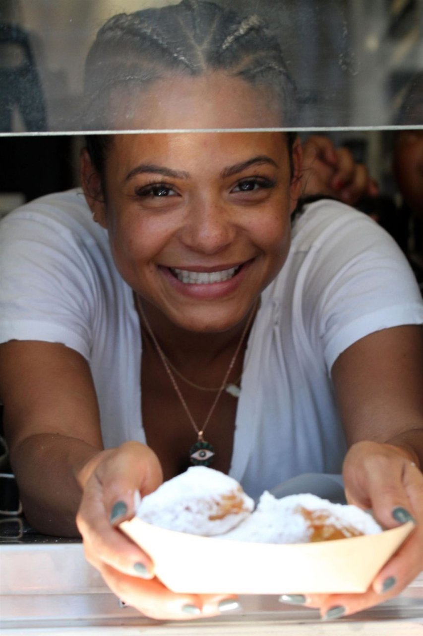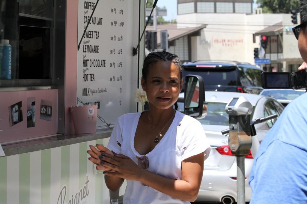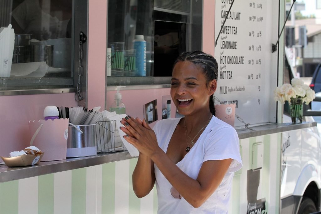 Актриса Кристина Милиан улыбается, демонстрируя свои кулинарные навыки в своем мобильном киоске Beignet Box в Студио-Сити, 12.06.2019. После обеда с дочерью в Joan’s on Third, она делится своими вкусными бенье с фотографами.