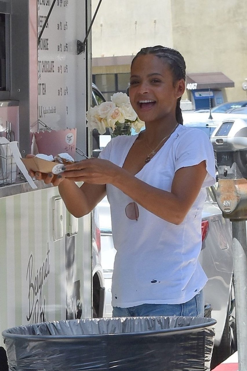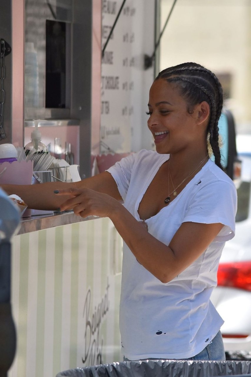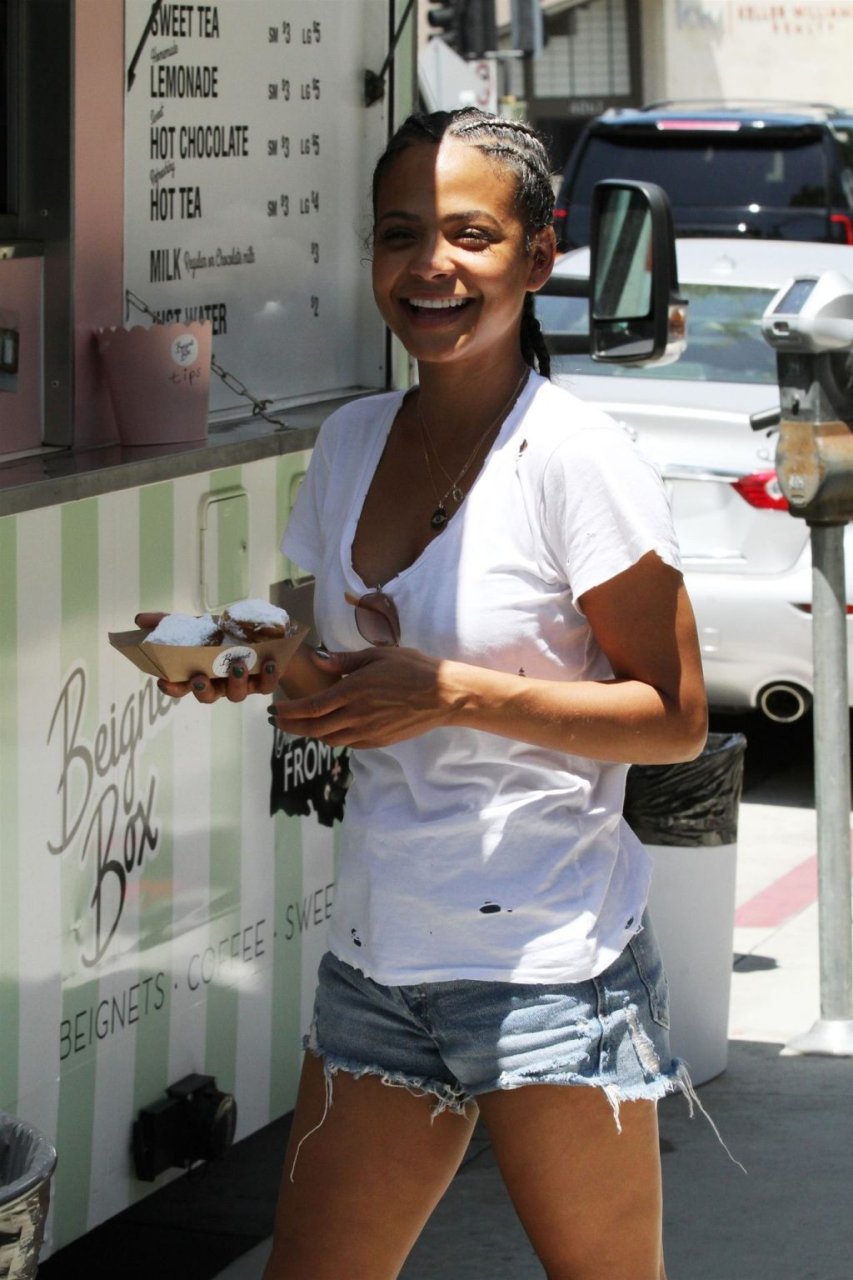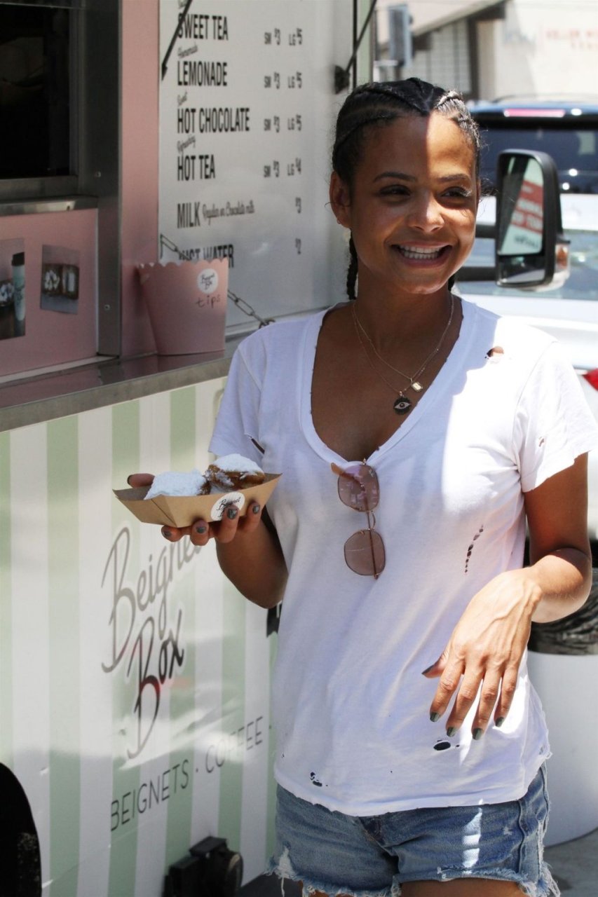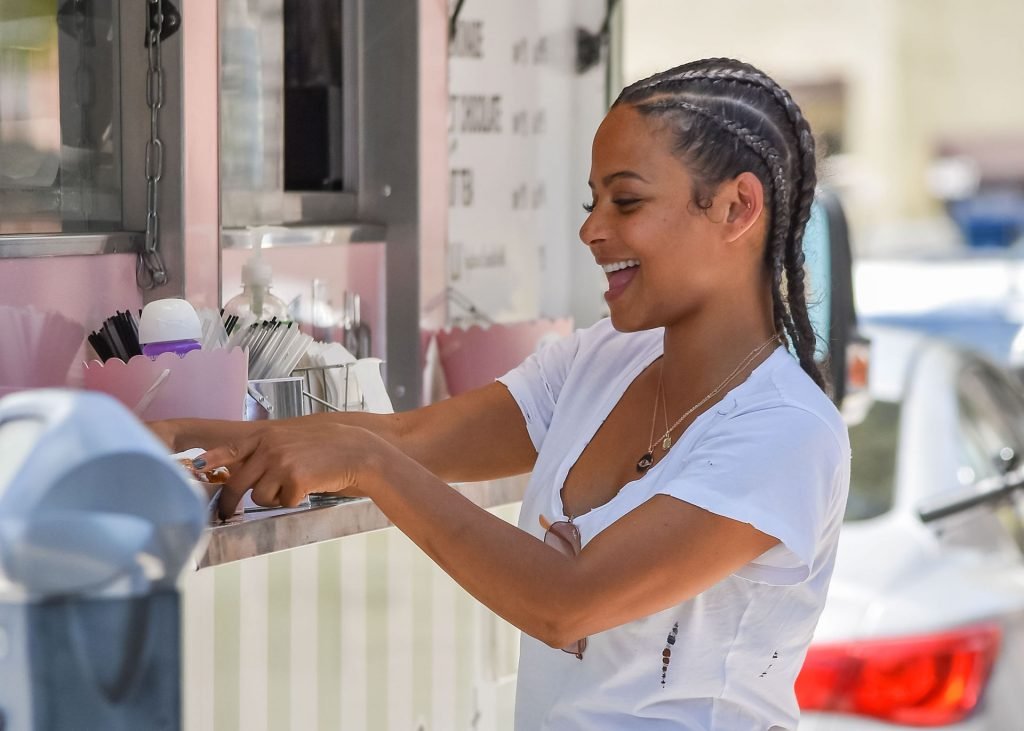 Актриса Кристина Милиан улыбается, демонстрируя свои кулинарные навыки в своем мобильном киоске Beignet Box в Студио-Сити, 12.06.2019. После обеда с дочерью в Joan’s on Third, она делится своими вкусными бенье с фотографами.