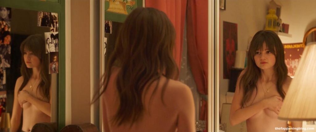 Сиара Браво, известная по фильму “Вишня”, стоит перед зеркалом топлес, скрестив руки на груди, чтобы прикрыть соски, глядя на своё отражение.
