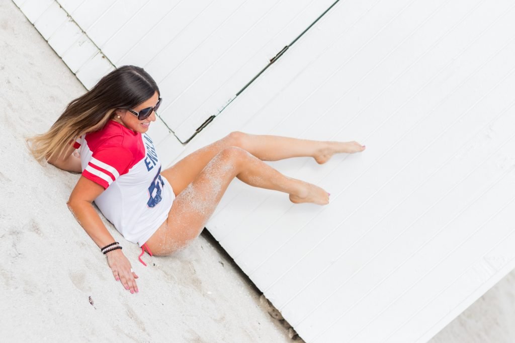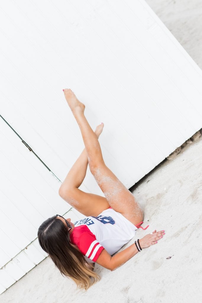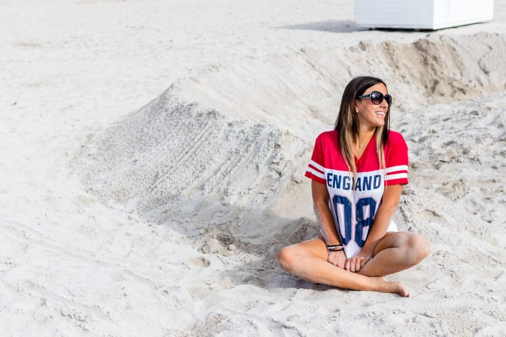 Модель, звезда реалити-шоу, рефери, королева стрингов Клаудия Романи снова поддерживает Англию перед их матчем четвертьфинала – Саут-Бич, 07/06/2018. На ней была футболка Англии и очень маленькие красные стринги.
