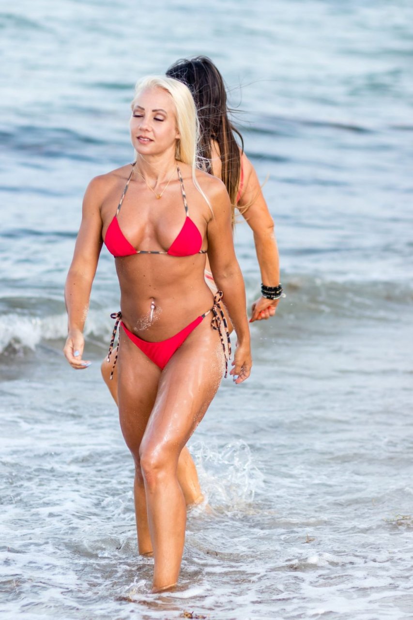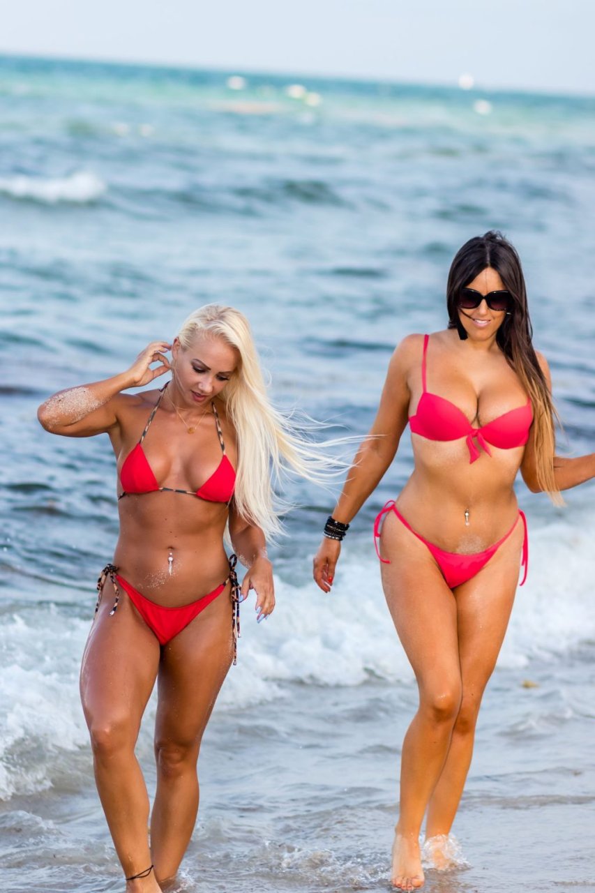 Итальянско-американская звезда реалити-шоу и модель Клаудия Романи с швейцарской фитнес-красавицей Дейзи Джей на Саут-Бич занимаются спортом и йогой, 23.06.2019. Они были в одинаковых красных бикини-стрингах, демонстрируя свои движения.
