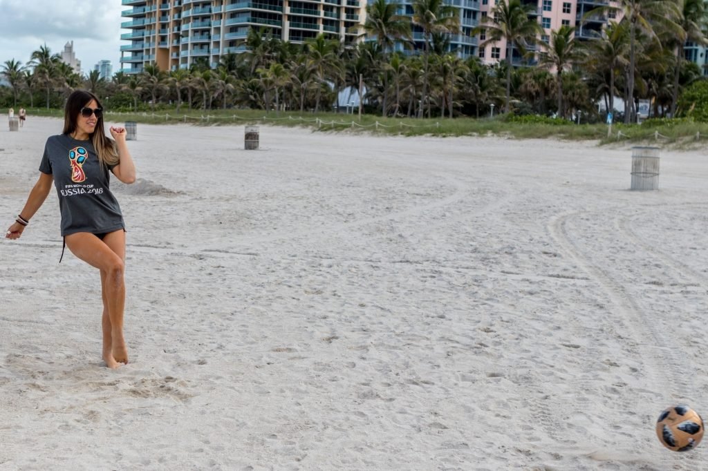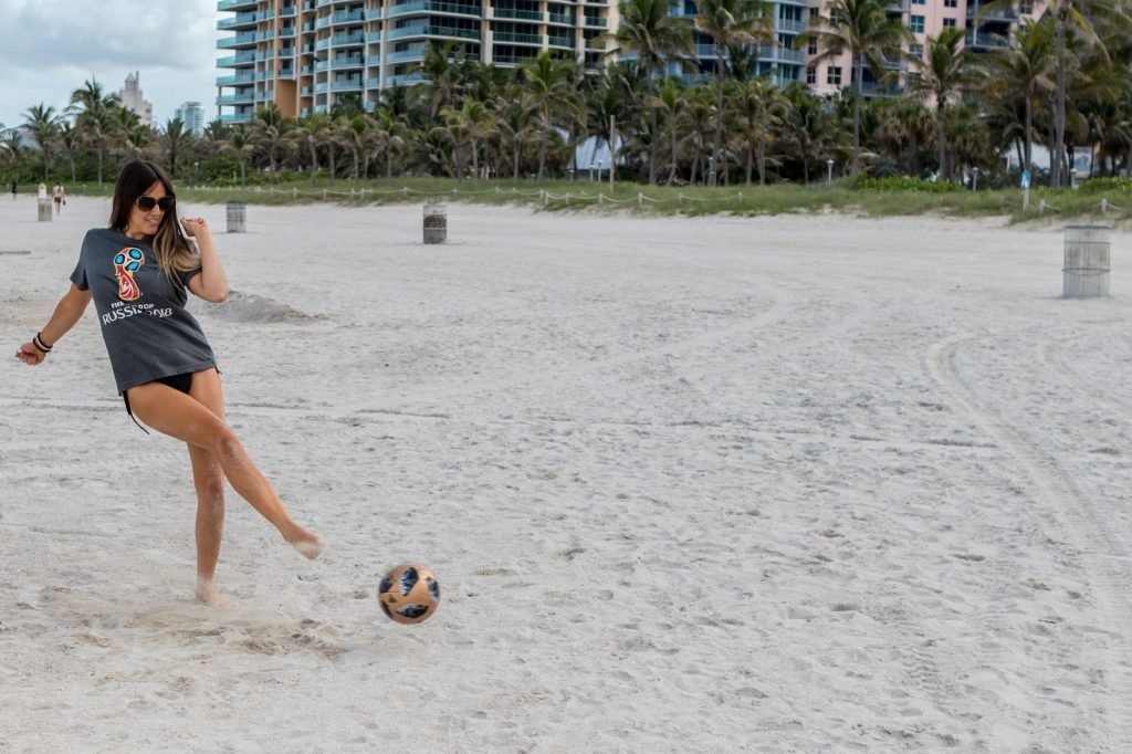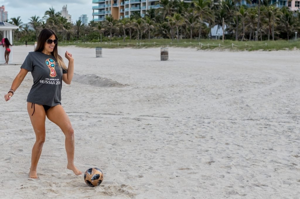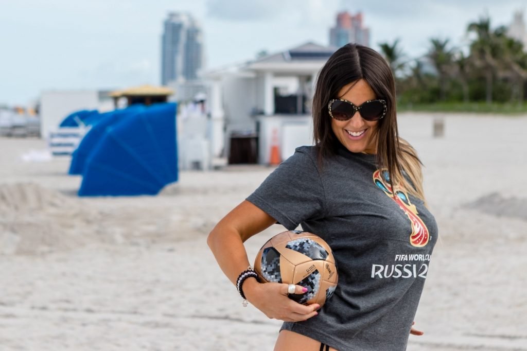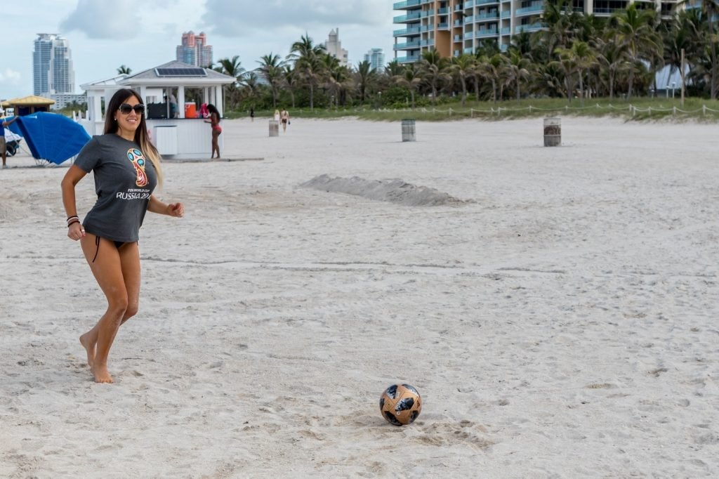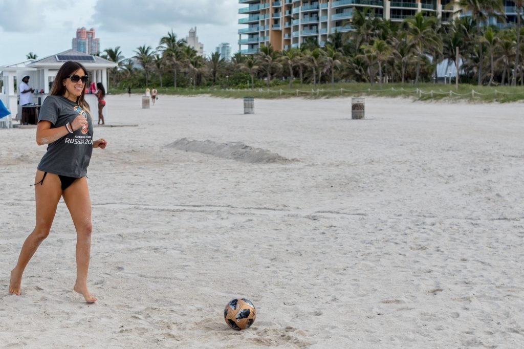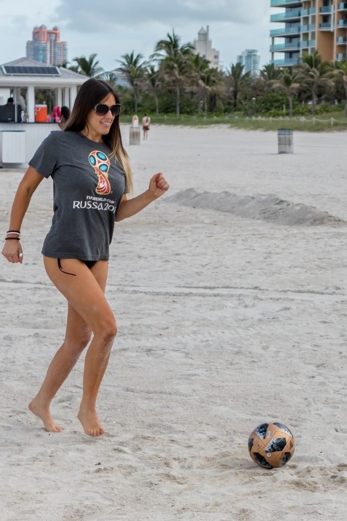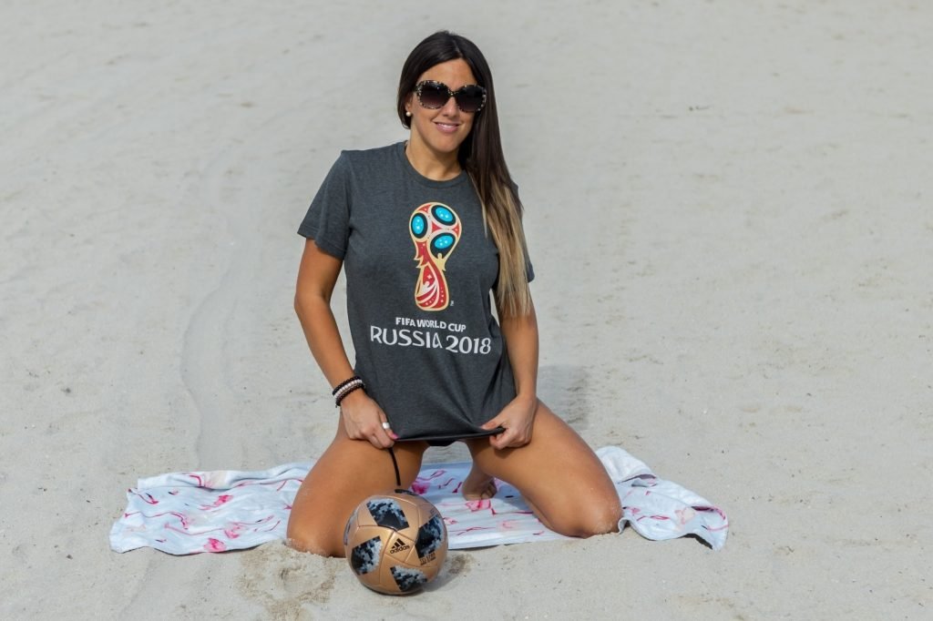 Итальянский судья, модель, звезда реалити-шоу и футбольная фанатка Клаудия Романи (36) на Саут-Бич празднует начало Чемпионата мира, 13.06.2018. Она вышла в официальной российской футболке 2018 года и своей обычной очень маленькой стрингах. Италия в этот раз не участвует, но Клаудия готова.