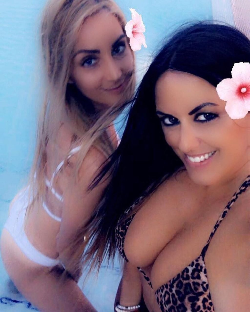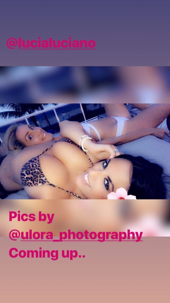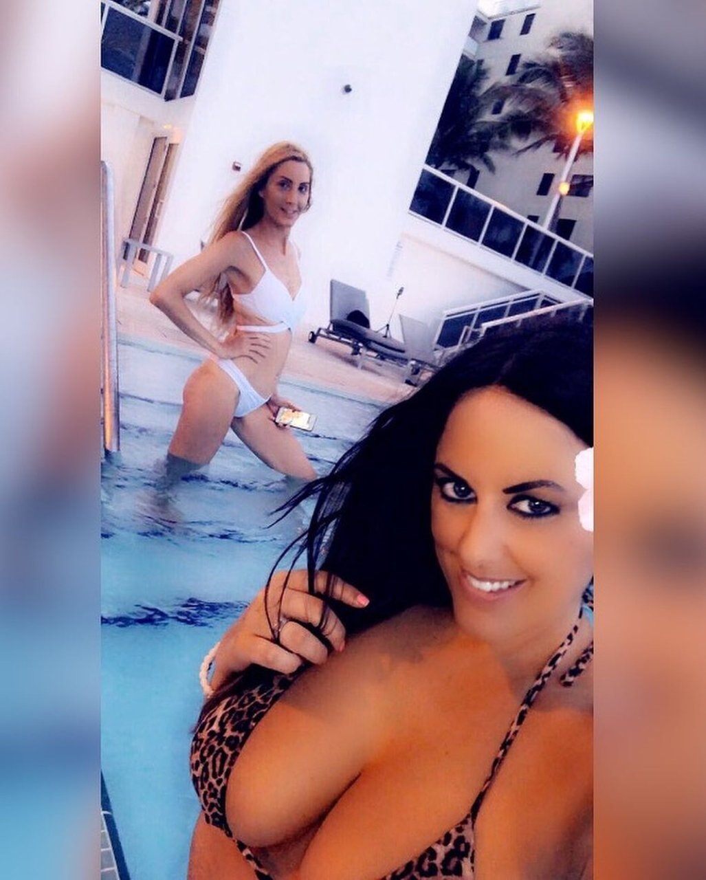 Итальянско-американская модель и звезда реалити-шоу Клаудия Романи с итальянской моделью Лючией Лучиано у бассейна, 15.07.2019. Они прогуливались вокруг бассейна и позировали в воде. На них была одежда итальянского бренда Calzedonia в рамках недели купальников.