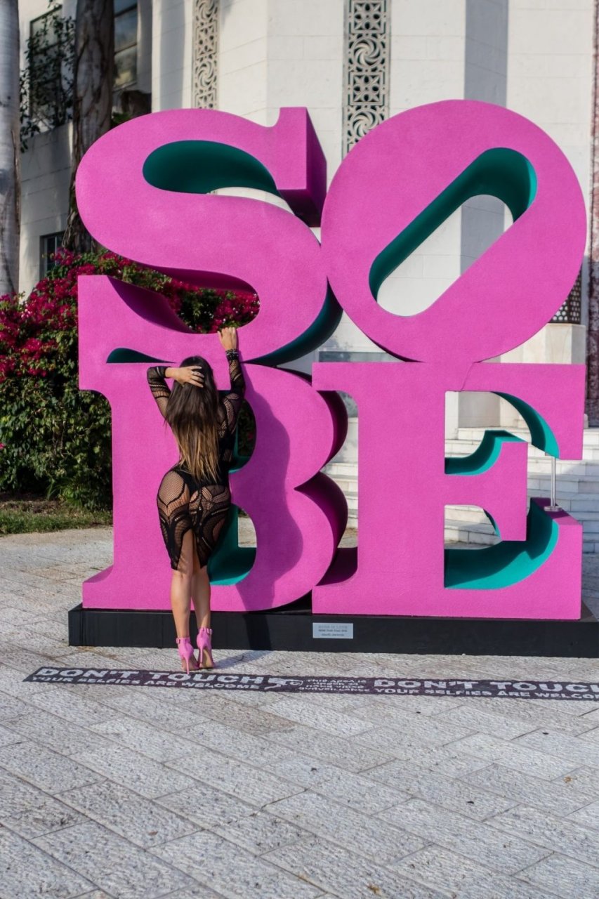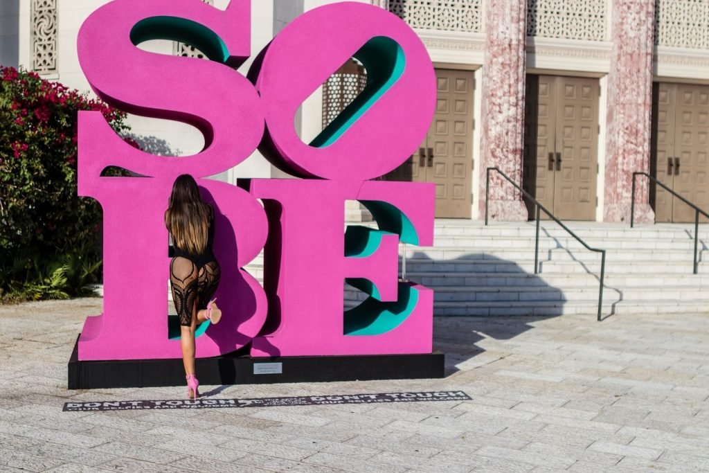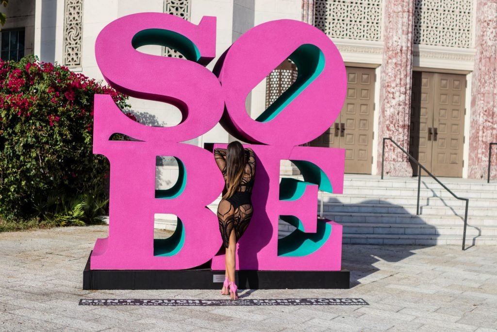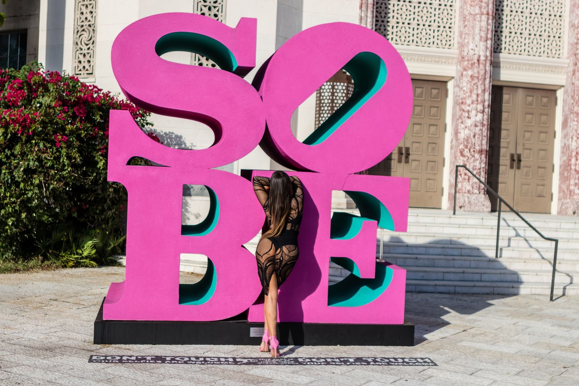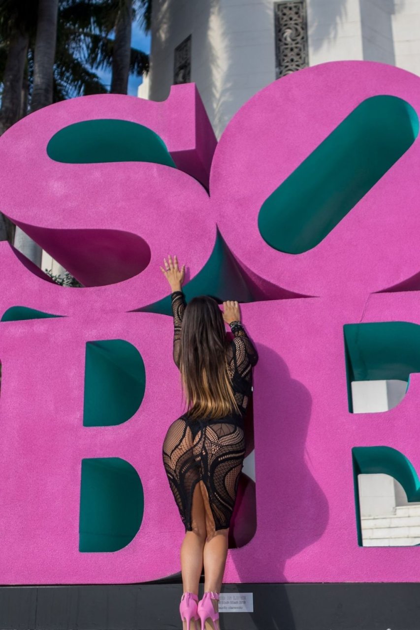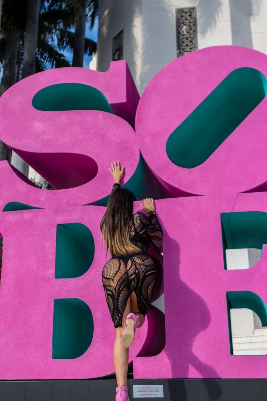 Итальянская модель и телеведущая Клаудия Романи прогуливается по Саут-Бич во время Гей-Прайда, 07.04.2019. Она позирует на фоне розовой вывески “Sobe Is Love”. Она привлекала внимание, надев кружевное прозрачное платье.