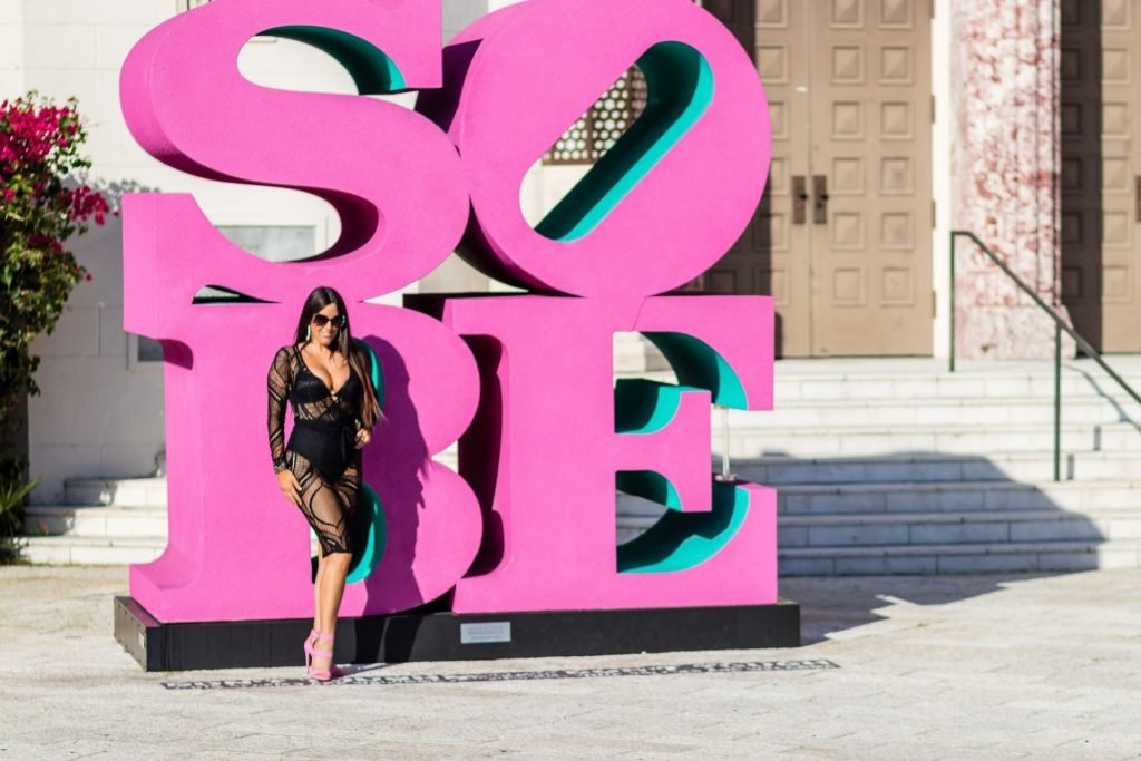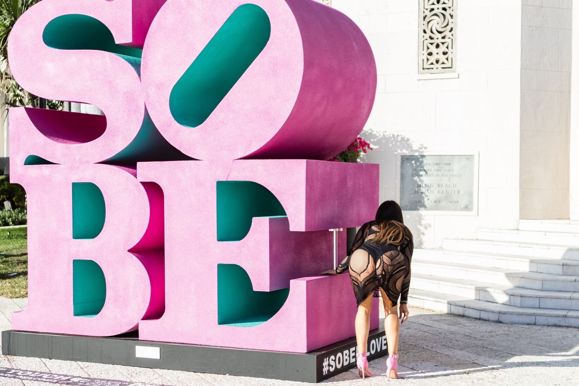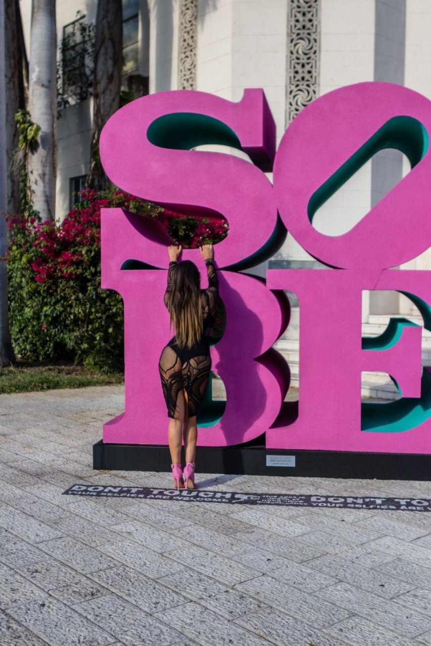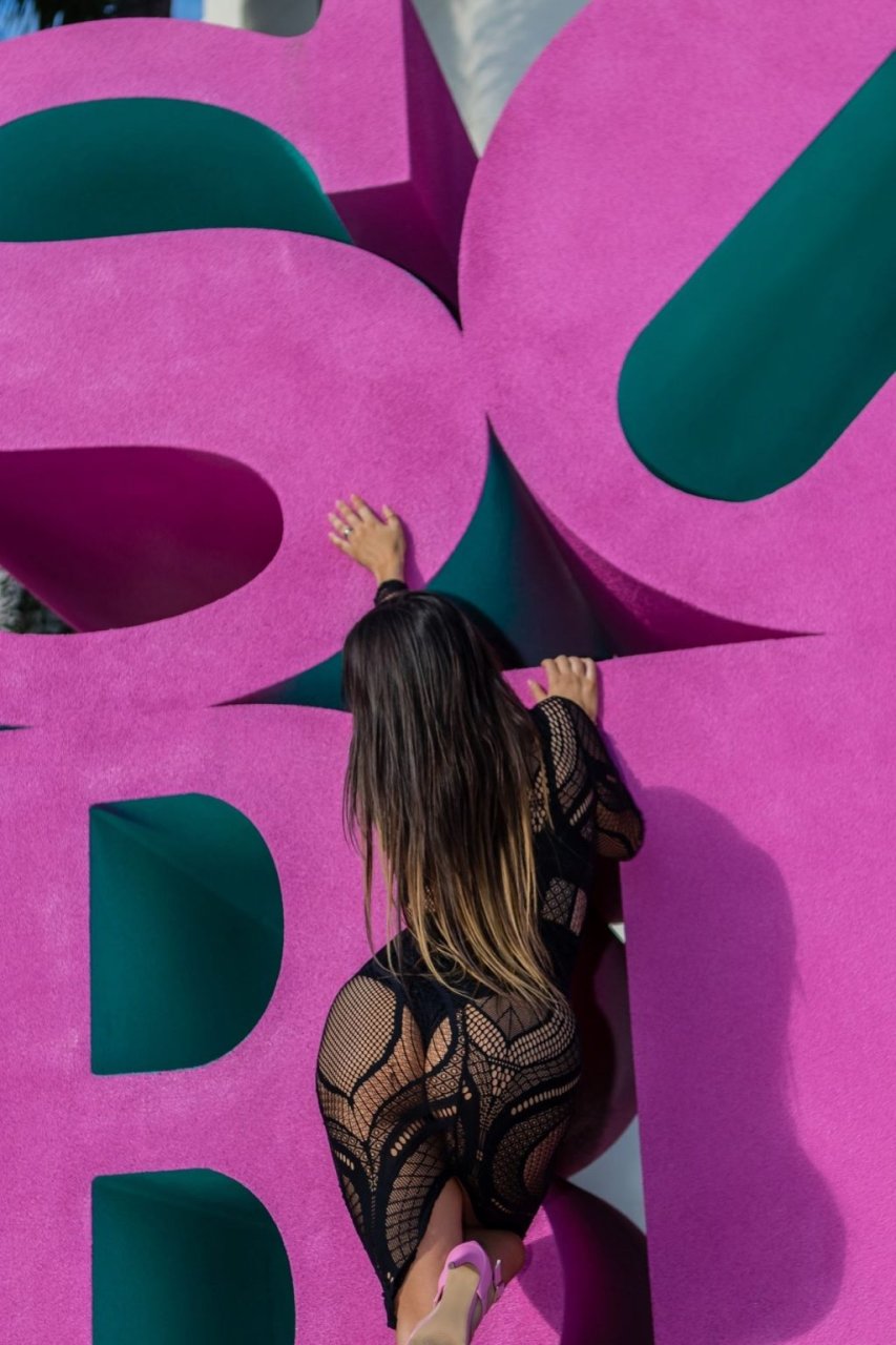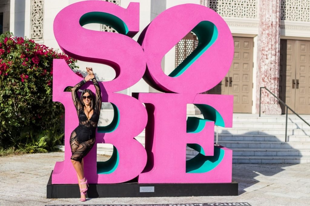 Итальянская модель и телеведущая Клаудия Романи прогуливается по Саут-Бич во время Гей-Прайда, 07.04.2019. Она позирует на фоне розовой вывески “Sobe Is Love”. Она привлекала внимание, надев кружевное прозрачное платье.