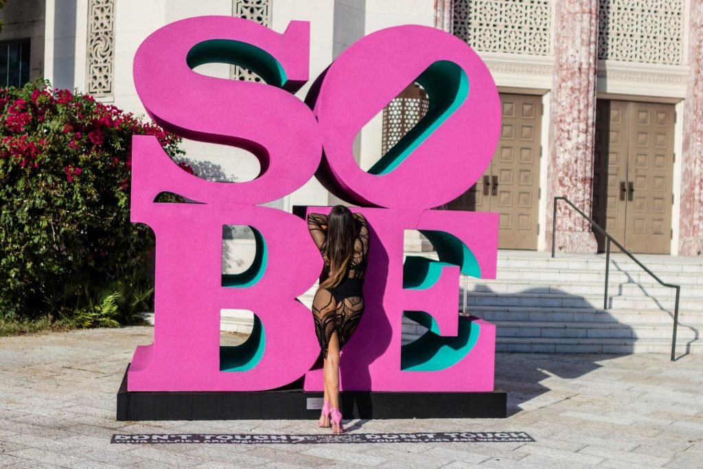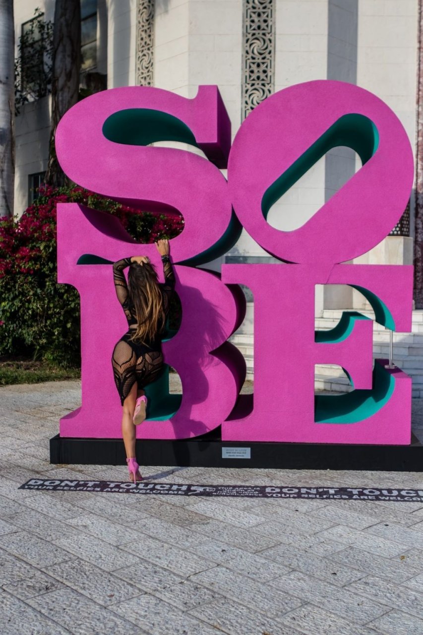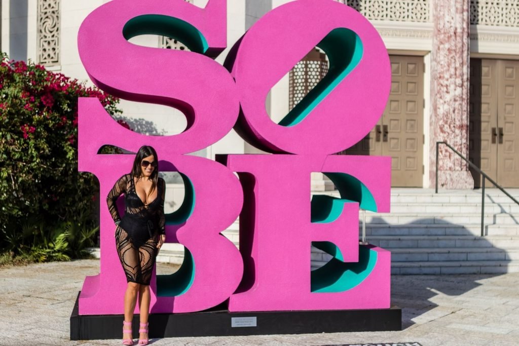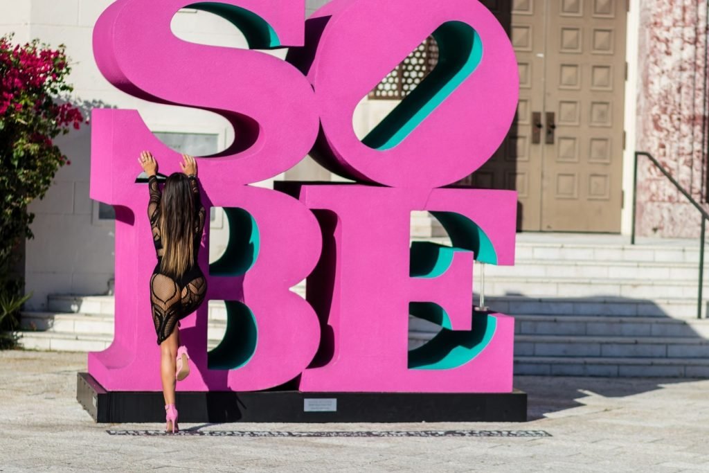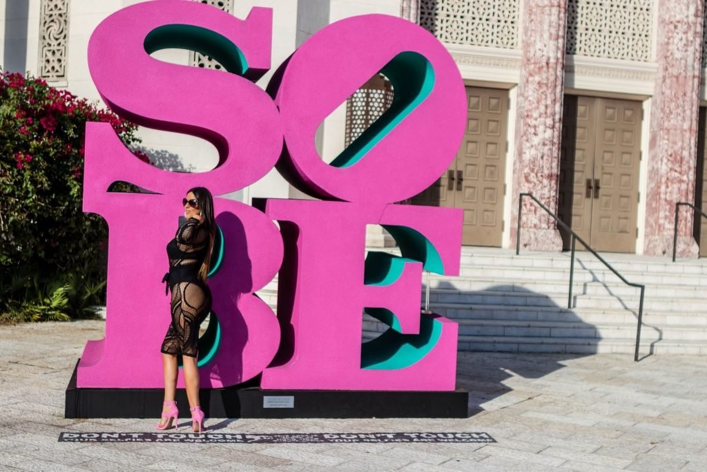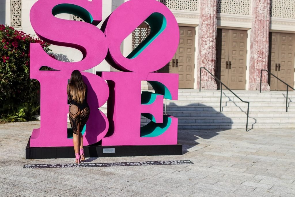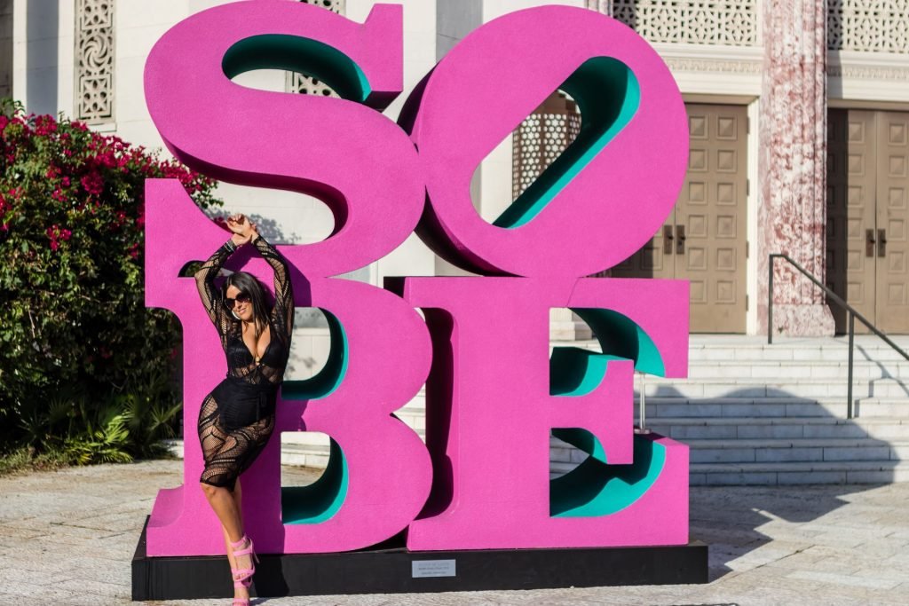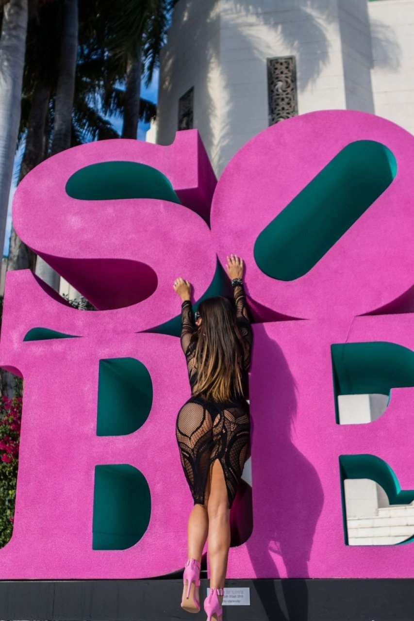 Итальянская модель и телеведущая Клаудия Романи прогуливается по Саут-Бич во время Гей-Прайда, 07.04.2019. Она позирует на фоне розовой вывески “Sobe Is Love”. Она привлекала внимание, надев кружевное прозрачное платье.