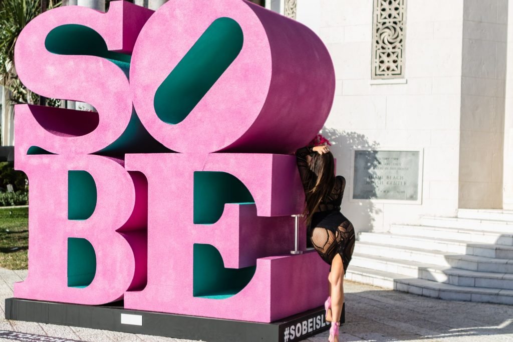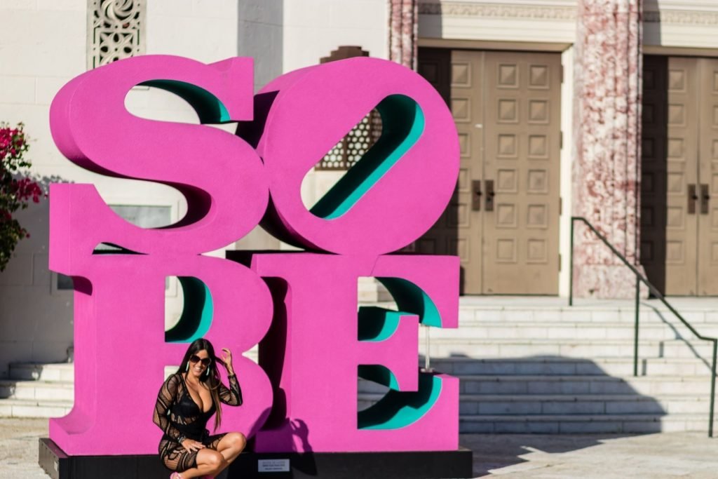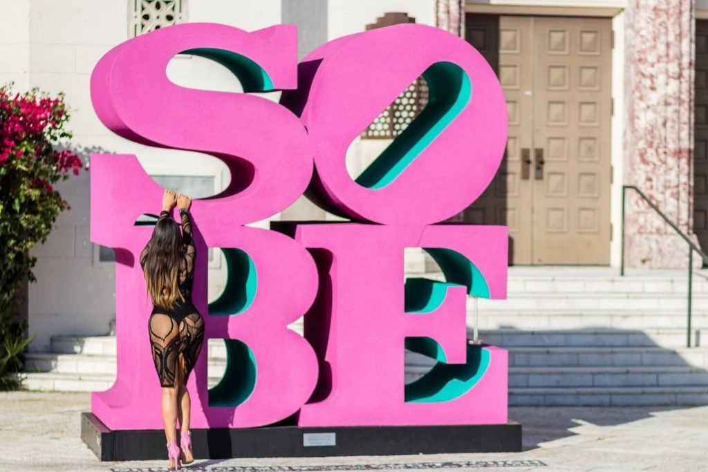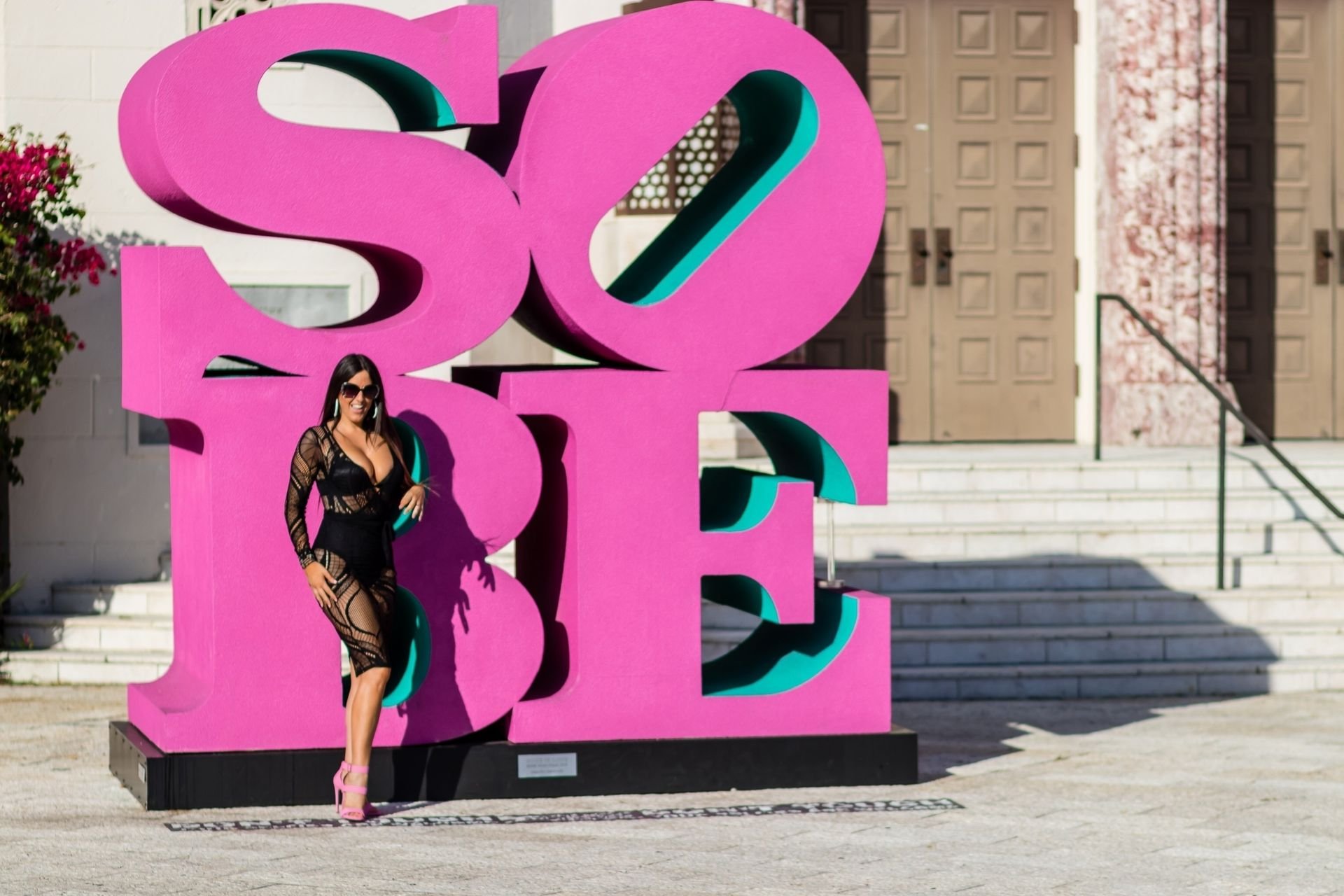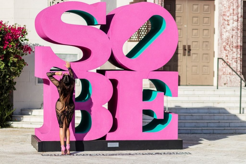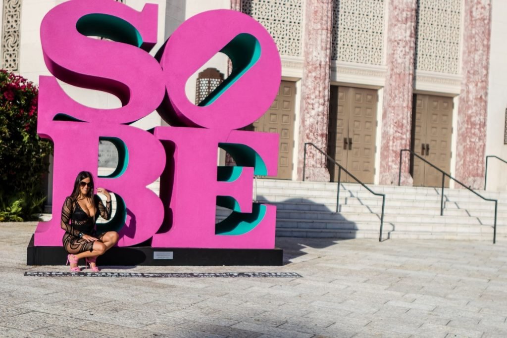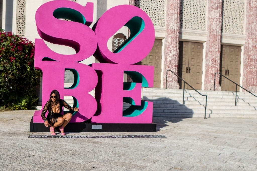 Итальянская модель и телеведущая Клаудия Романи прогуливается по Саут-Бич во время Гей-Прайда, 07.04.2019. Она позирует на фоне розовой вывески “Sobe Is Love”. Она привлекала внимание, надев кружевное прозрачное платье.