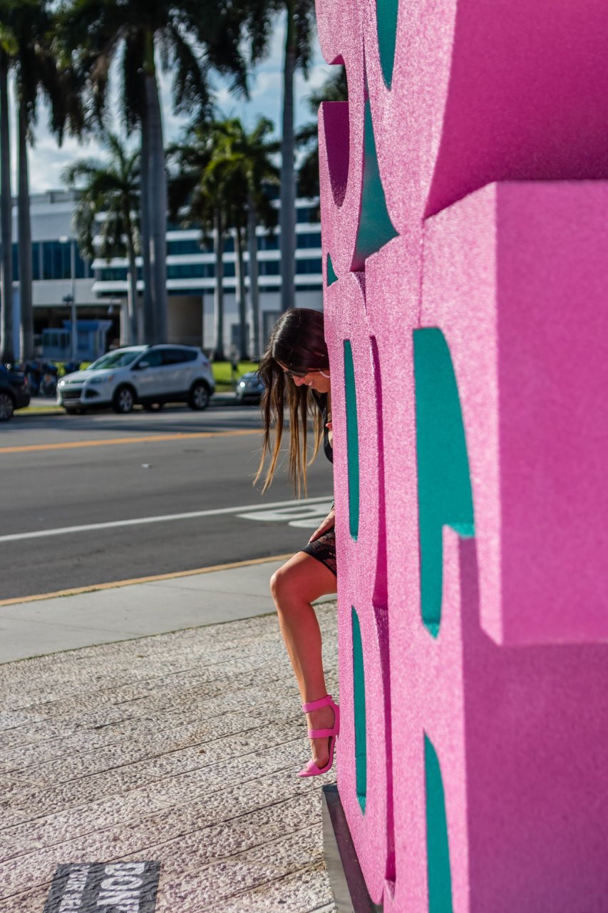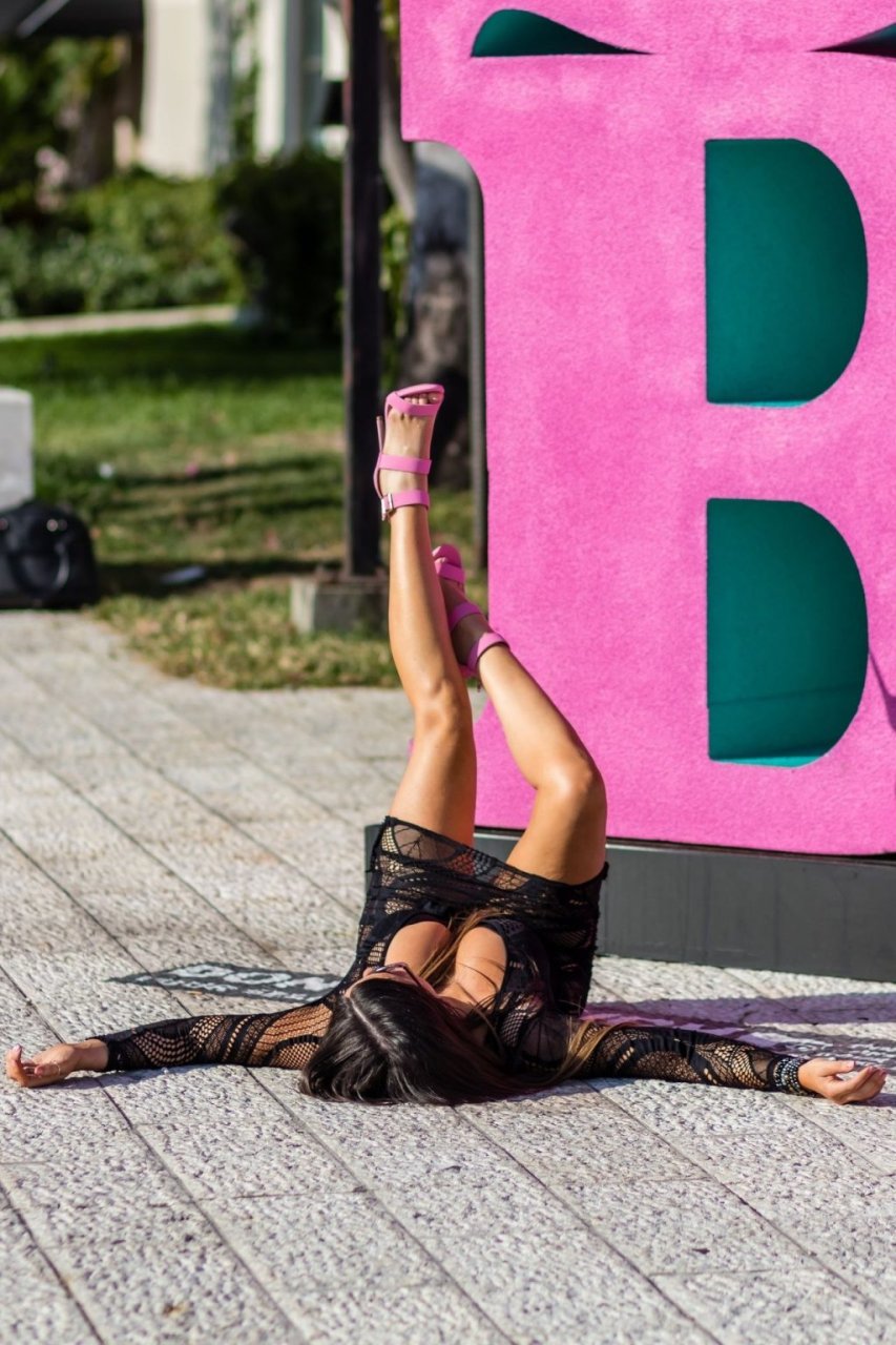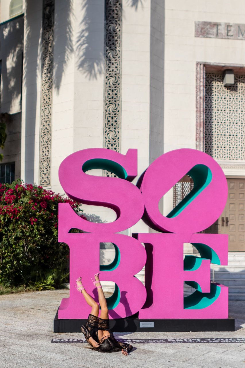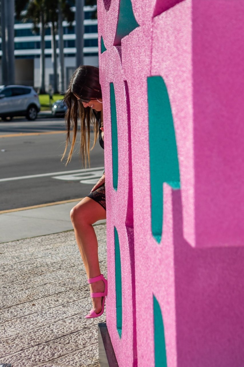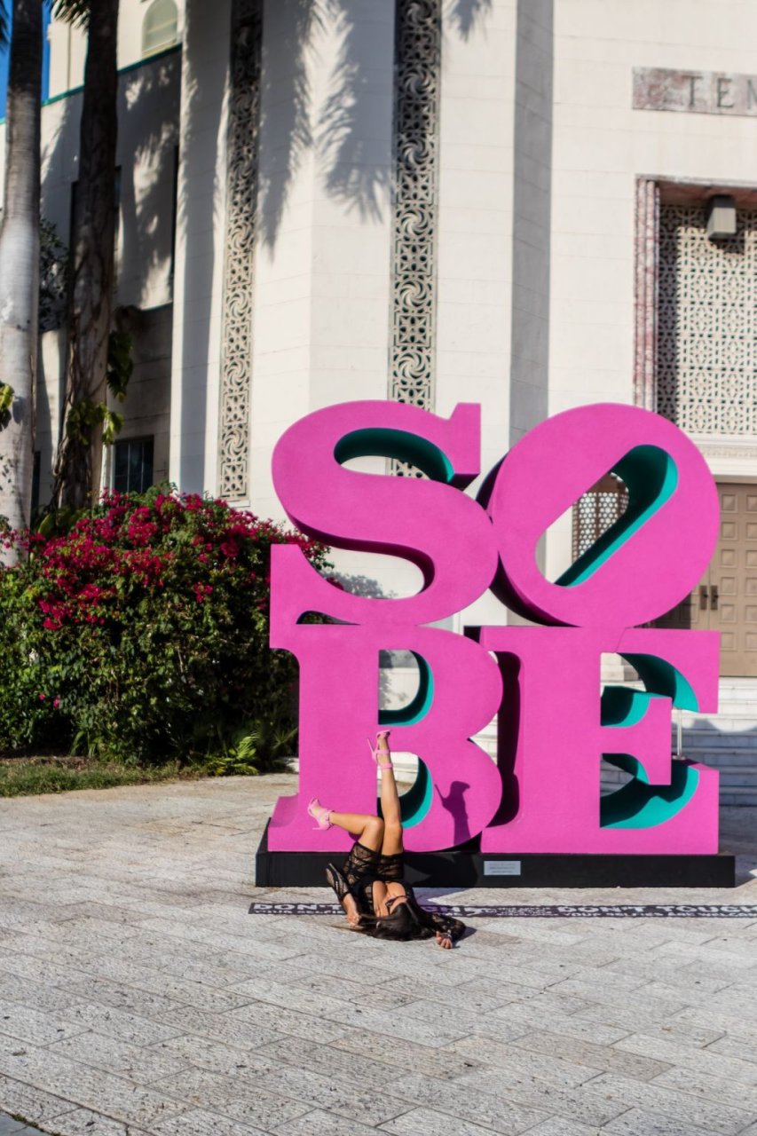 Итальянская модель и телеведущая Клаудия Романи прогуливается по Саут-Бич во время Гей-Прайда, 07.04.2019. Она позирует на фоне розовой вывески “Sobe Is Love”. Она привлекала внимание, надев кружевное прозрачное платье.
