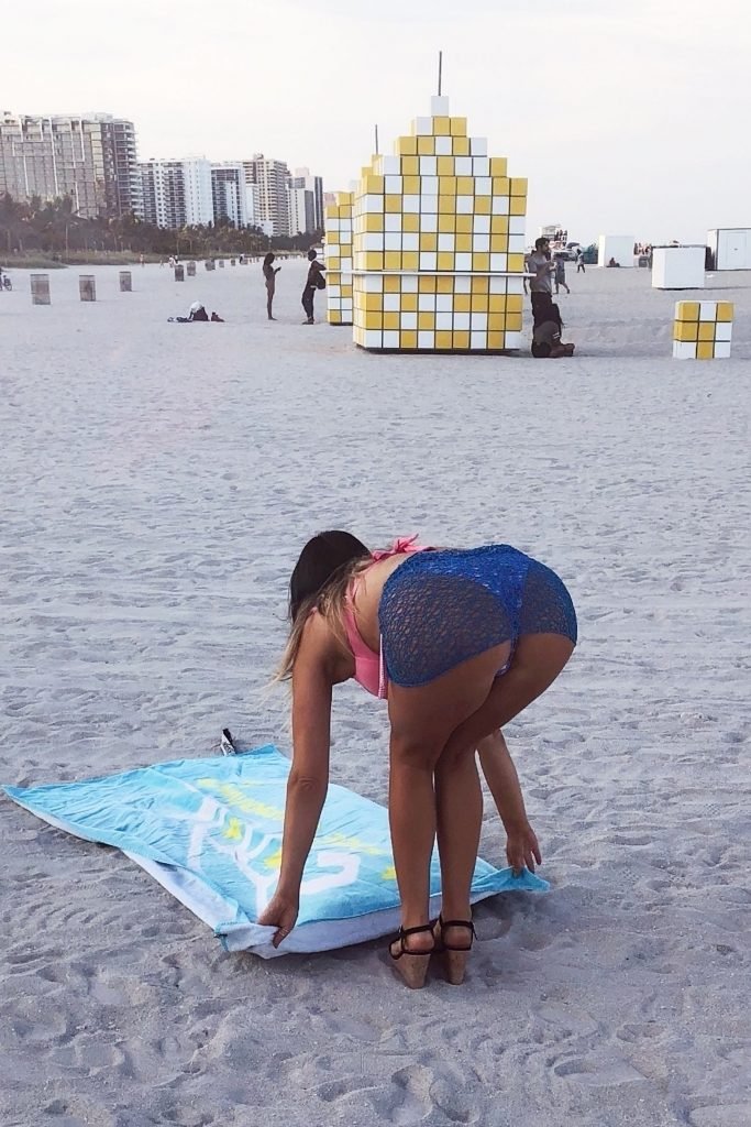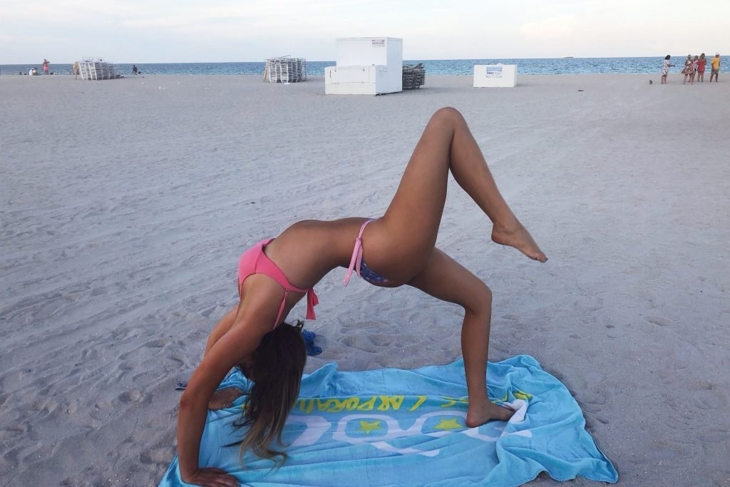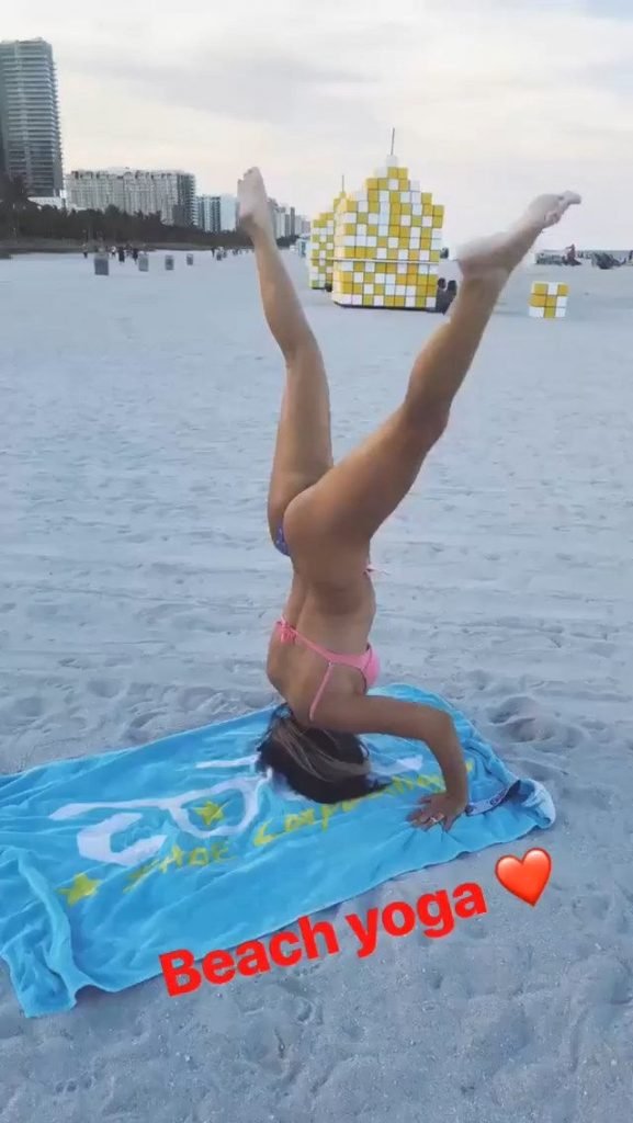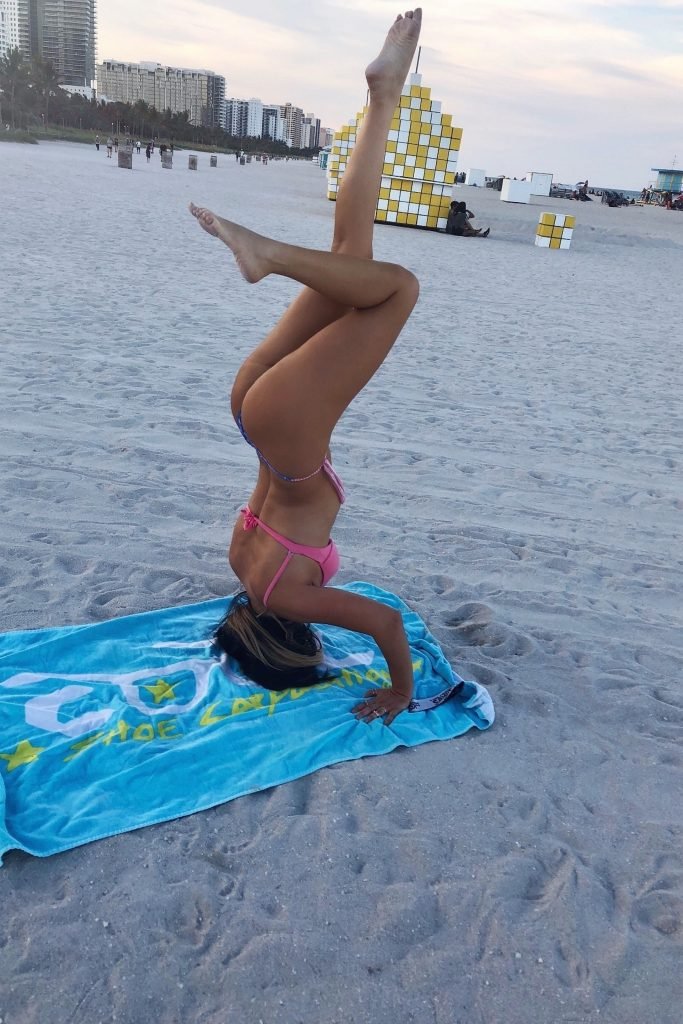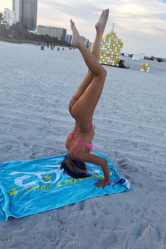 Итальянская модель и звезда реалити-шоу Клаудия Романи была замечена отдыхающей на Саут-Бич после Недели Купальников, 16.06.2018. Модель загорает топлес и выполняет очень сексуальные позы йоги, демонстрируя свою гибкость. Местная жительница Майами-Бич была в крошечном розово-голубом бикини и была сильно загорелой.