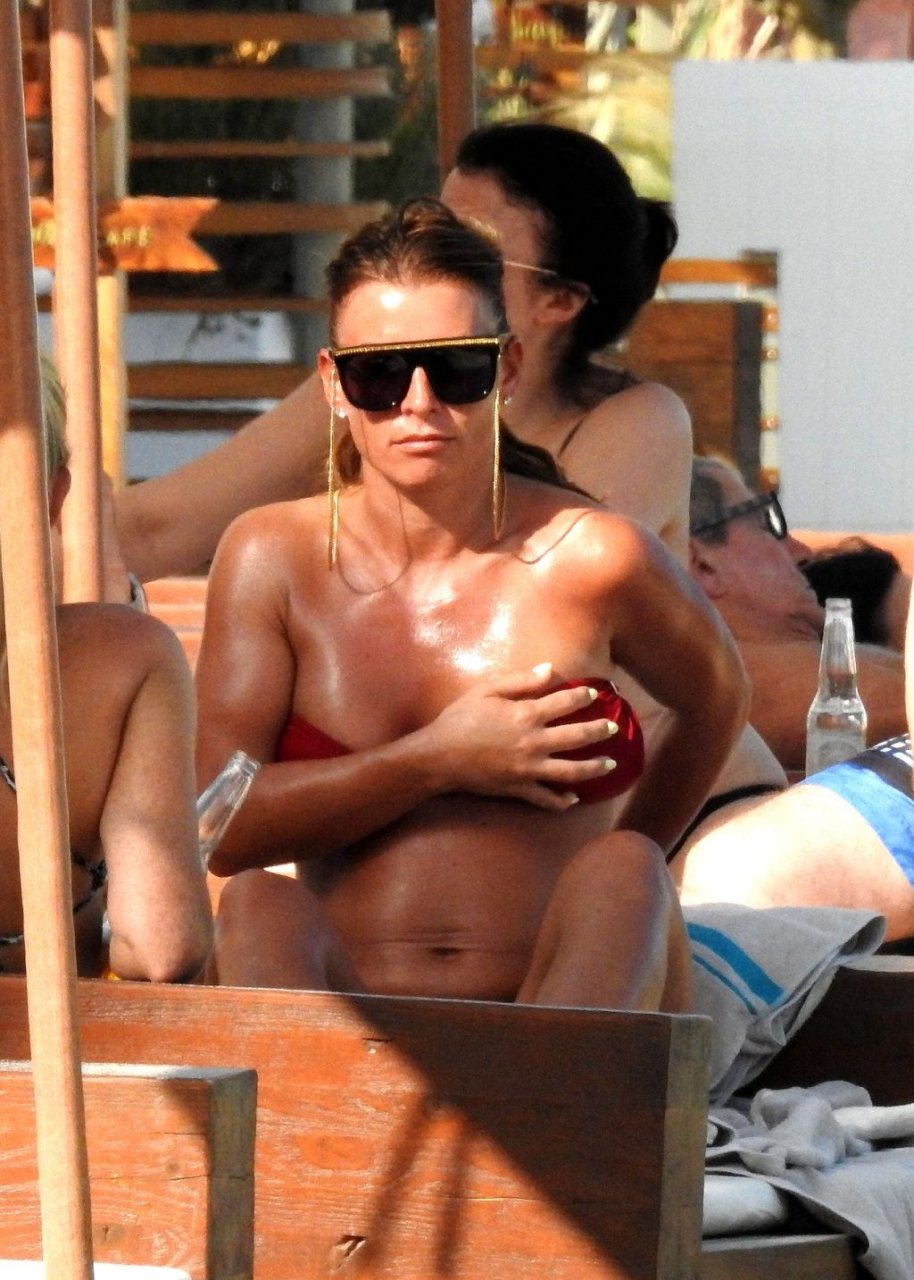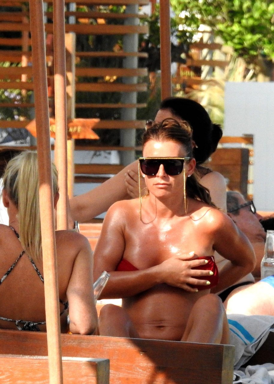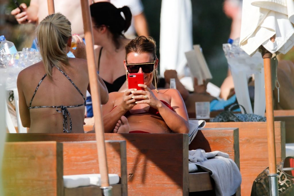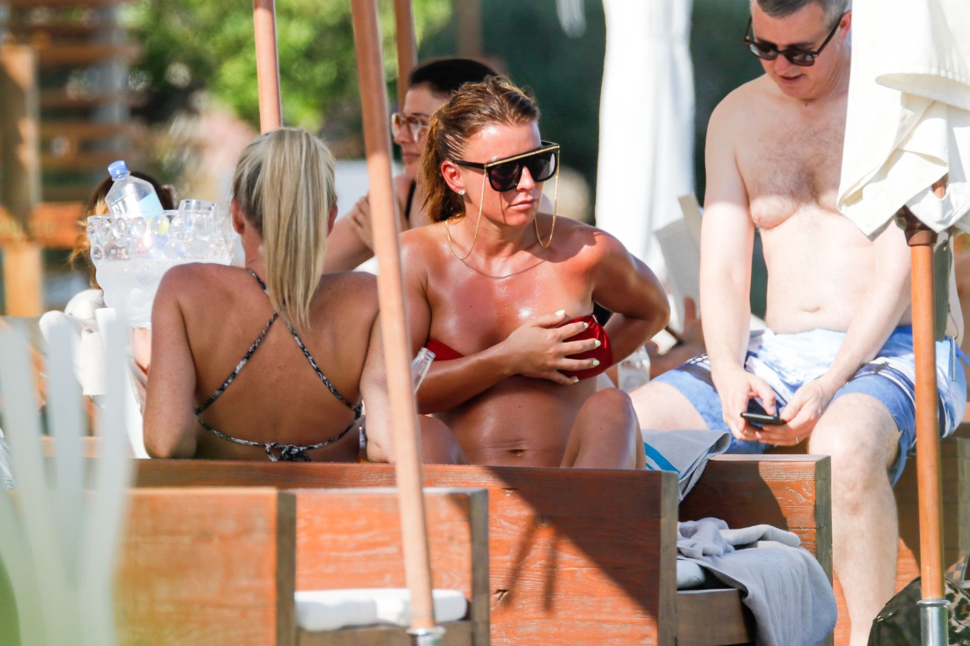 Коулин Руни проводит время на пляже в Ибице с друзьями, 07/11/2019. WAG выглядела потрясающе в красном двухпредметном купальнике, отдыхая на солнце на средиземноморском пляже.