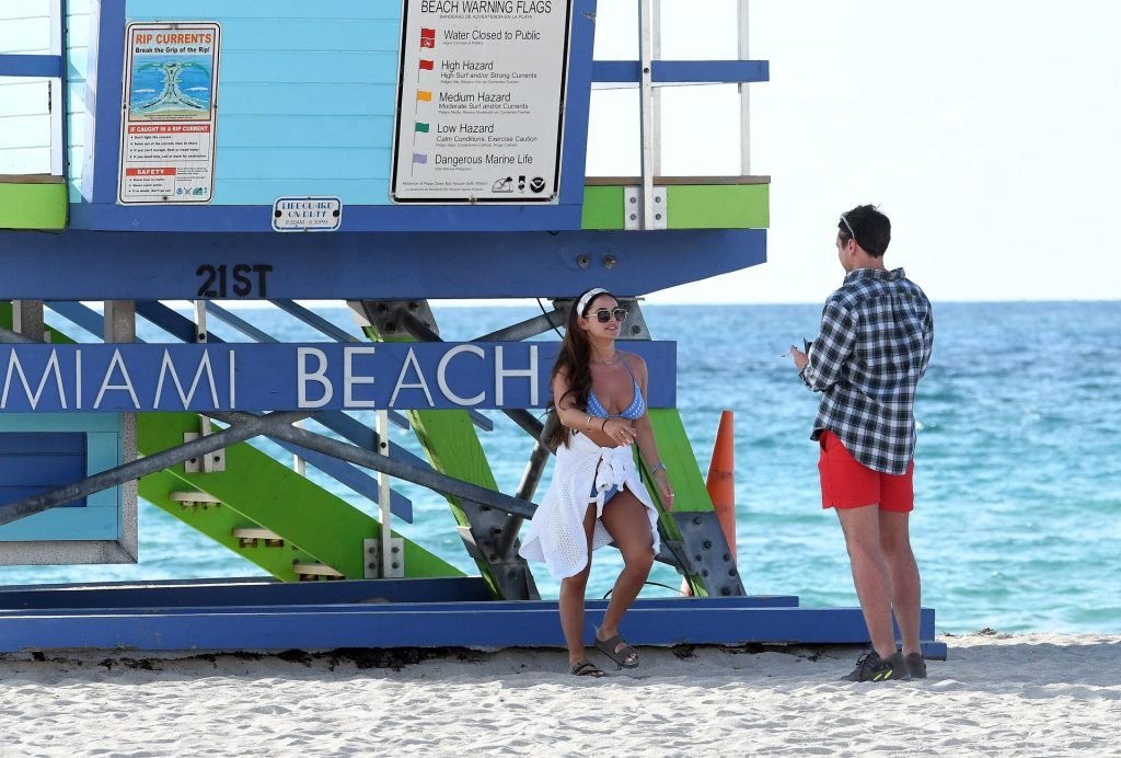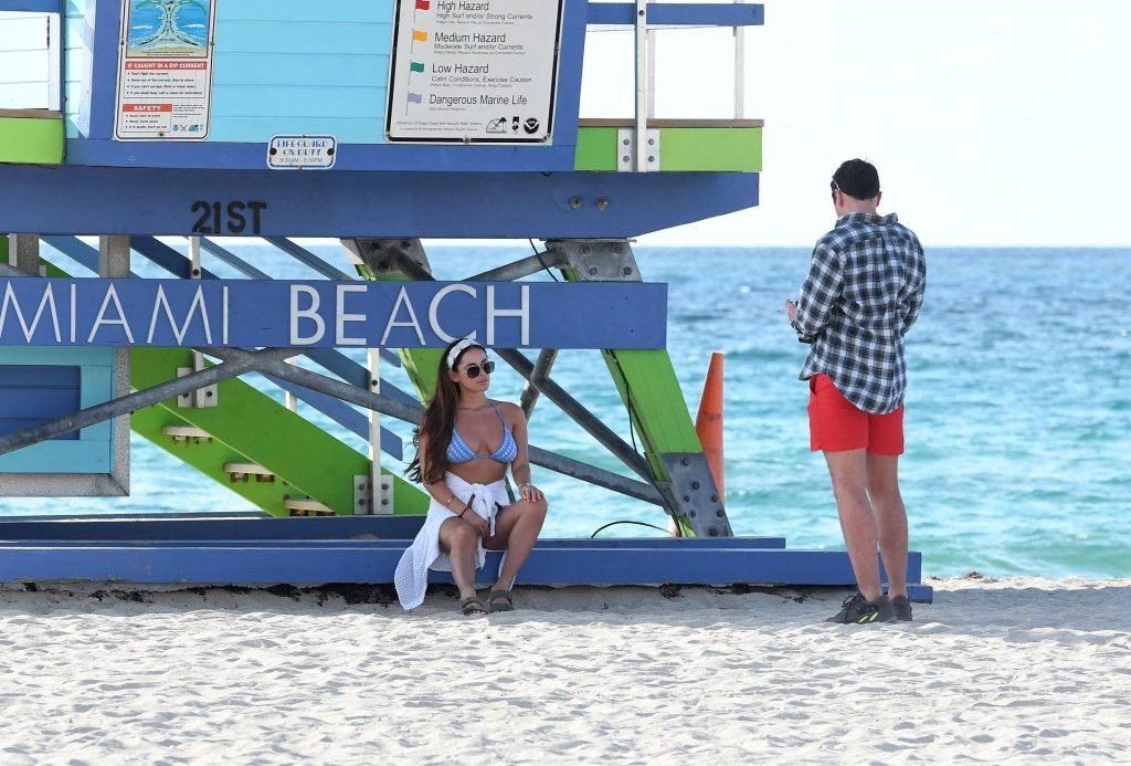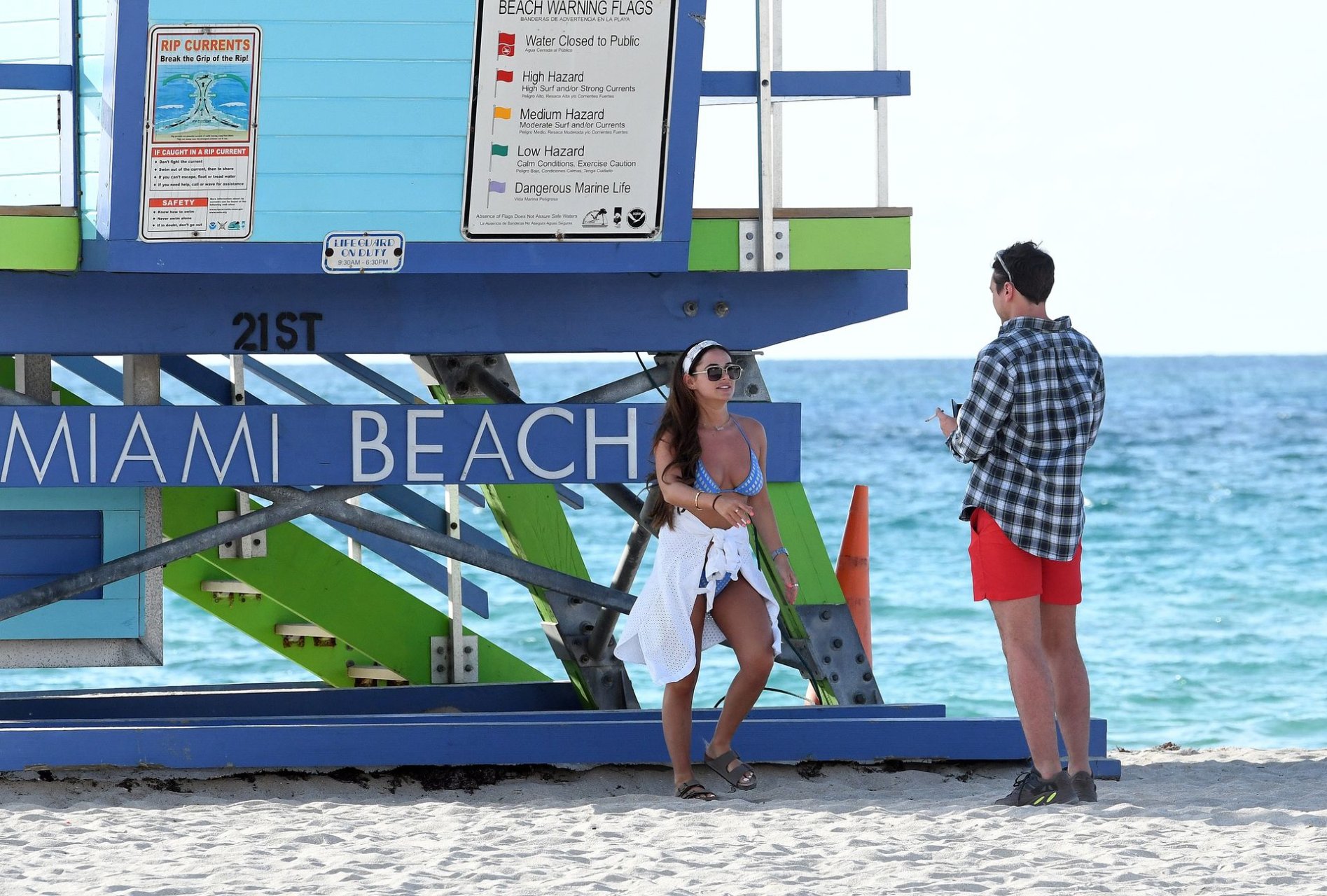 TOWIE звезда Кортни Грин носит голубой купальник, пока её парень Калум Бушби фотографирует её на пляже в Майами, 06/06/2019.