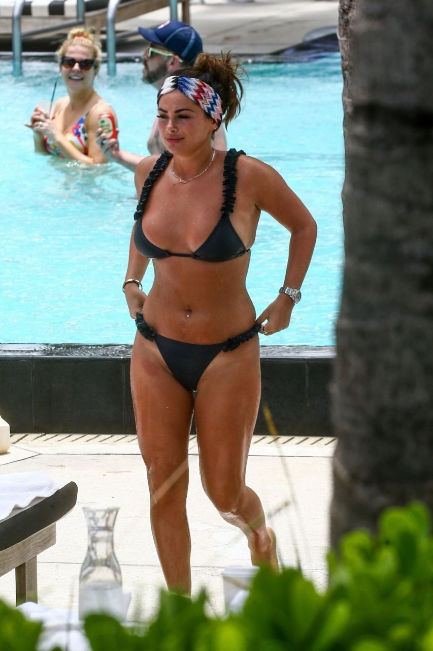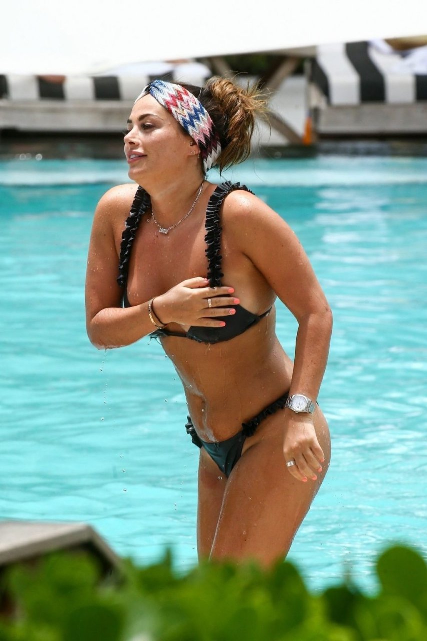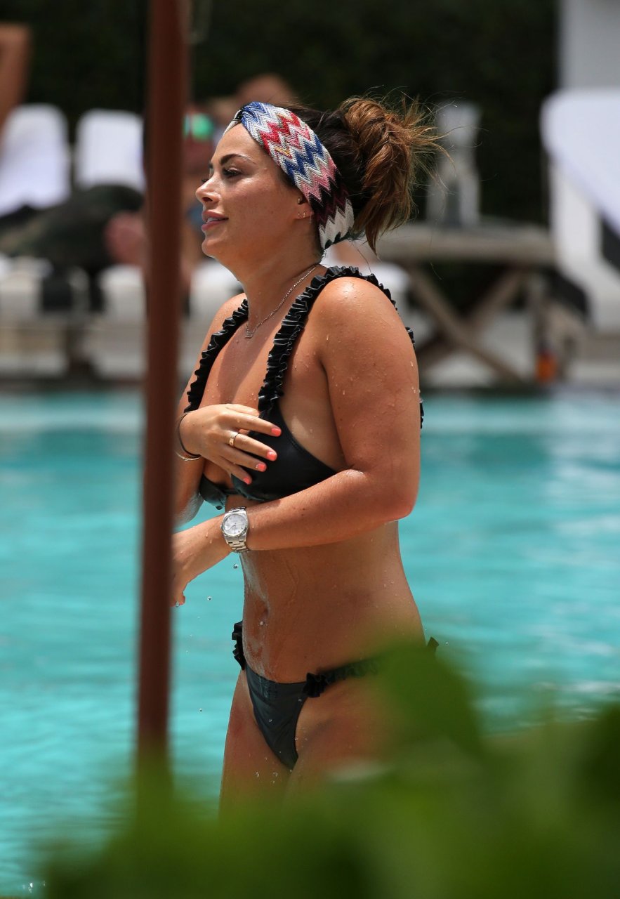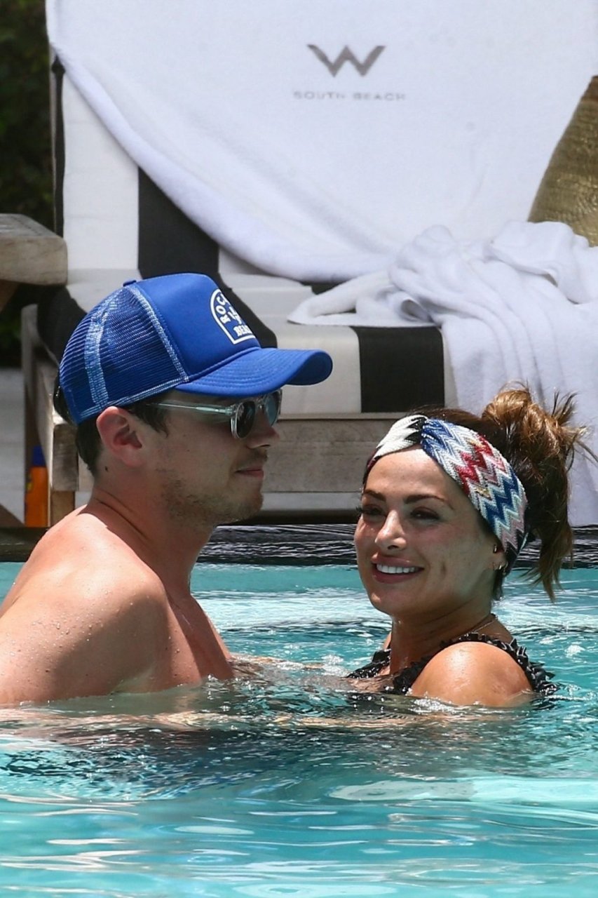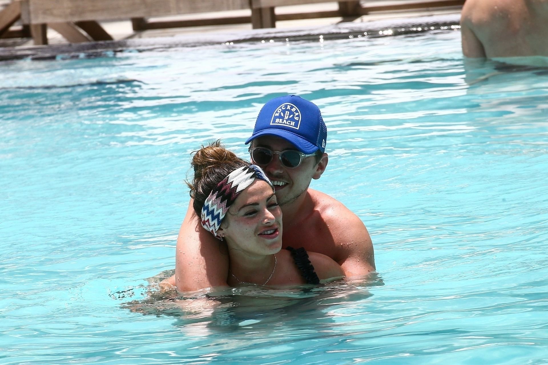 Звезда шоу TOWIE Кортни Грин в черном бикини с оборками, демонстрирует публичные проявления чувств в бассейне отеля со своим парнем Калумом Бушби в Майами-Бич, 07.06.2019.