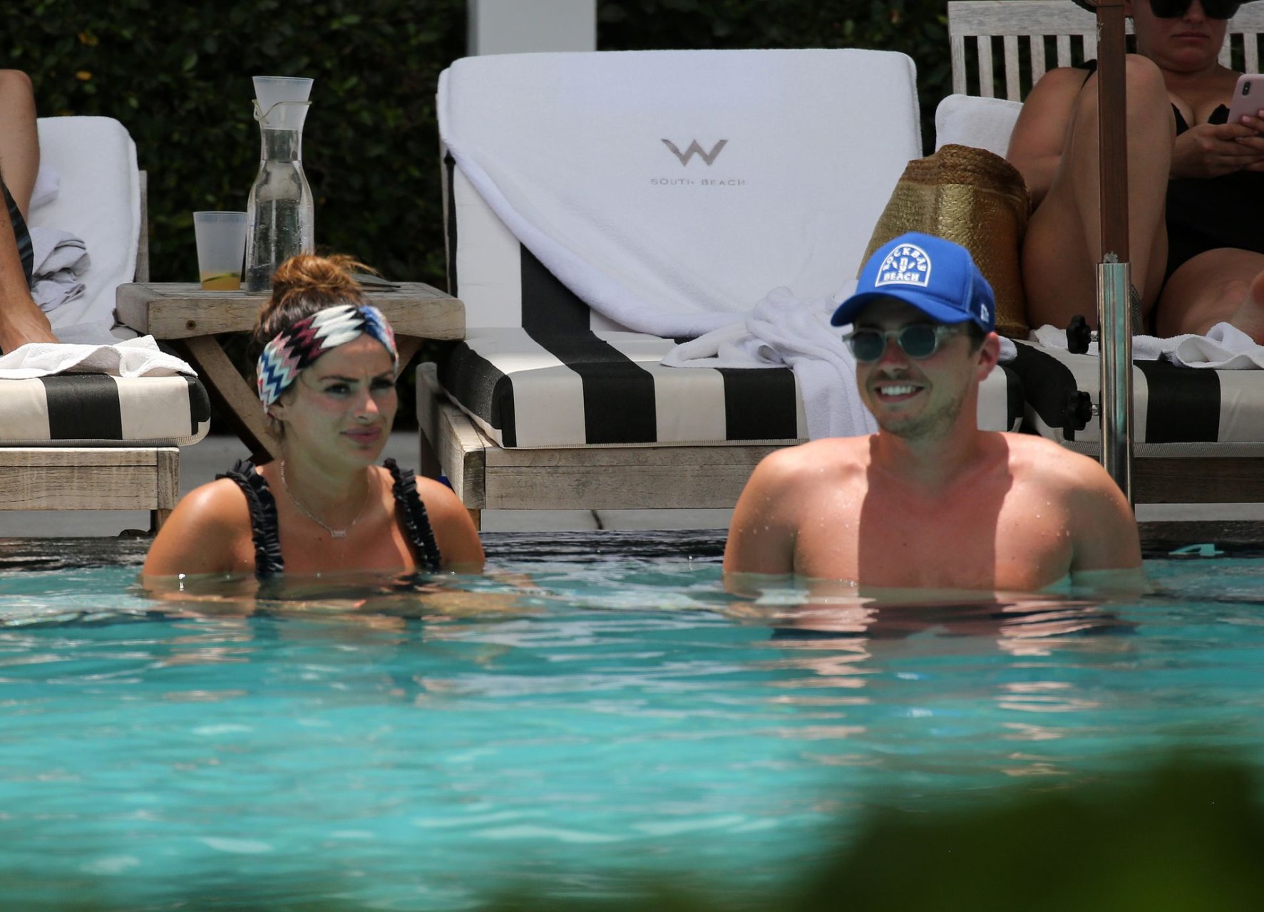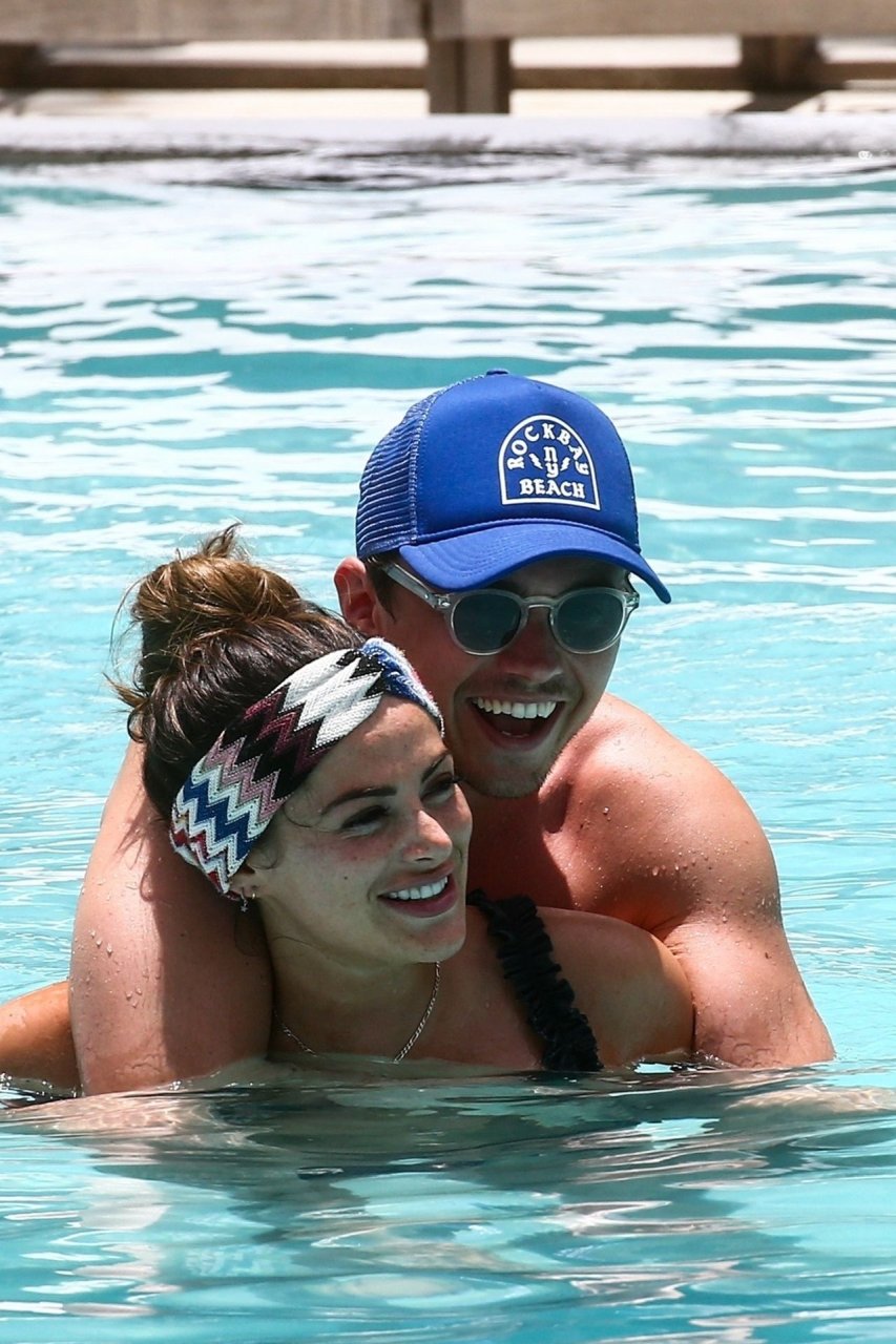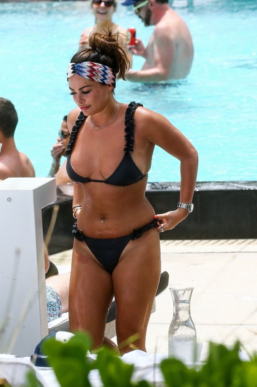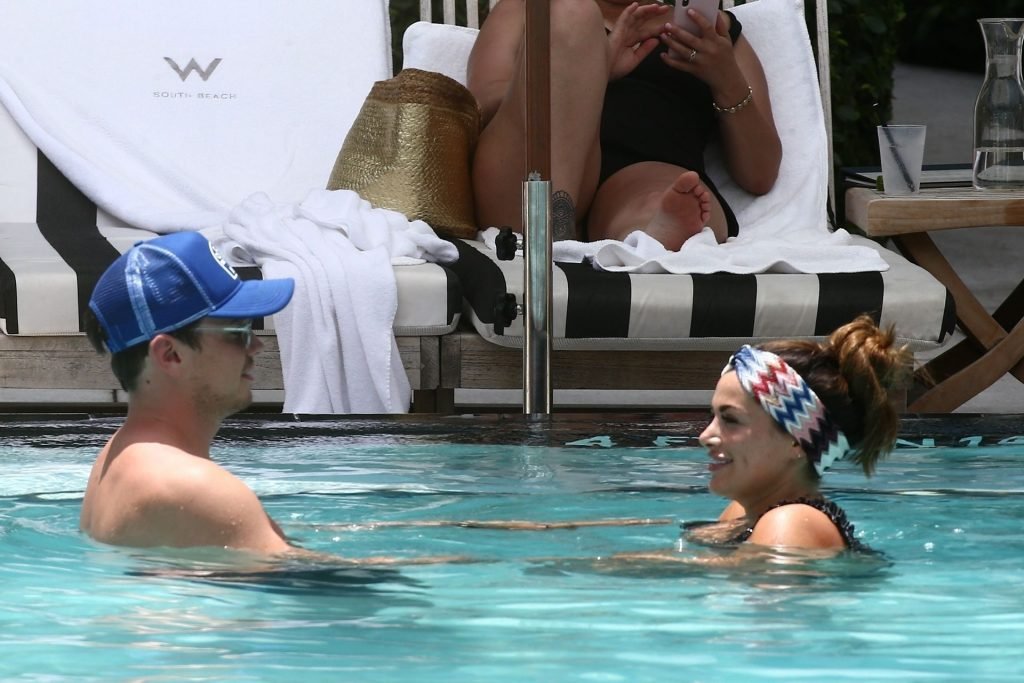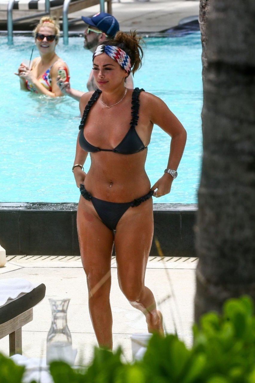 Звезда шоу TOWIE Кортни Грин в черном бикини с оборками, демонстрирует публичные проявления чувств в бассейне отеля со своим парнем Калумом Бушби в Майами-Бич, 07.06.2019.