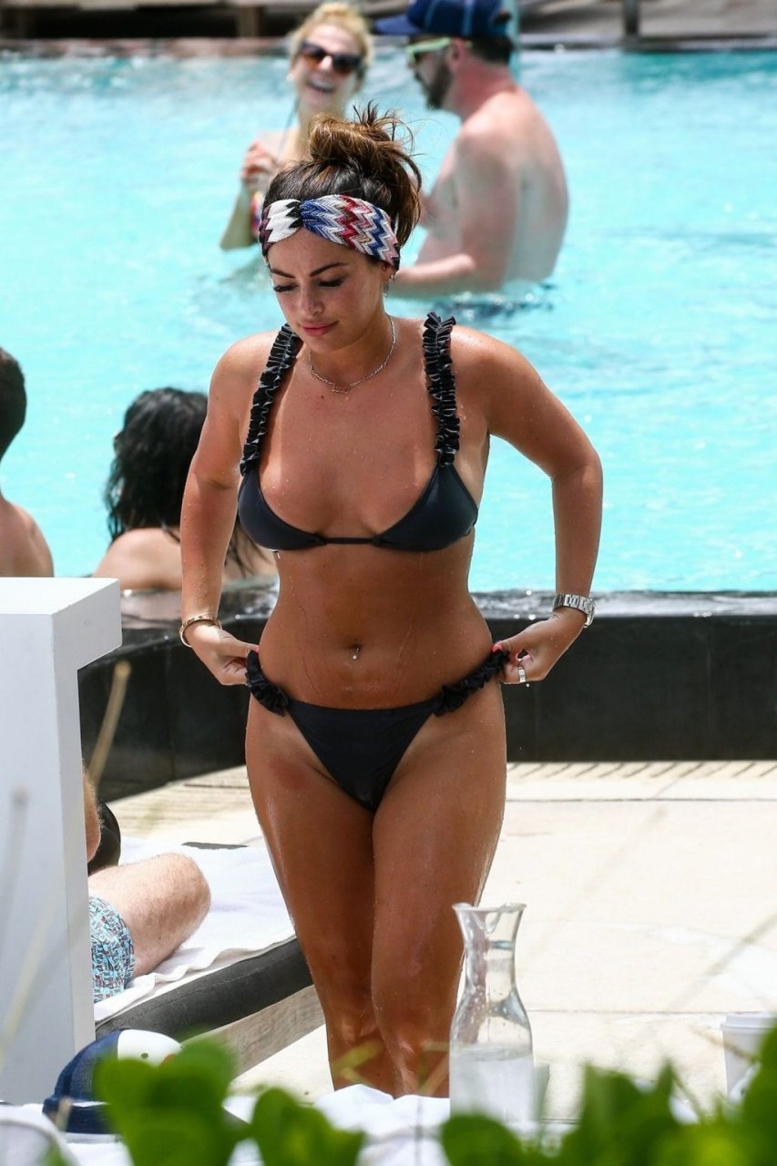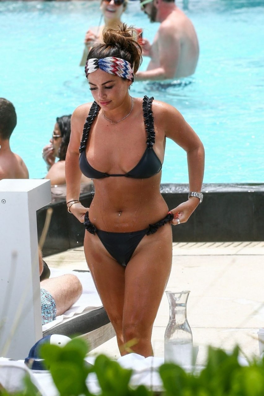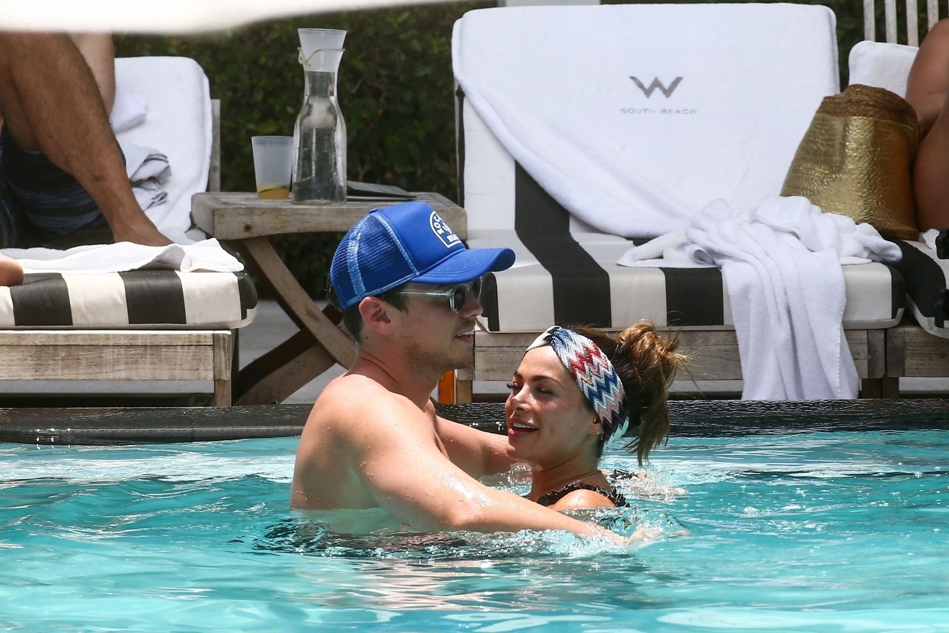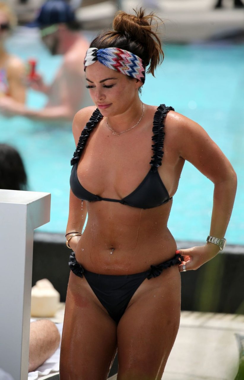 Звезда шоу TOWIE Кортни Грин в черном бикини с оборками, демонстрирует публичные проявления чувств в бассейне отеля со своим парнем Калумом Бушби в Майами-Бич, 07.06.2019.