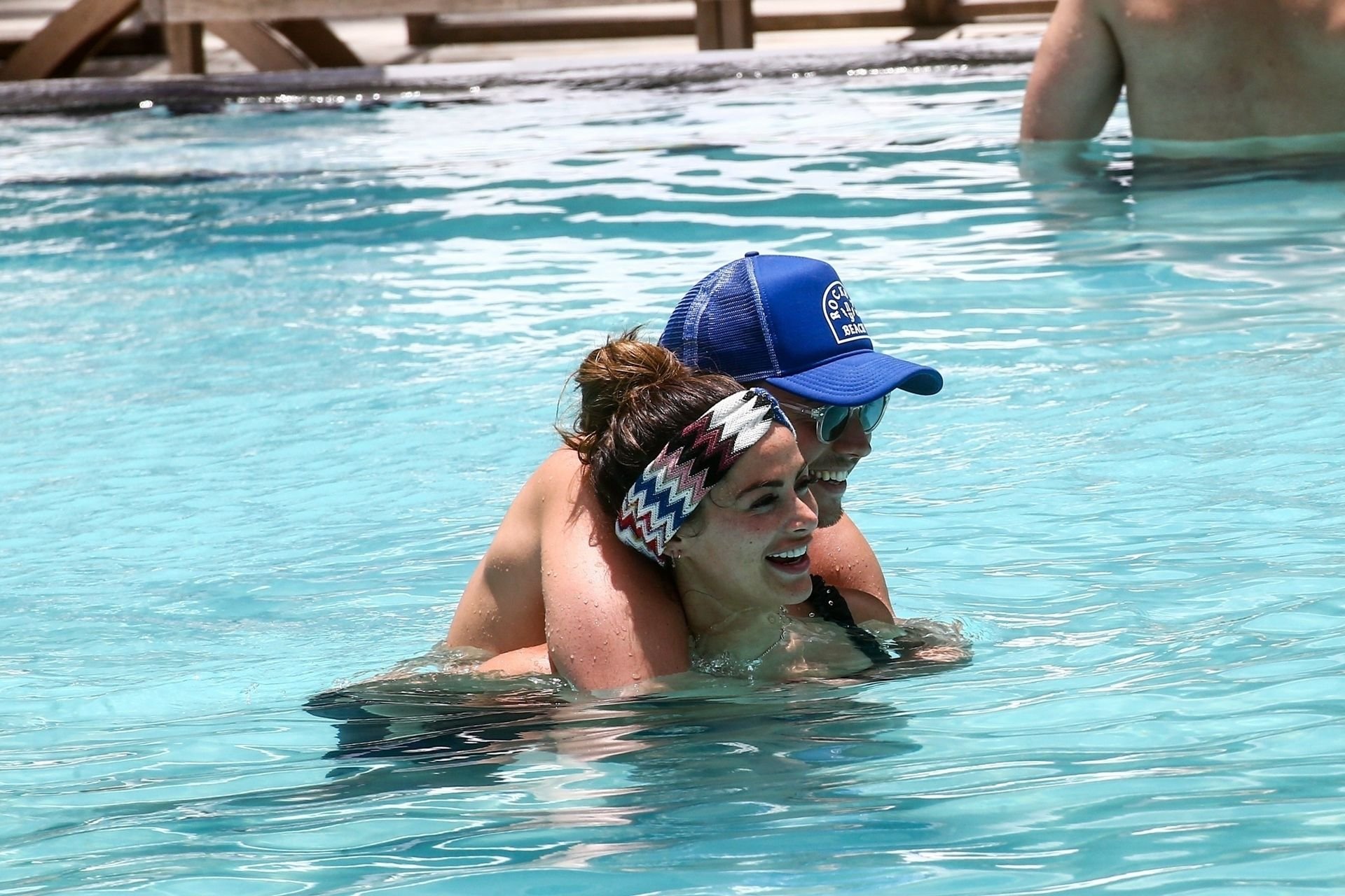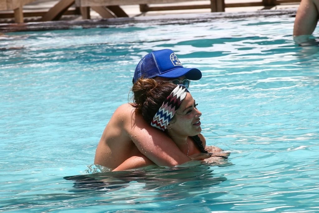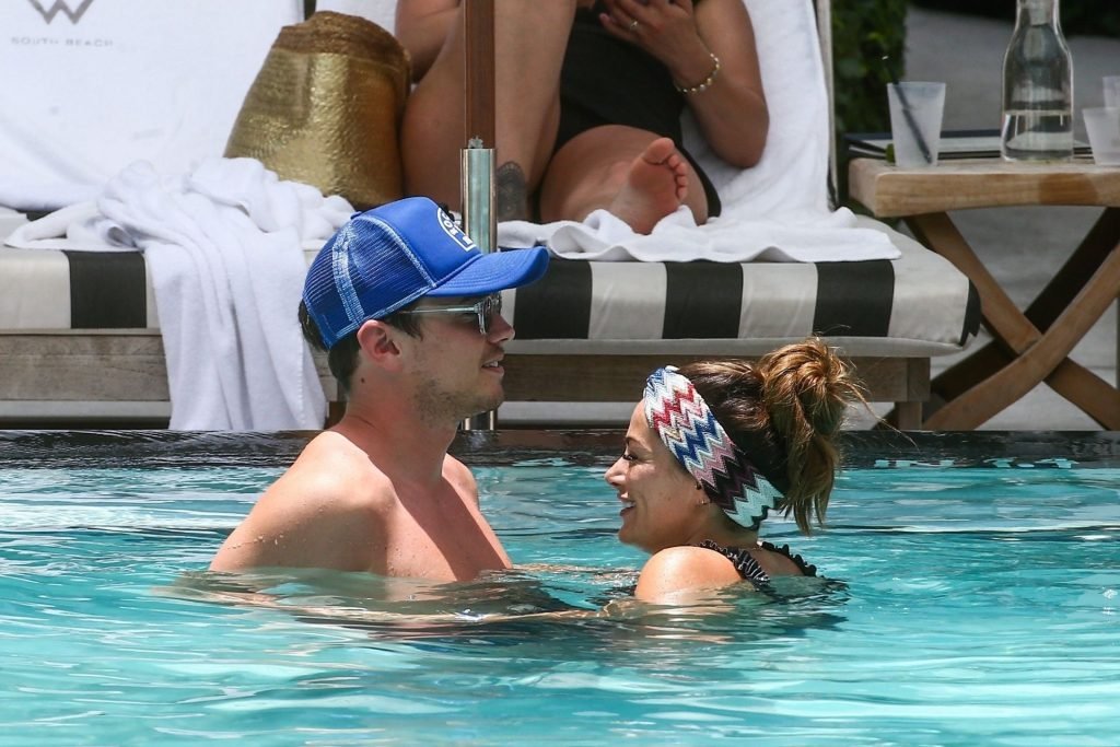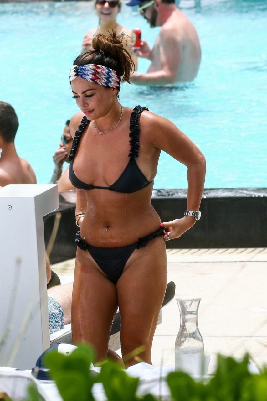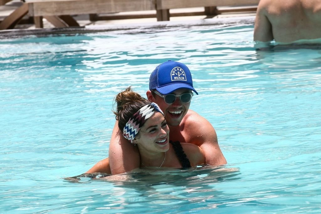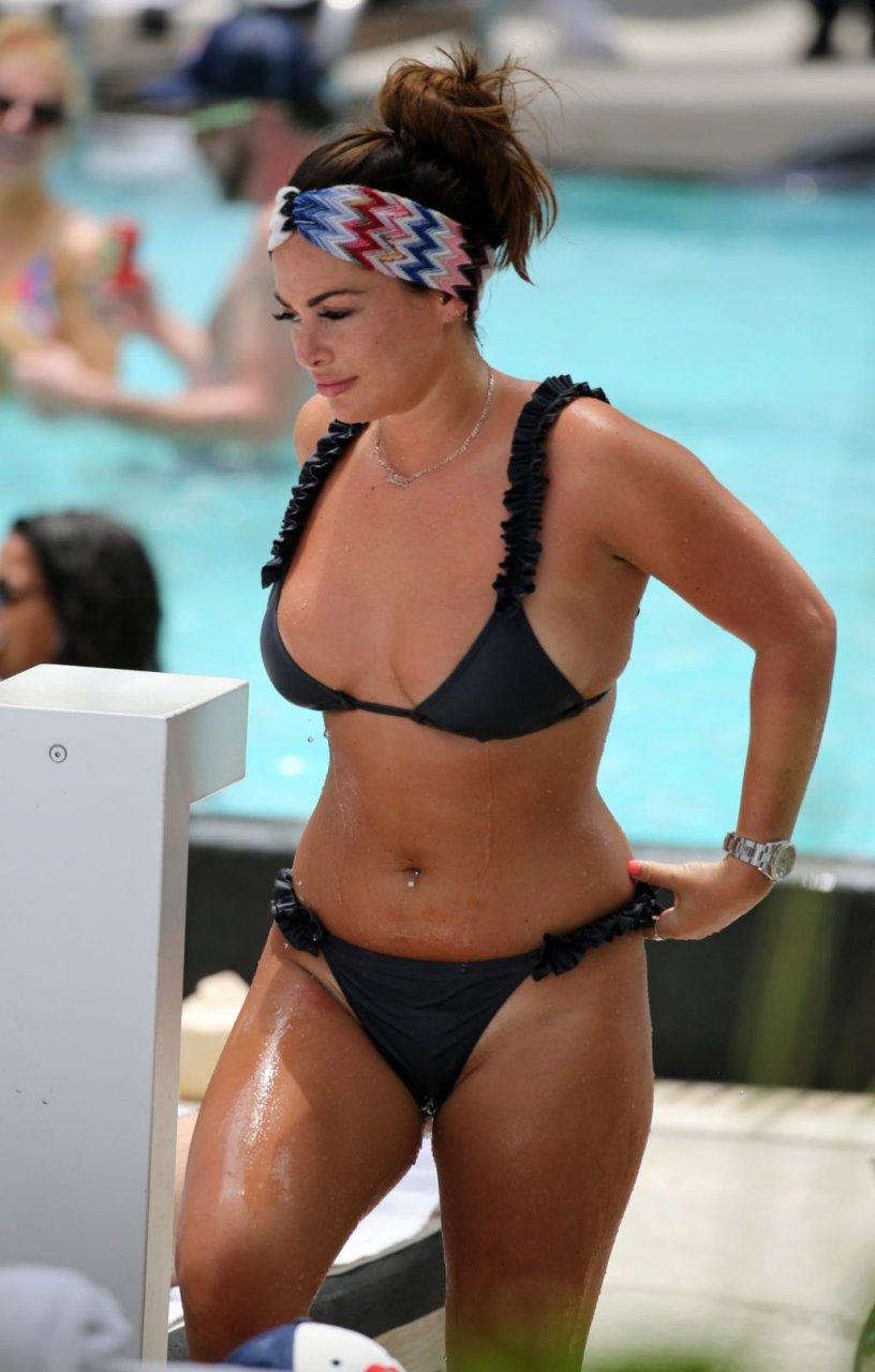 Звезда шоу TOWIE Кортни Грин в черном бикини с оборками, демонстрирует публичные проявления чувств в бассейне отеля со своим парнем Калумом Бушби в Майами-Бич, 07.06.2019.