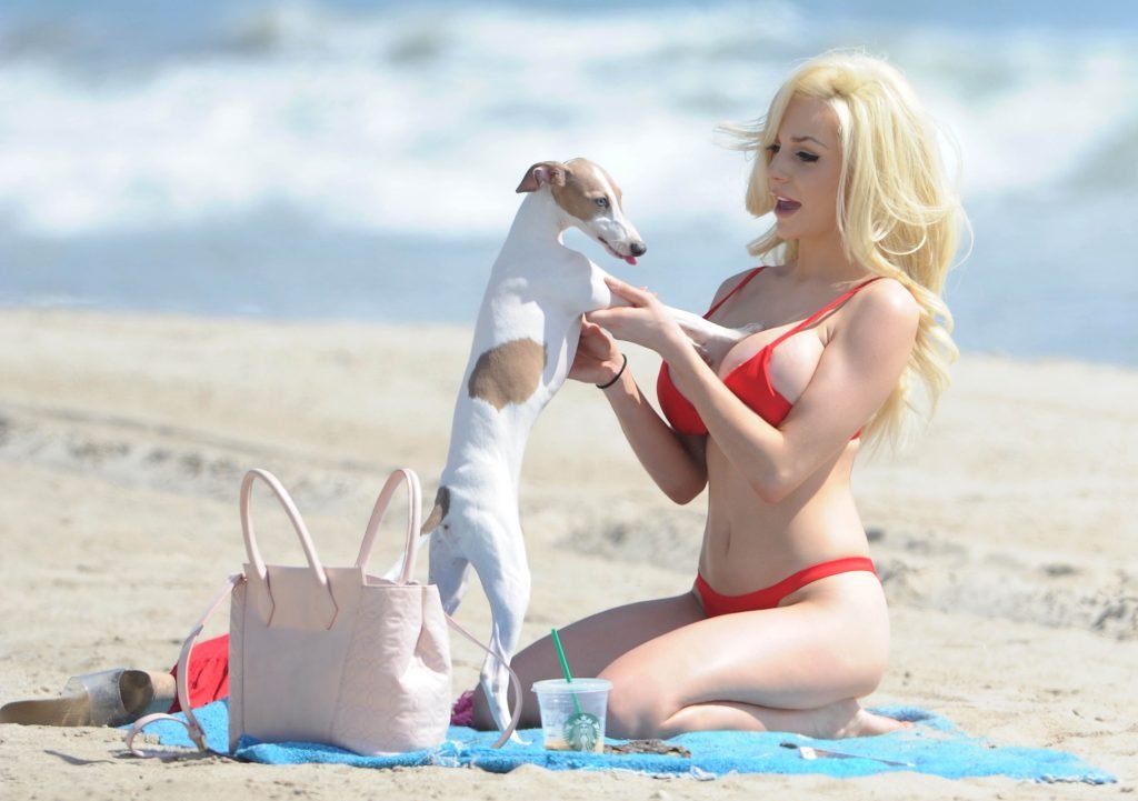 Пышногрудая блондинка Кортни Стодден (23) проводит день со своим щенком на пляже в Лос-Анджелесе, 29.08.2017.