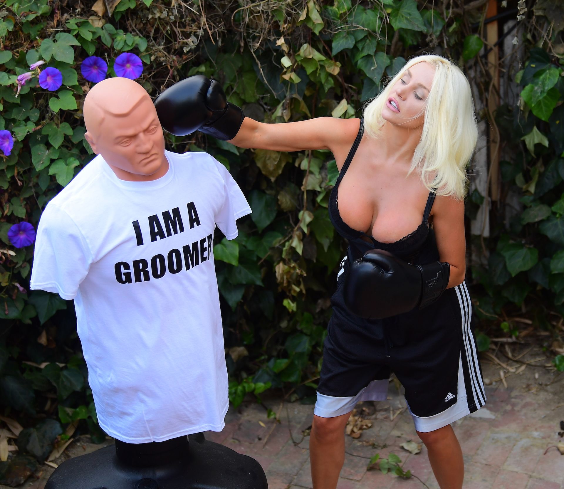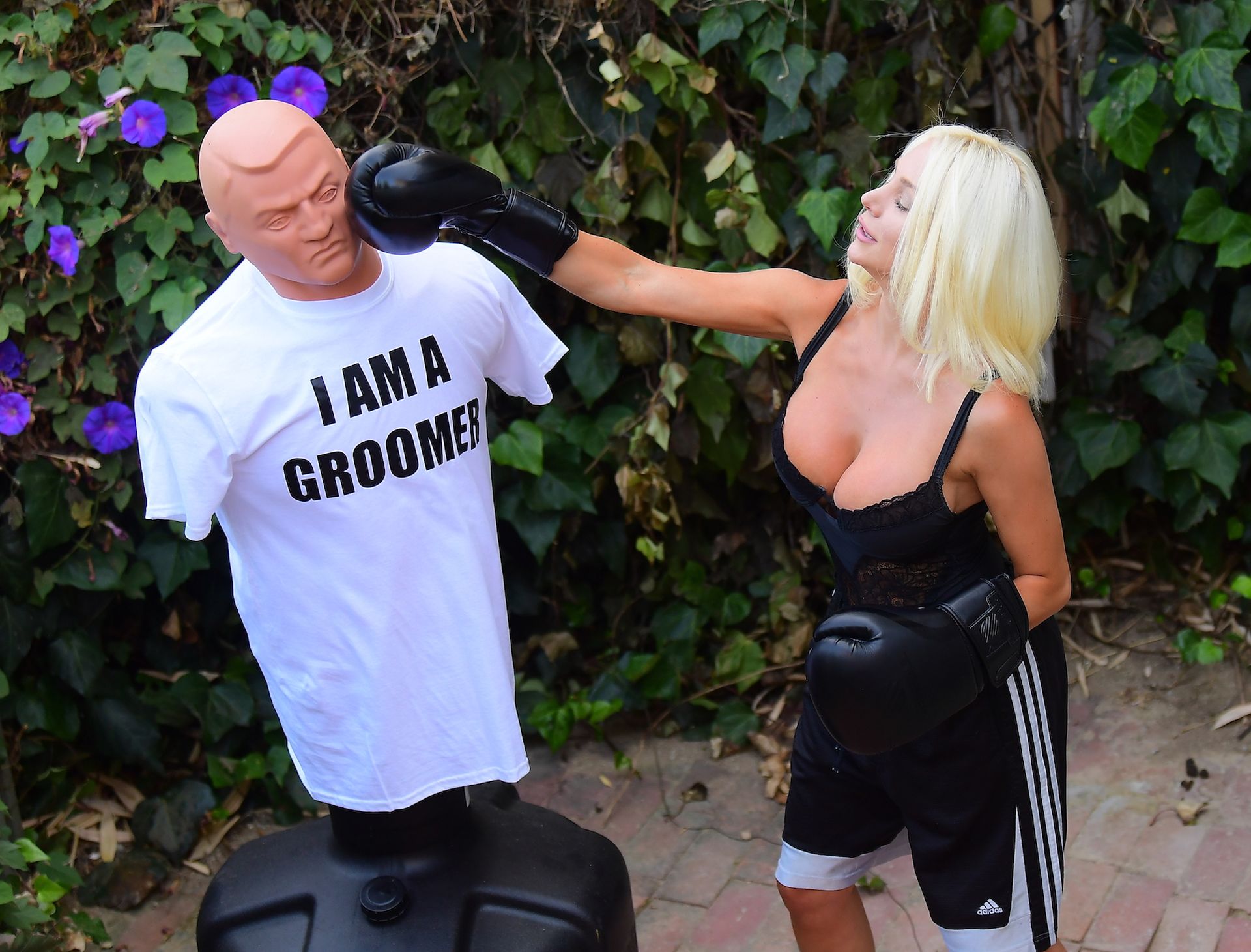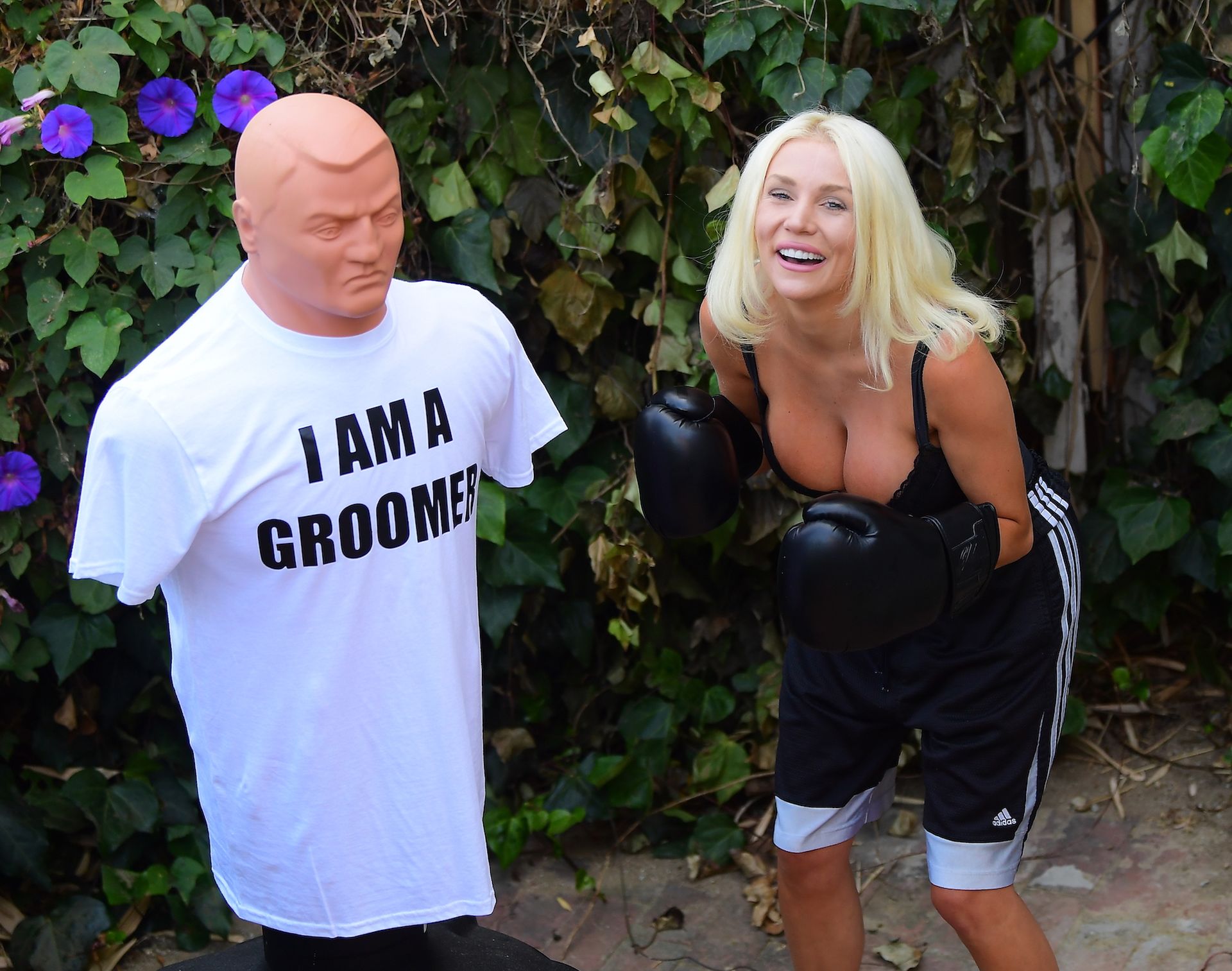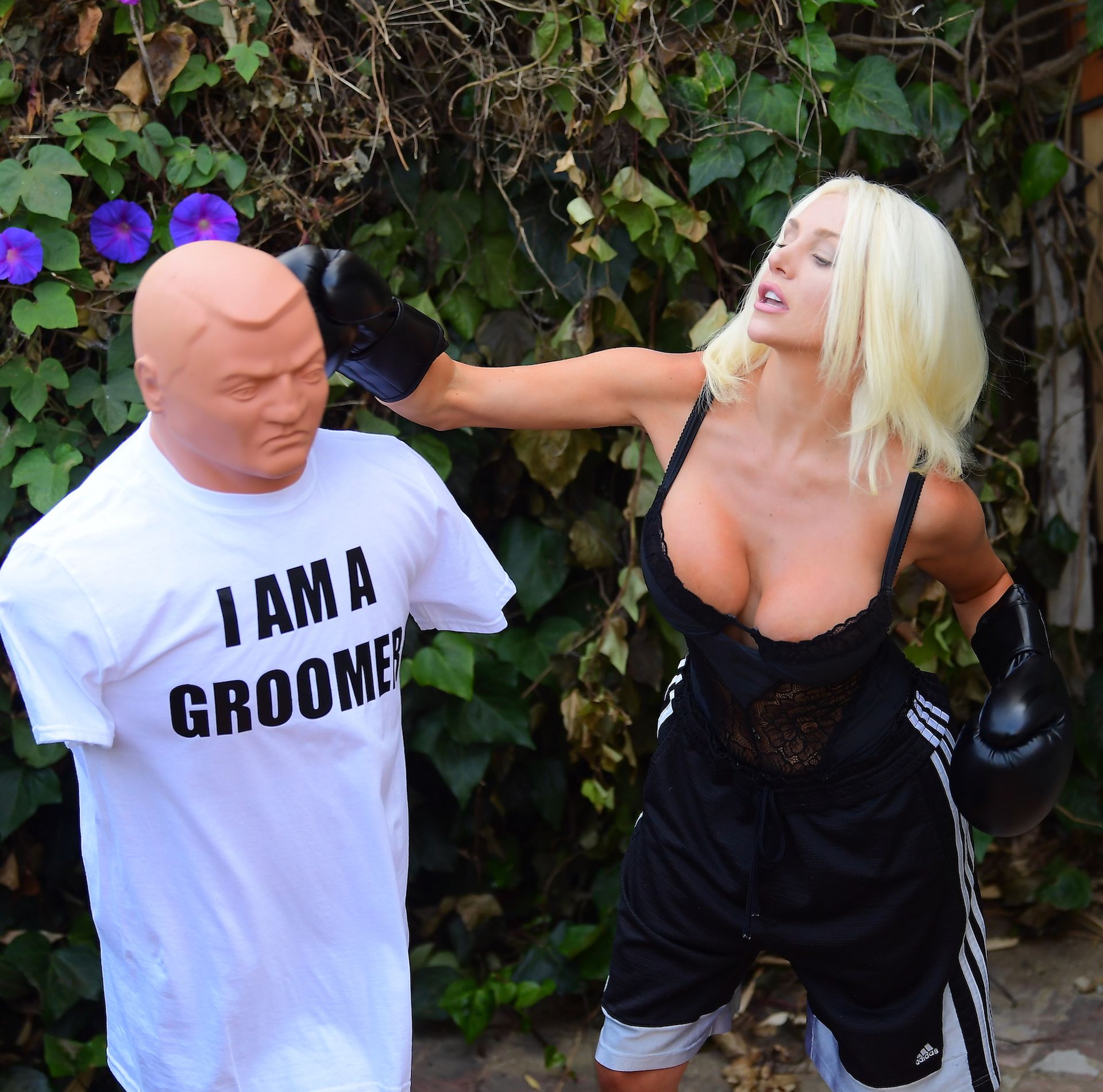 Пышногрудая модель и певица Кортни Стодден наносит удары по своему бывшему Дугу Хатчинсону, который бьет и пинает манекен в футболке с надписью «Я ГРУМЕР» в Беверли-Хиллз, 07.07.2020.
