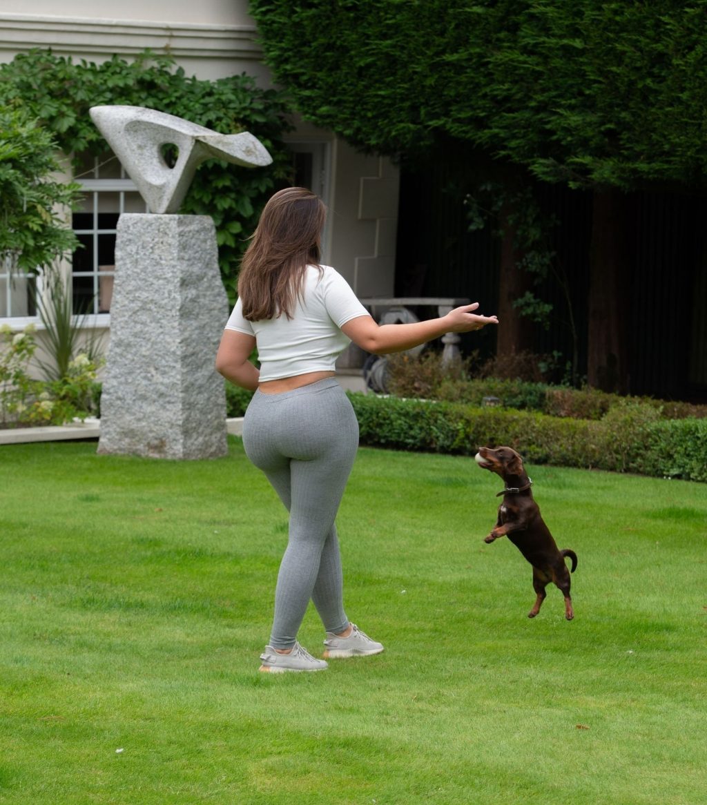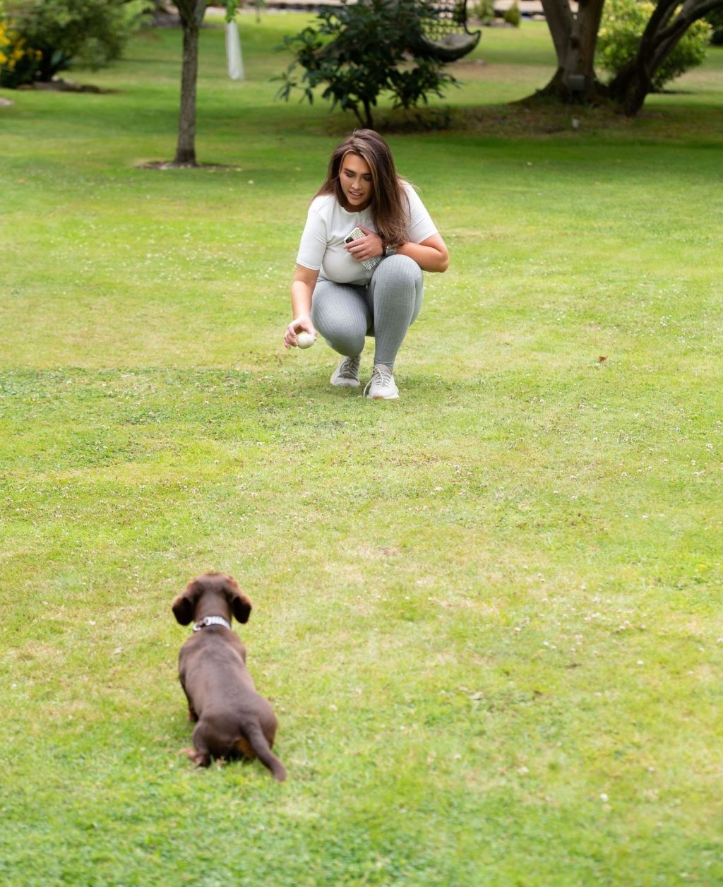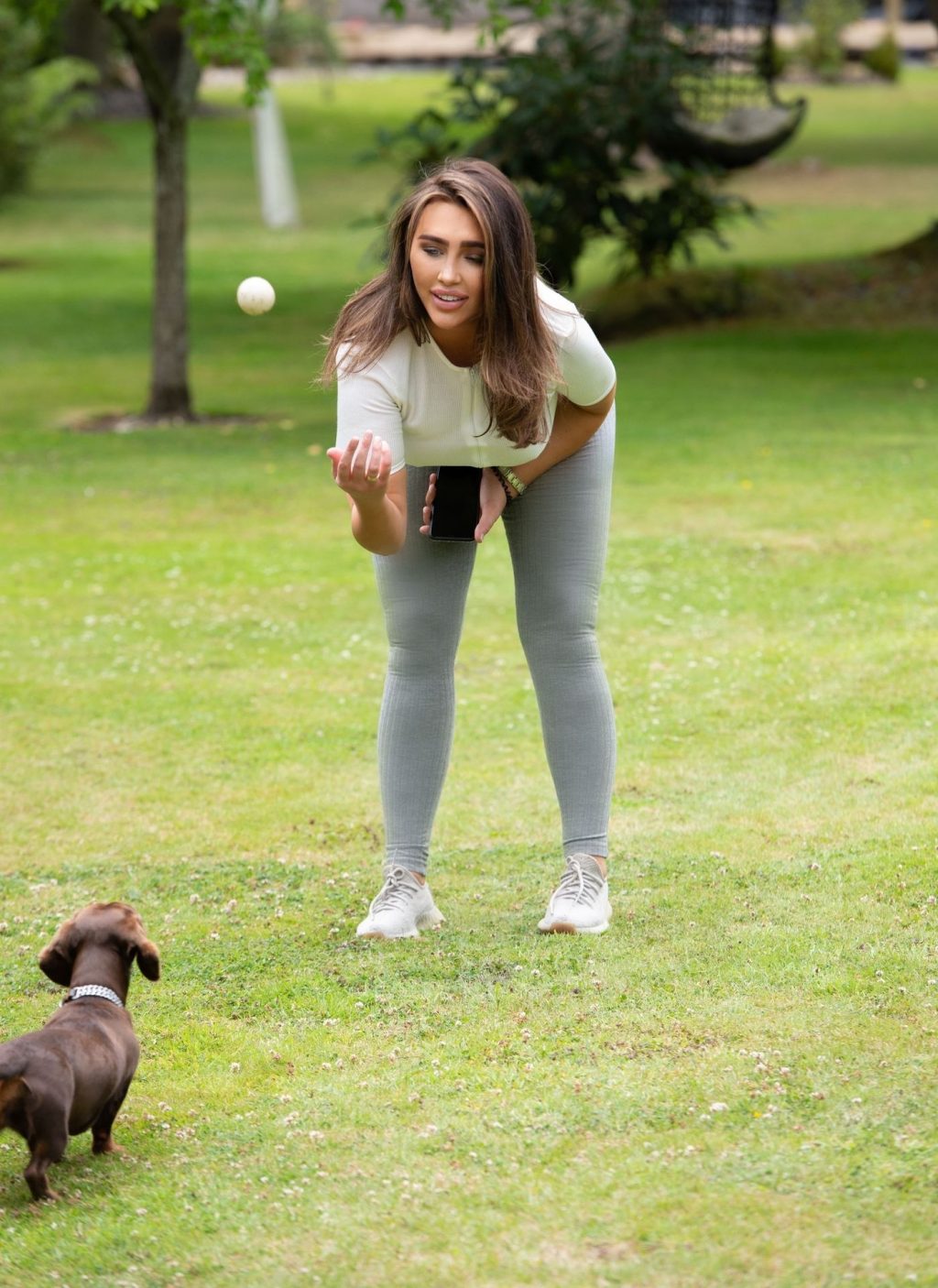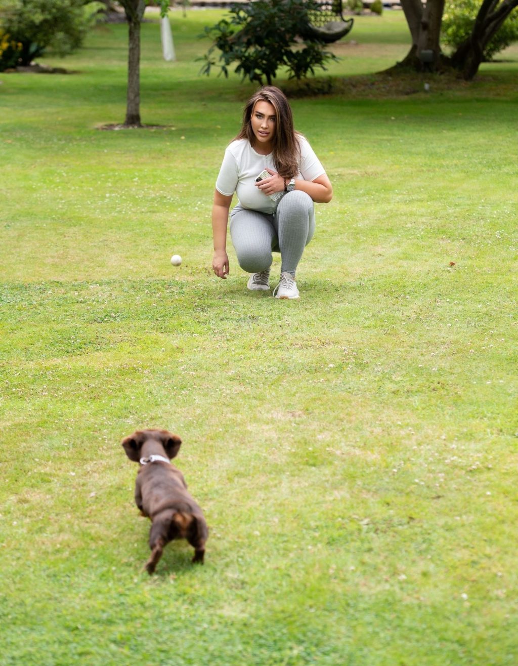 Лорен Гуджер играет с таксой в парке в Эссексе, 27.07.2020. Звезда реалити-шоу одета в спортивные штаны и белую футболку.