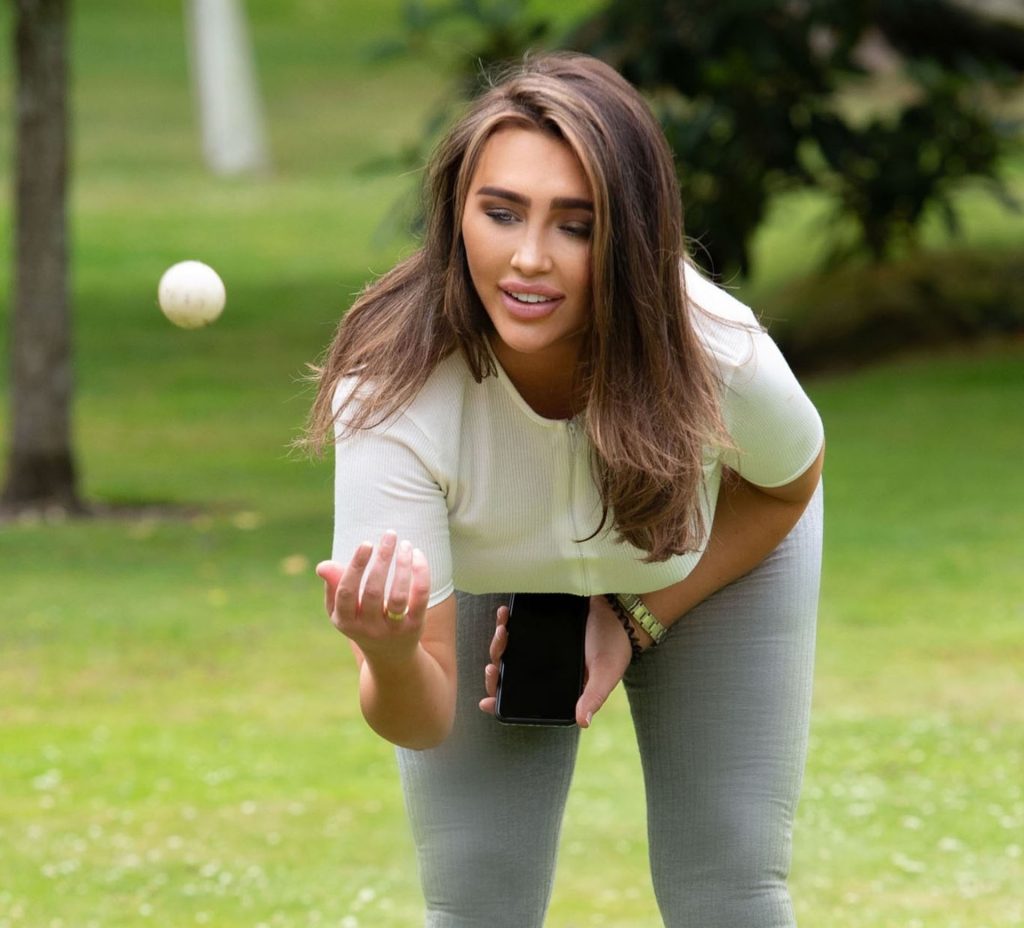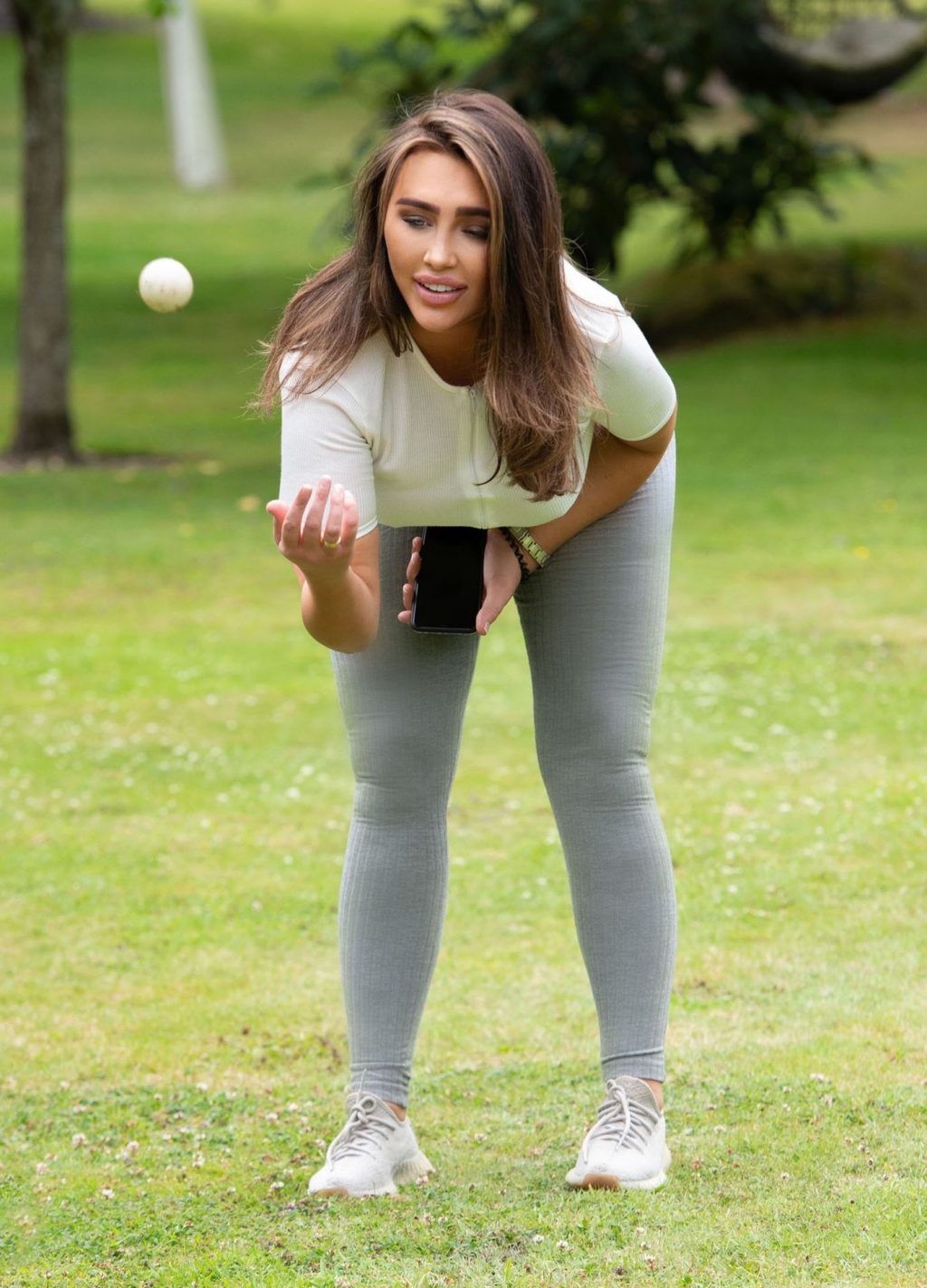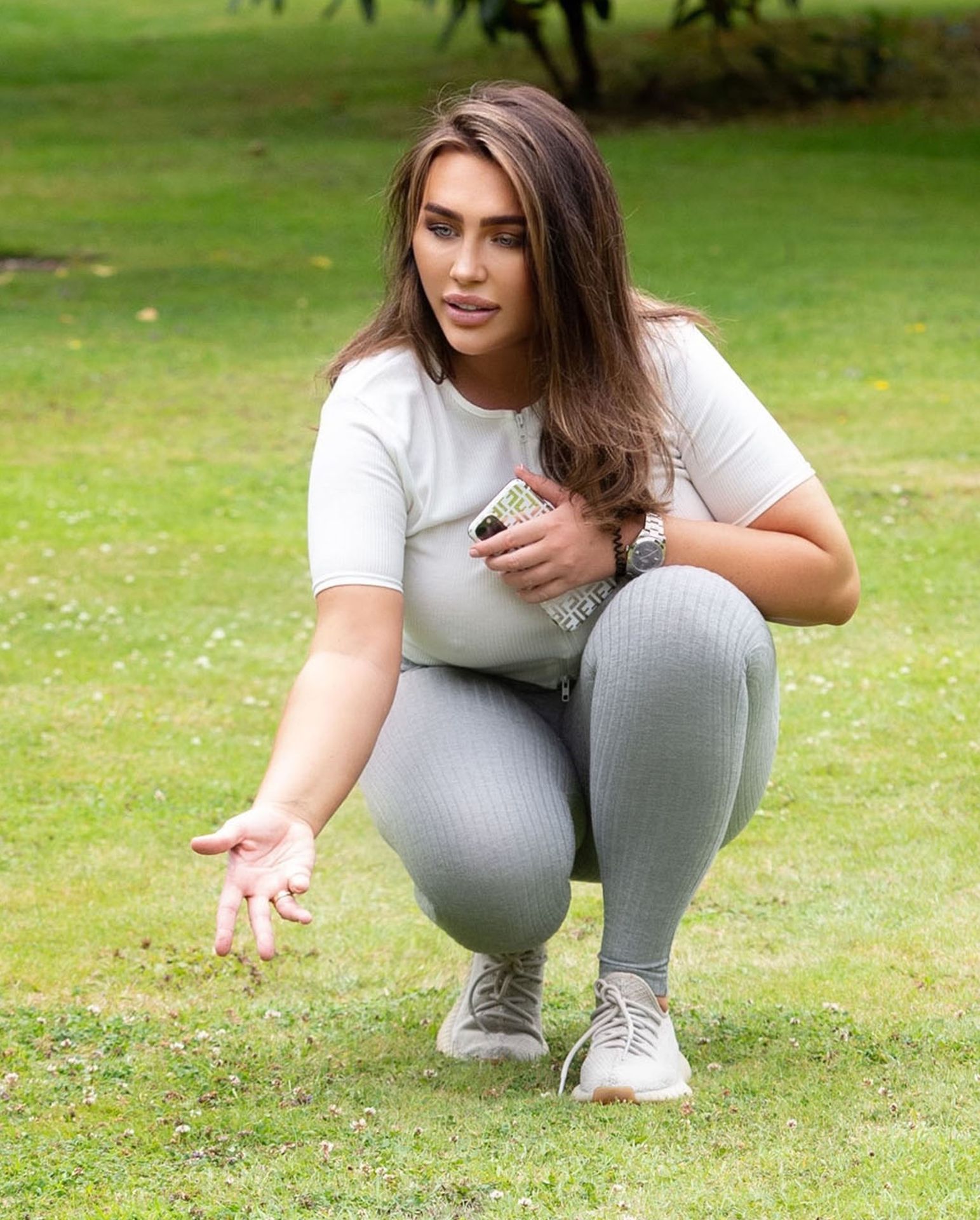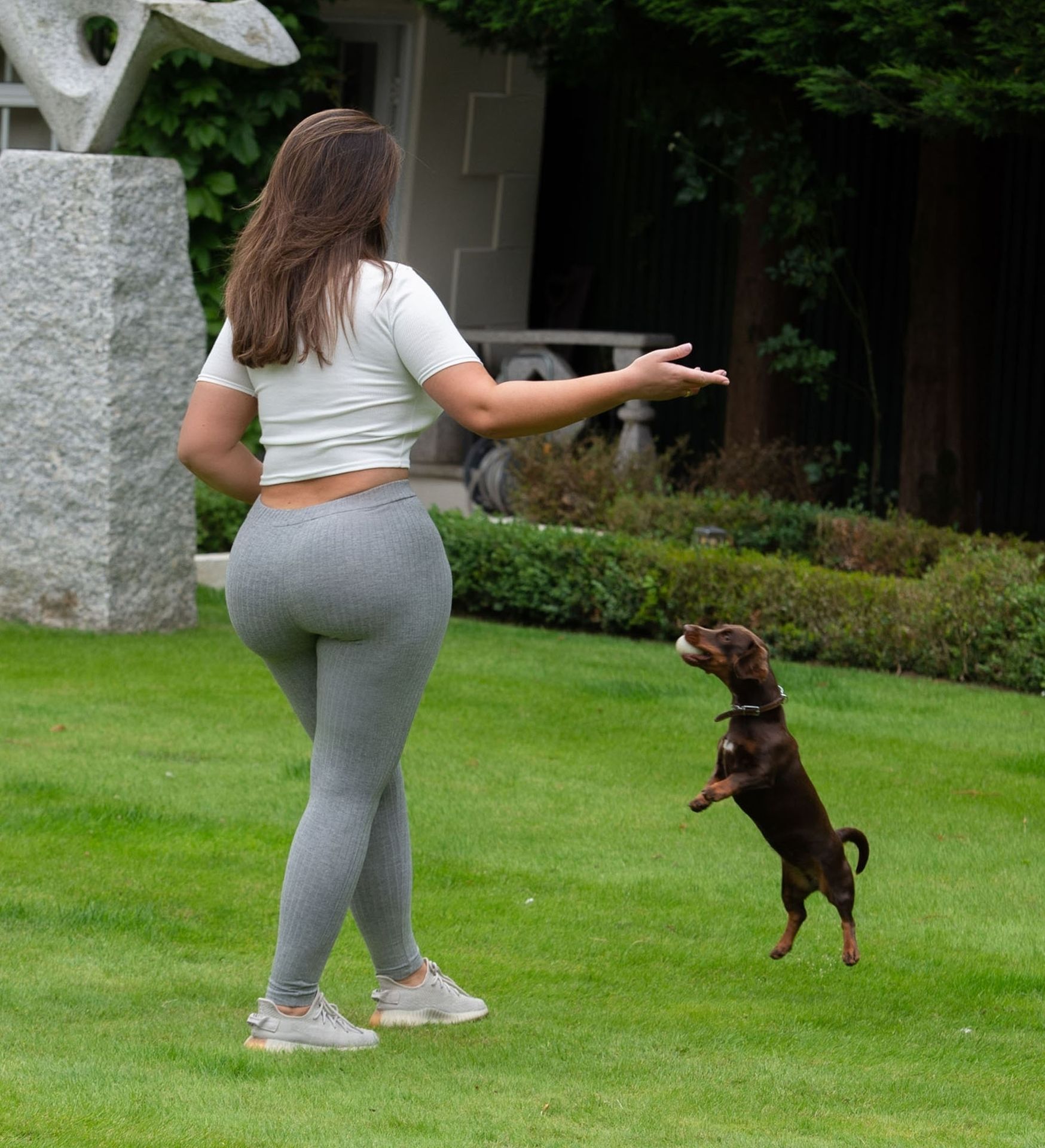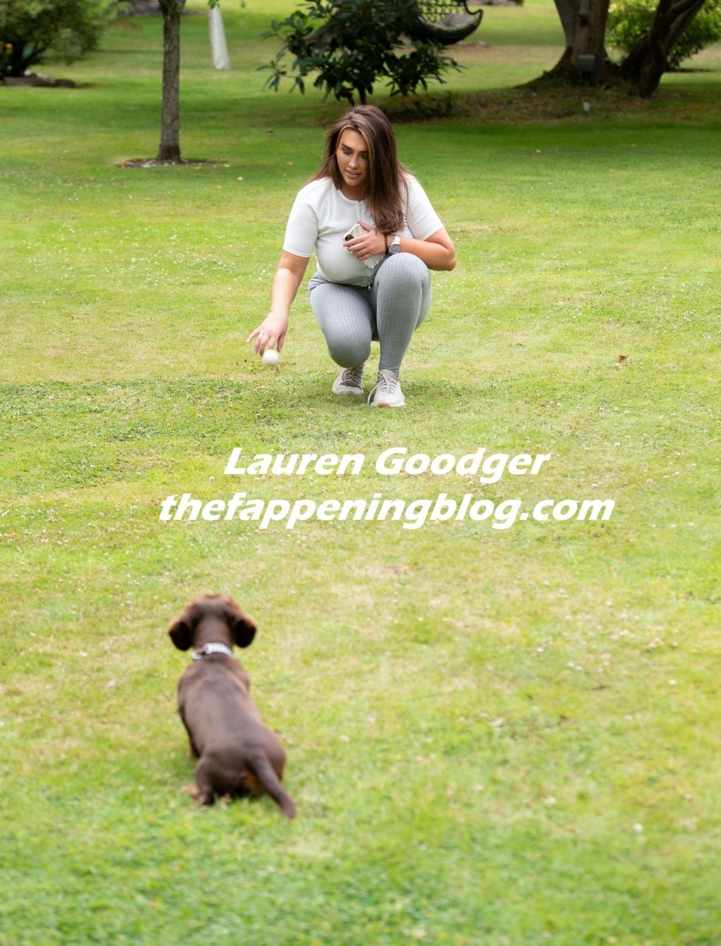 Лорен Гуджер играет с таксой в парке в Эссексе, 27.07.2020. Звезда реалити-шоу одета в спортивные штаны и белую футболку.