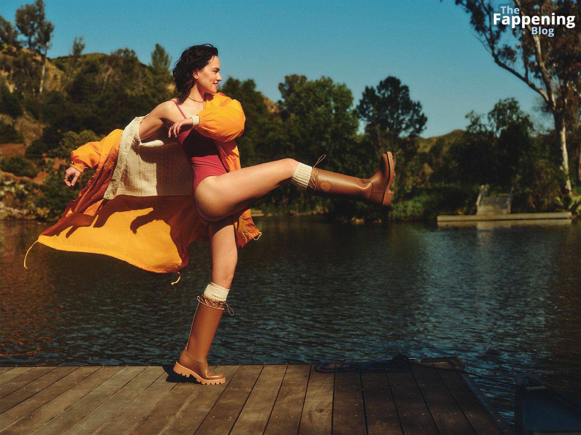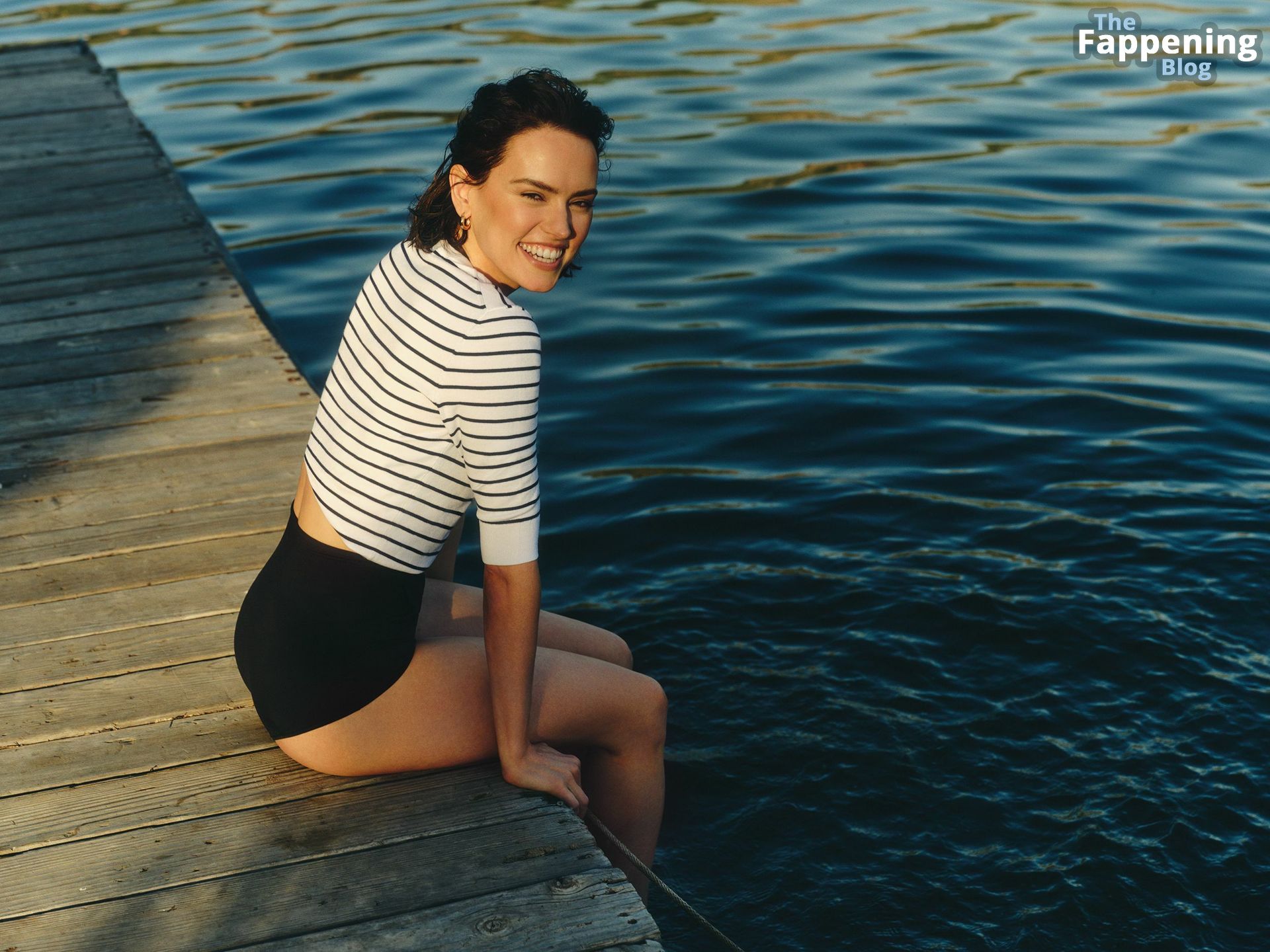 На фотосессии, проходящей на фоне живописного озера, Ридли позирует только в трусиках, ярко-оранжевом дождевике и высоких сапогах, что придает её образу расслабленный, но дерзкий вид. Её смелые позы и уверенный взгляд отражают ту силу, которую она обрела, преодолевая недавние трудности.