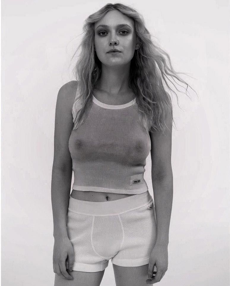 Эта девушка просто отказывается носить бюстгальтер. И не только это, кажется, что весь её гардероб состоит из тонких прозрачных рубашек. Они полностью обнажают голые груди Дакоты Фаннинг и твёрдые соски под тонкой тканью.