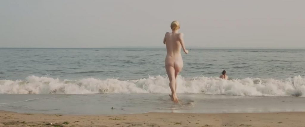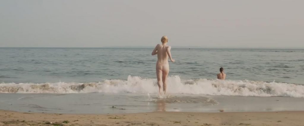 Дакота Фаннинг и Элизабет Олсен на пляже, где Элизабет топлесс, прикрывая грудь, и подбадривает Дакоту раздеться для купания нагишом. Сцена из Very Good Girls.