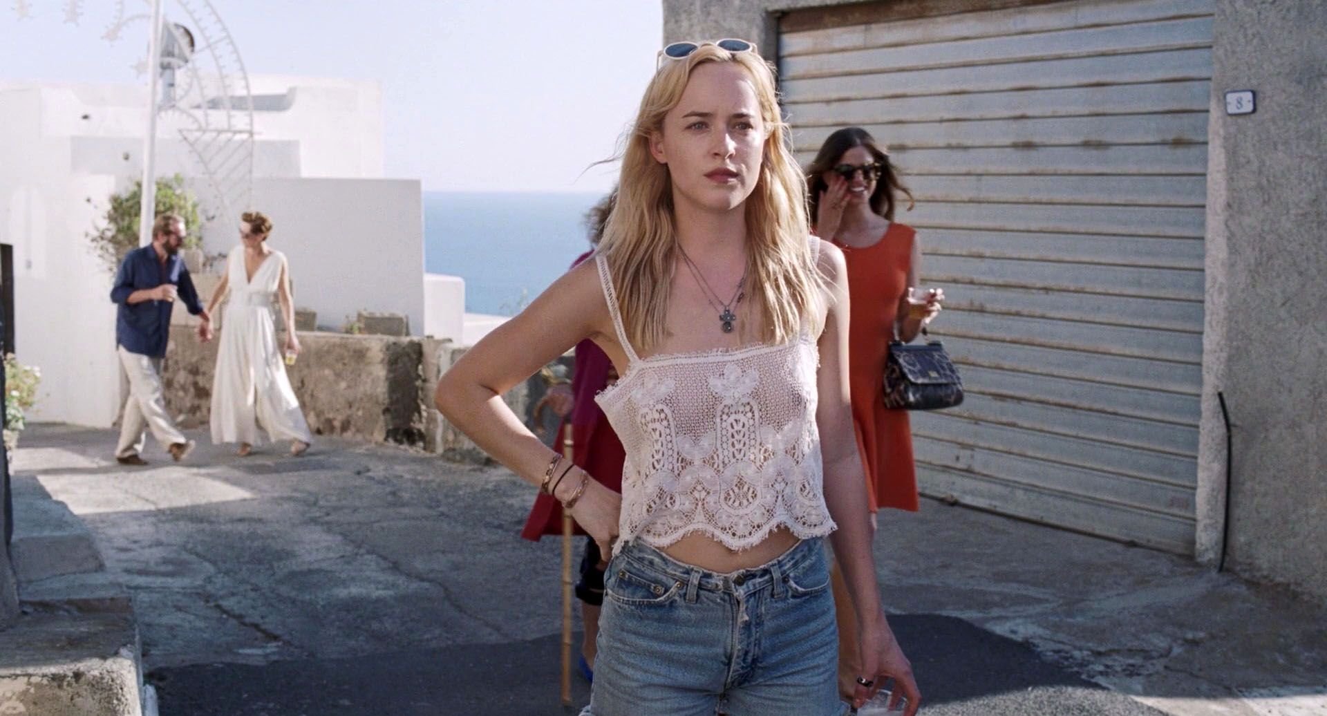 Через белый топ видны соски Дакоты Джонсон.