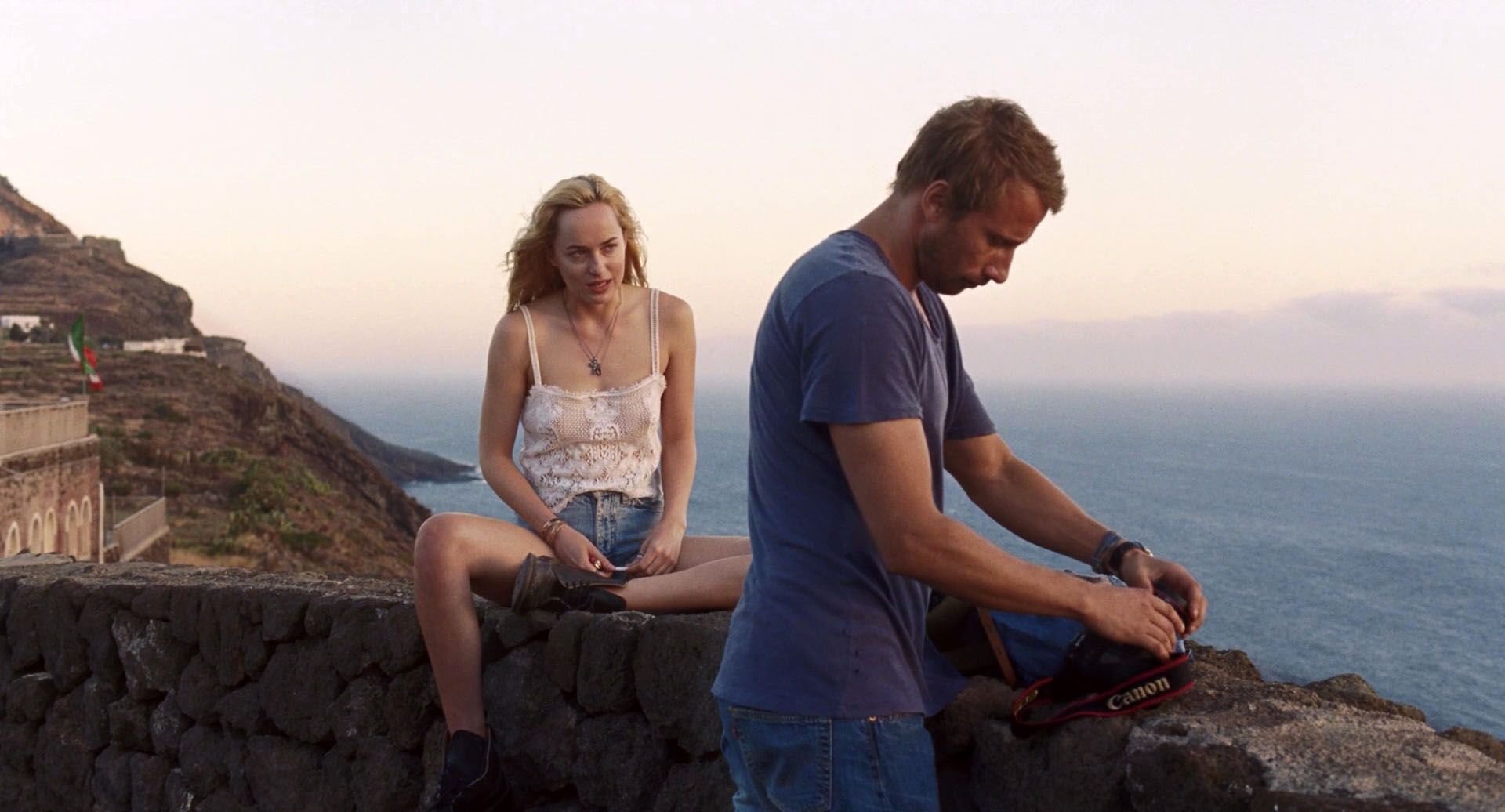Полностью обнажённая грудь и лобок Дакоты Джонсон у пруда, пытающейся соблазнить Маттиаса Шонэртса. Затем она ложится на камни.