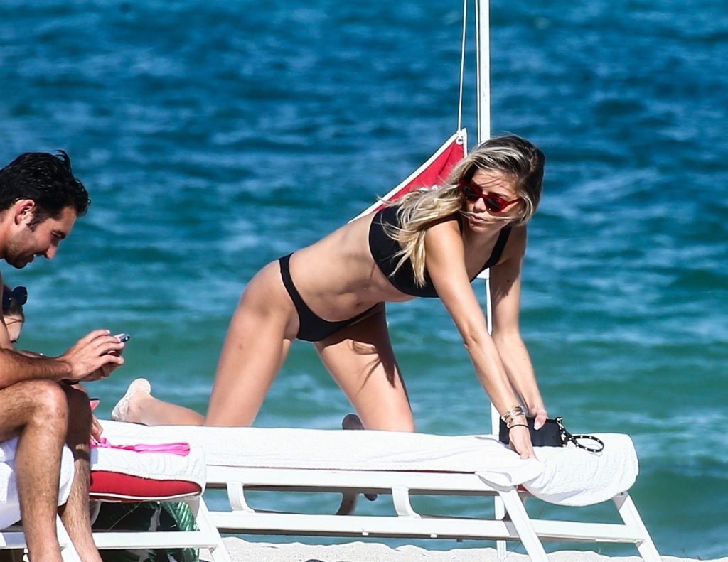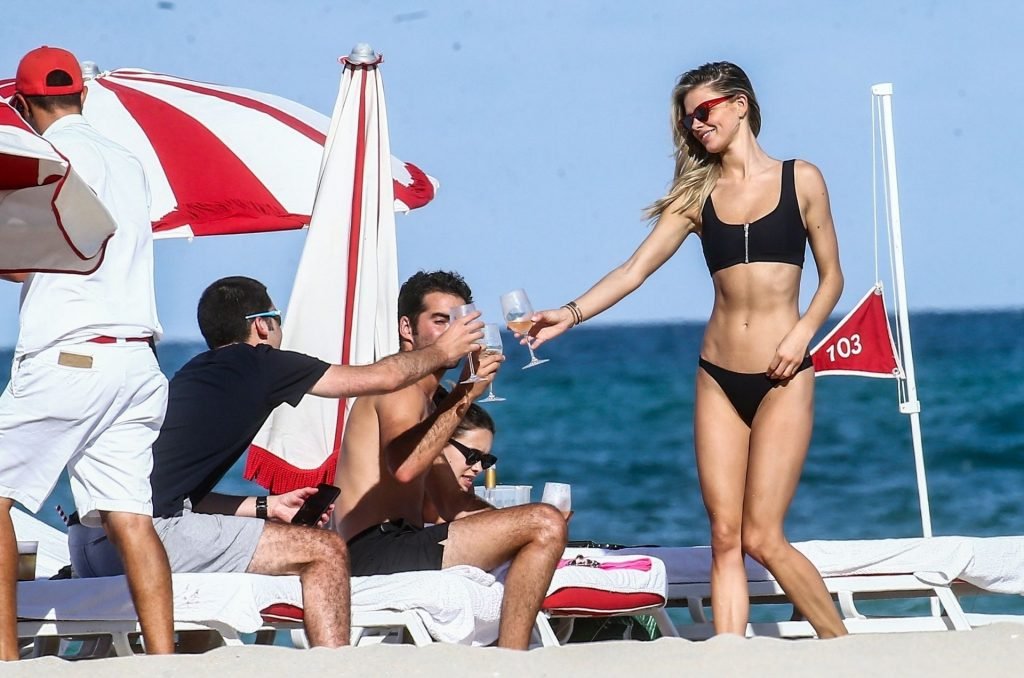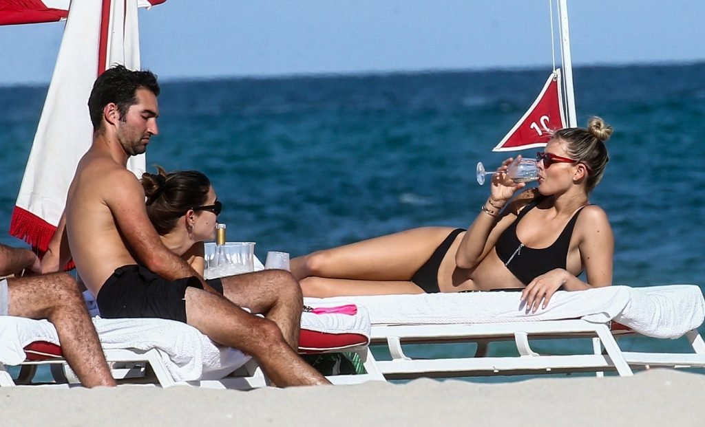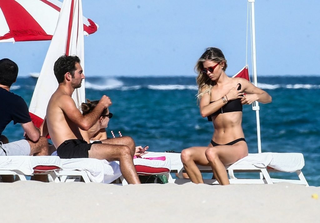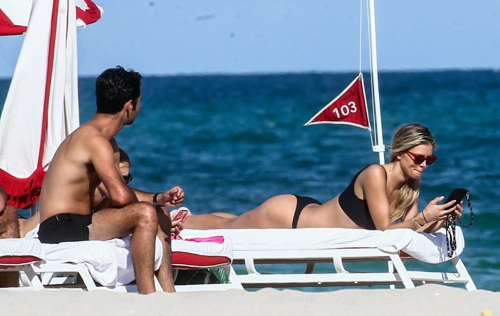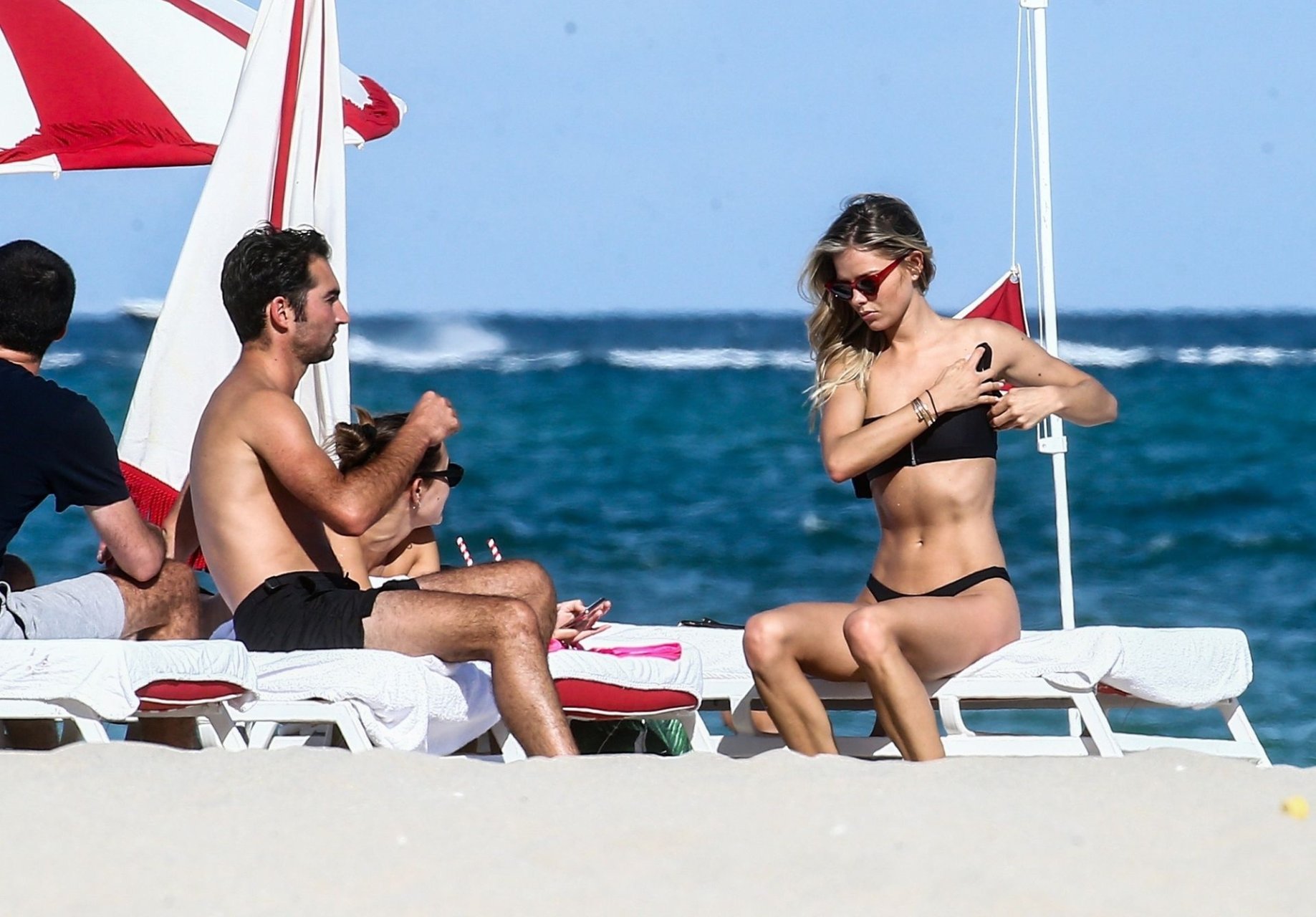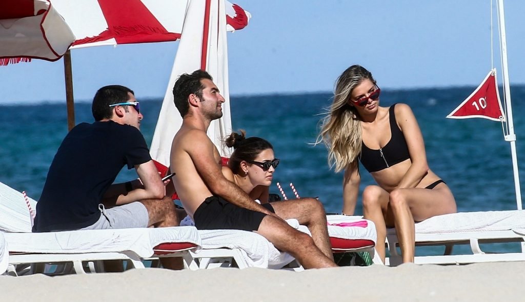 Даниэль Кнудсон наслаждается расслабляющим воскресным днем с мужским спутником на пляже Майами, 03/03/2019. Канадская модель загорала на шезлонгах, наслаждаясь прохладительными напитками.