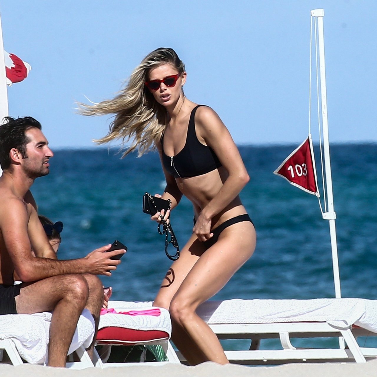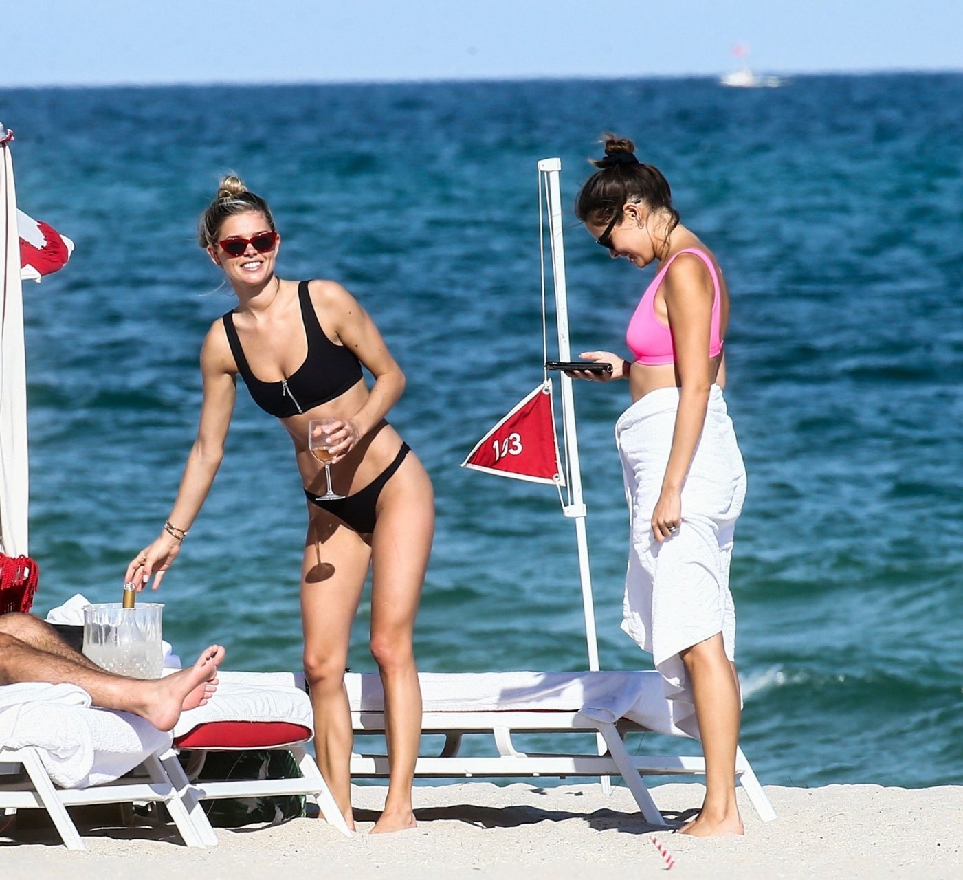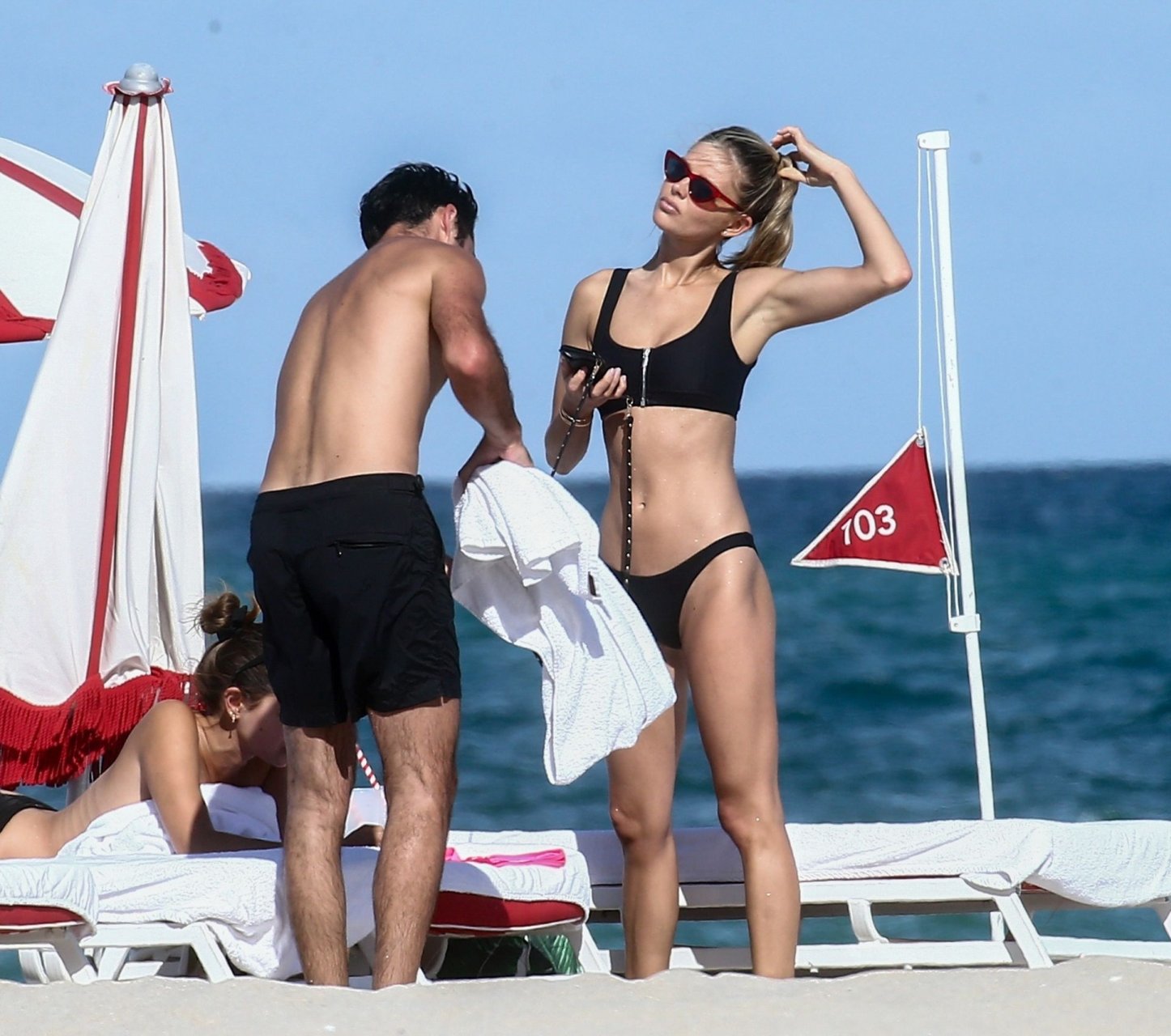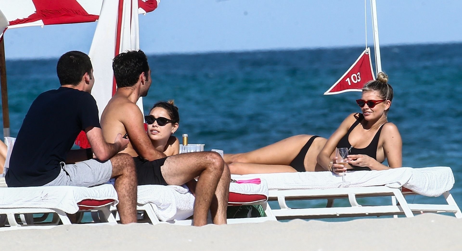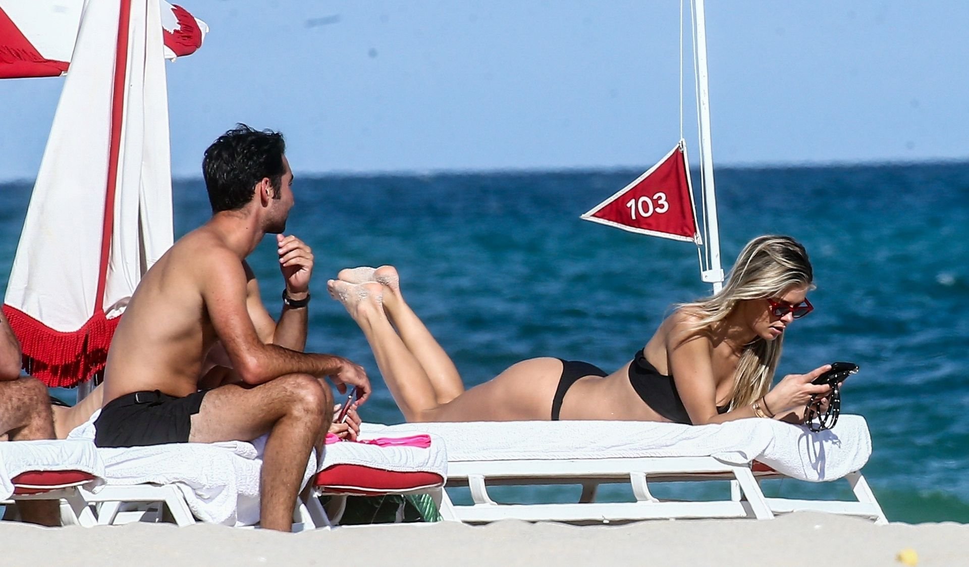 Даниэль Кнудсон наслаждается расслабляющим воскресным днем с мужским спутником на пляже Майами, 03/03/2019. Канадская модель загорала на шезлонгах, наслаждаясь прохладительными напитками.
