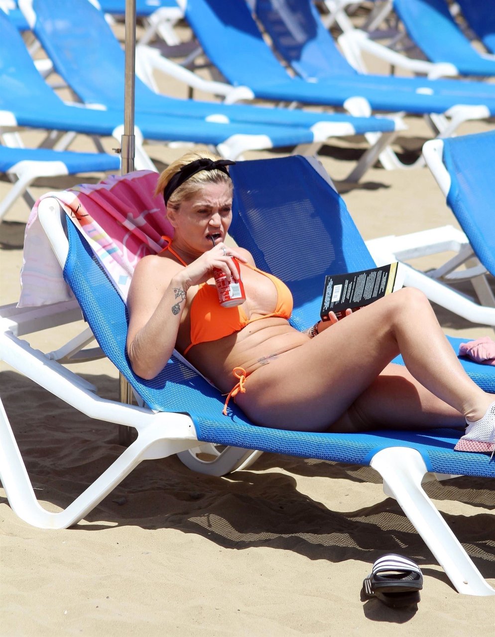 Бывшая звезда Eastenders Данниэлла Уэстбрук, 44 года, запечатлена топлес, наслаждаясь чтением ‘Самый темный час: как Черчилль вернул Англию с края пропасти’, отдыхая в оранжевом бикини на пляже в Марбелье, 01.05.2018.
