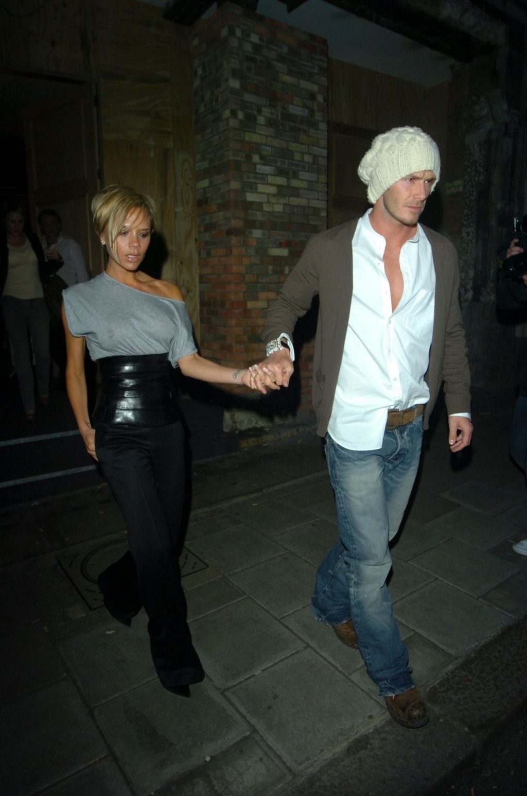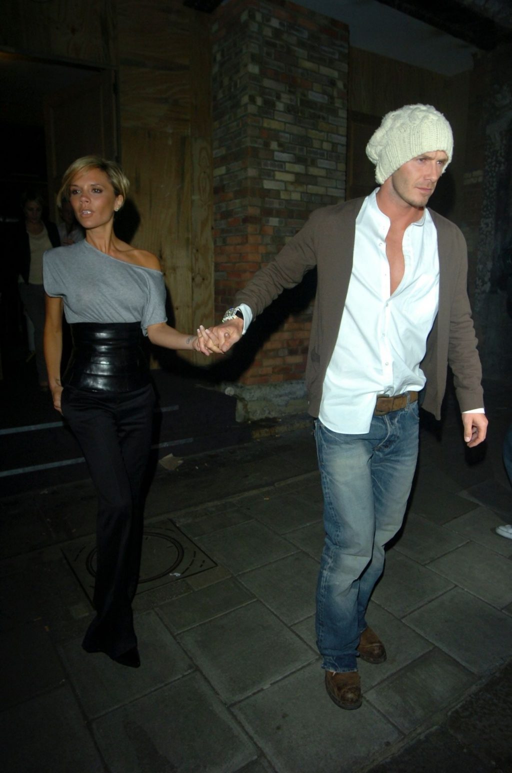 Виктория Бекхэм и Дэвид Бекхэм покидают заднюю дверь после встречи с Шоном “Дидди” Комбсом в Automat в Лондоне, 26.03.2007. Сексуальная певица продемонстрировала свои большие искусственные груди, надев серую кофту без бюстгальтера.